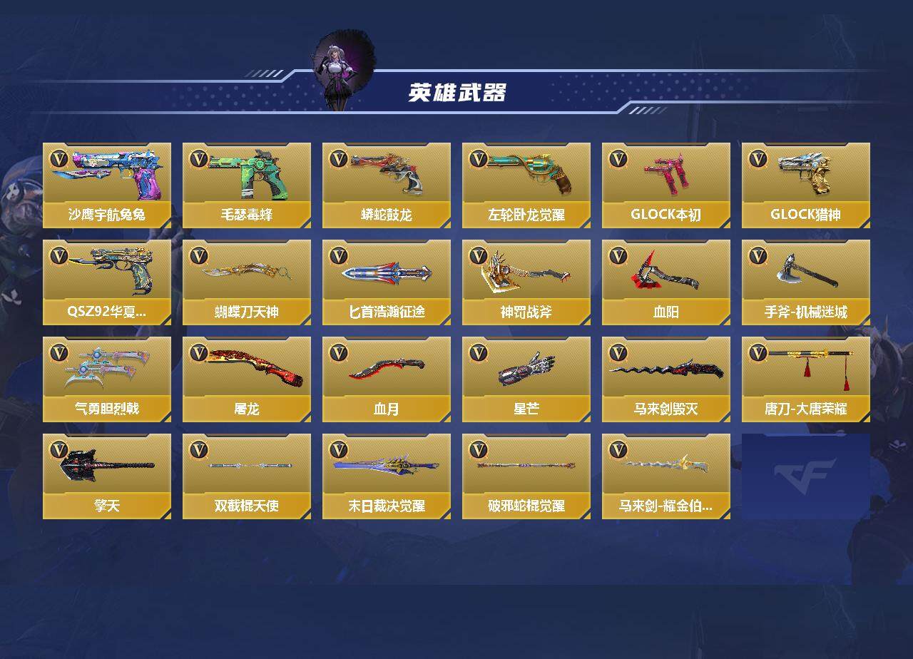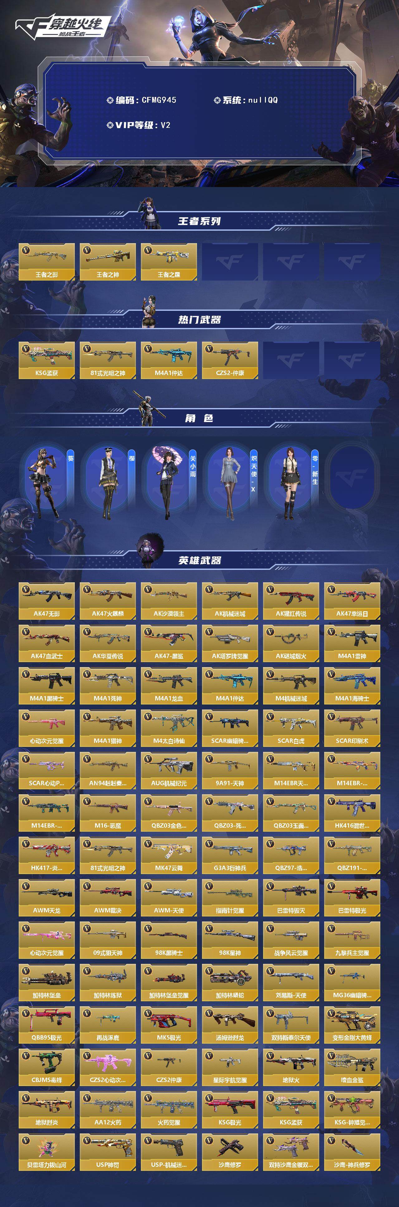 【cfmg945】vip2/171v/王者之影/王者之神/王者之霆/ksg-孟获/81式-光明之神/m4a1-仲达/czs2-仲康/葵/樱/关小雨/炽天使-x/零-新生/ak47-无影/ak47-火麒麟/ak47-沙漠领主/ak47-机械迷城/ak47-猩红传说/ak47-幸运日/ak47-血武士/ak47-华夏传说/ak47-黑鲨/ak47-塔罗牌觉醒/ak47-谜城烟火/m4a1-雷神/m4a1-黑骑士/m4a1-死神/m4a1-龙血/m4a1-机械迷城/m4a1-海骑士/m4a1-心动次元觉醒/m4a1-猎神/m4a1-太白诗仙/scar-幽暗骑士/scar light-白虎/scar-印刷术/scar-心动pick/an94-赳赳秦师/aug-机械纪元/9a91-天神/m14ebr-天神/m14ebr-拂影/m14ebr-玄武/m16-恶魔/q03-金色蔷薇/q03-死神/q03-玉面羞花/hk416-混世行者/hk417-炎龙铠甲/mk47-云舞/g3a3-衍神兵/q97-浩瀚征途/q191-封神榜/awm-天龙/awm-裁决/awm-天使/awm-指南针觉醒/芭蕾特-毁灭/芭蕾特-极光/m200-心动次元觉醒/09式狙-天神/98k-黑骑士/98k-星神/gm6-战争风云觉醒/vsk-94-九黎兵主觉醒/加特林-堡垒/加特林-炼狱/加特林-堡垒觉醒/加特林-蟒蛇/刘易斯-天使/mg36-幽暗骑士/qbb95-极光/qbb95-再战涿鹿/mk5-极光/汤姆逊-烈龙/双持斯泰尔-天使/qcw05-变形金刚·大黄蜂/cbj-ms-毒蜂/czs2-心动次元/ddm4-pdw-星际宇航觉醒/地狱火/嗜血金鲨/地狱烈炎/aa12-火药/aa12-火药觉醒/ksg-极光/ksg-钟馗觉醒/贝雷塔-力拔山河/usp-神罚/usp-机械迷城/沙鹰-修罗/双持沙鹰-金银双煞/沙鹰-神兵修罗/沙鹰-宇航兔兔/毛瑟-毒蜂/蟒蛇-鼓龙/左轮-卧龙觉醒/双持glock18-本初/glock18-猎神/qsz92-华夏传说/蝴蝶刀-天神/匕首-浩瀚征途/神罚战斧/血阳/手斧-机械迷城/气勇胆烈戟/屠龙/血月/太白诗仙扇/星芒/马来剑-毁灭/唐刀-大唐荣耀/擎天/双截棍-天使/末日裁决觉醒/破邪蛇棍觉醒/马来剑-耀金伯爵