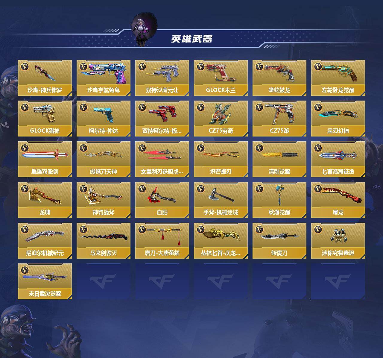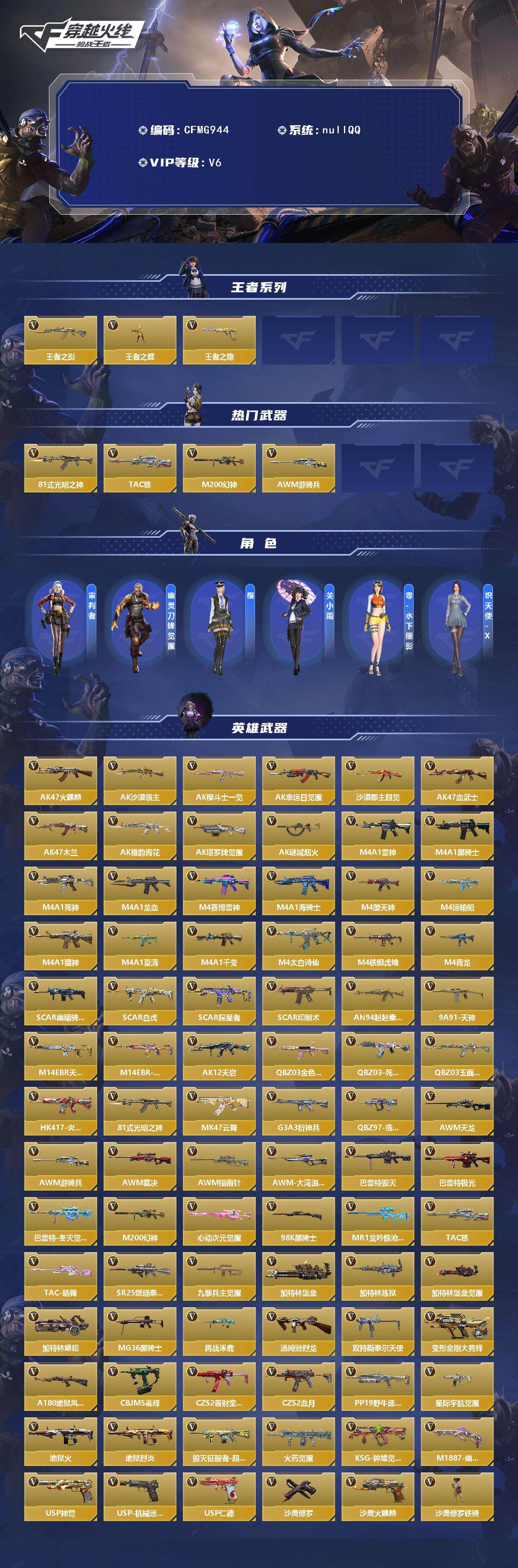 【cfmg944】vip6/232v/王者之影/王者之蝶/王者之隐/81式-光明之神/tac-慈/m200-幻神/awm-游骑兵/审判者/幽灵刀锋-觉醒/樱/关小雨/零-水下丽影/炽天使-x/ak47-火麒麟/ak47-沙漠领主/ak47-樱斗士-一觉/ak47-幸运日觉醒/ak47-沙漠郡主-超觉/ak47-血武士/ak47-木兰/ak47-雅韵青花/ak47-塔罗牌觉醒/ak47-谜城烟火