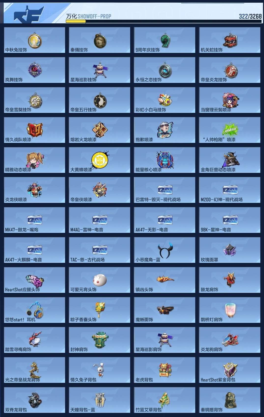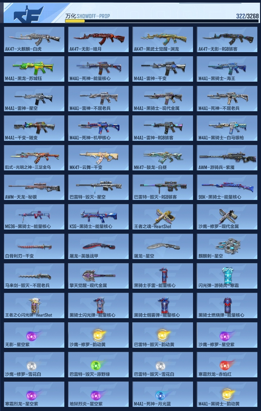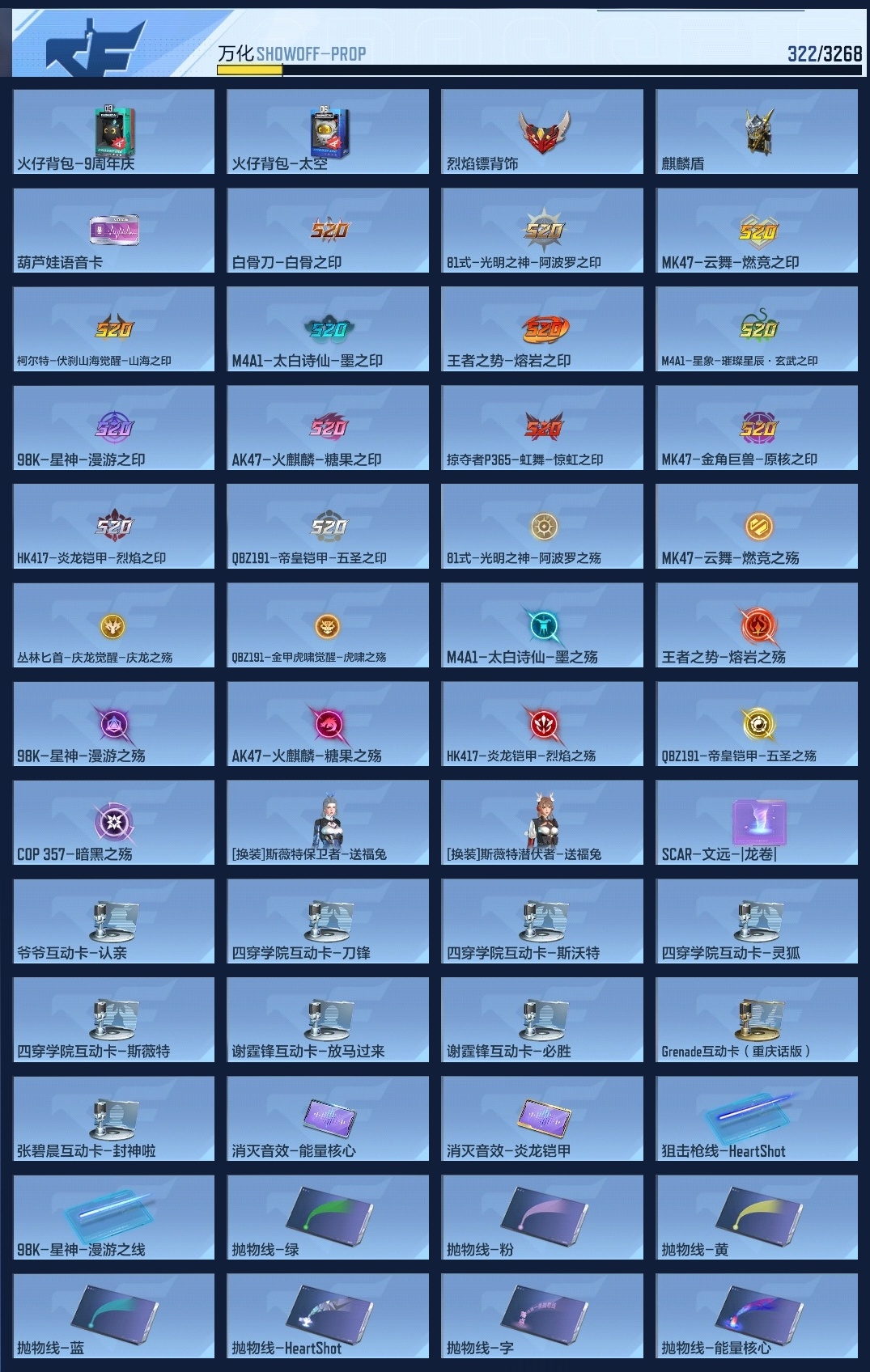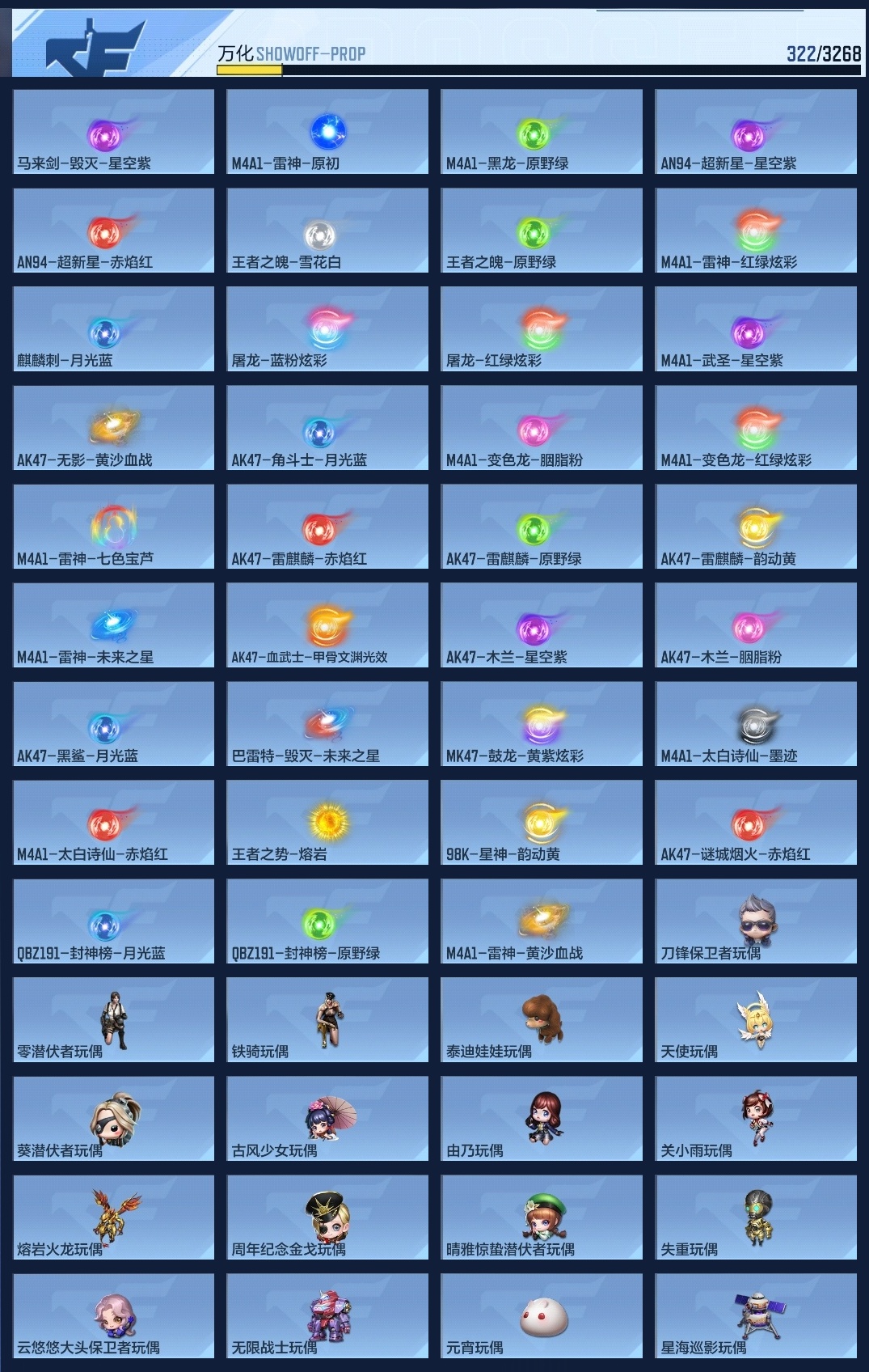 lc625104 【2王者-王幻-王影-星象-81光明之神-幻神-4cop-】 万化数量322 音效卡8 狙击呛线1 消灭音效2 语音卡1 抛物线7 音效卡:m200-幻神-现代战场,ak47-无影-电音,芭蕾特-毁灭-现代战场,mk47-鼓龙-嘴炮,m4a1-雷神-电音,ak47-火麒麟-电音,98k-星神-电音,tac-慈-古代战场; 狙击呛线:狙击呛线-heartshot; 消灭音效:消灭音效-能量核心,消灭音效-炎龙铠甲; 语音卡:葫芦娃语音卡; 抛物线:抛物线-能量核心,抛物线-字,抛物线-heartshot,抛物线-绿,抛物线-蓝,抛物线-黄,抛物线-粉;