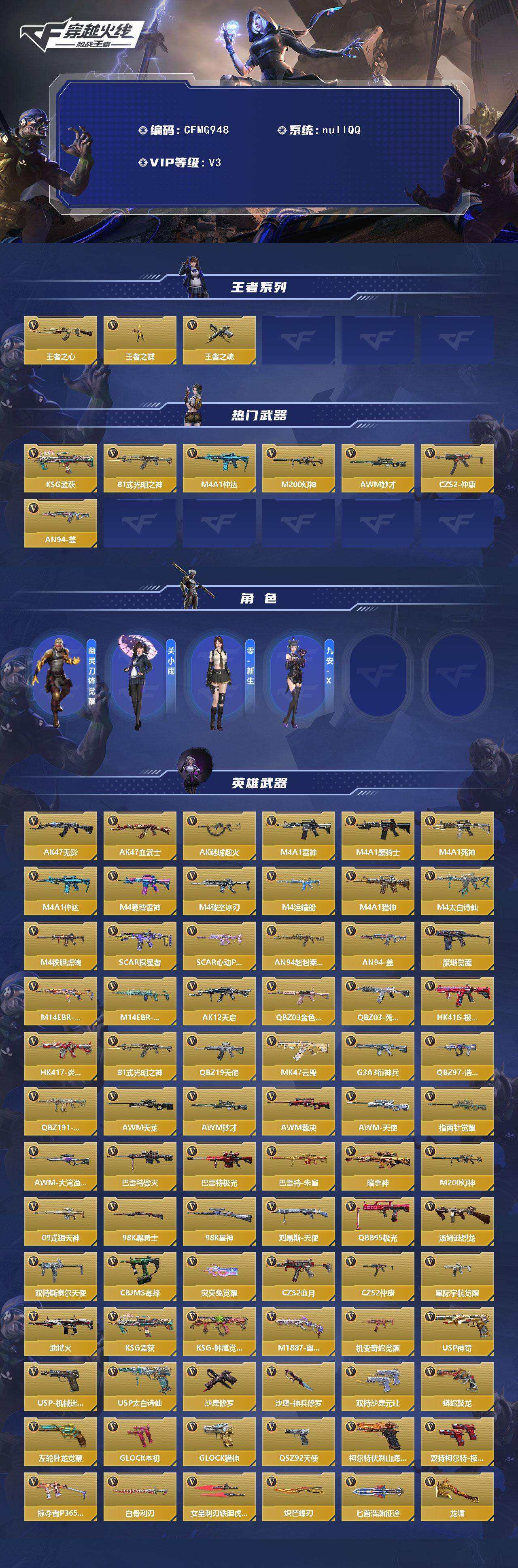 【cfmg948】vip3/216v/王者之心/王者之蝶/王者之魂/ksg-孟获/81式-光明之神/m4a1-仲达/m200-幻神/awm-妙才/czs2-仲康/an94-盖/幽灵刀锋-觉醒/关小雨/零-新生/九安-x/ak47-无影/ak47-血武士/ak47-谜城烟火/m4a1-雷神/m4a1-黑骑士/m4a1-死神/m4a1-赛博雷神/m4a1-破空兵刃/m4a1-运输船/m4a1-猎神