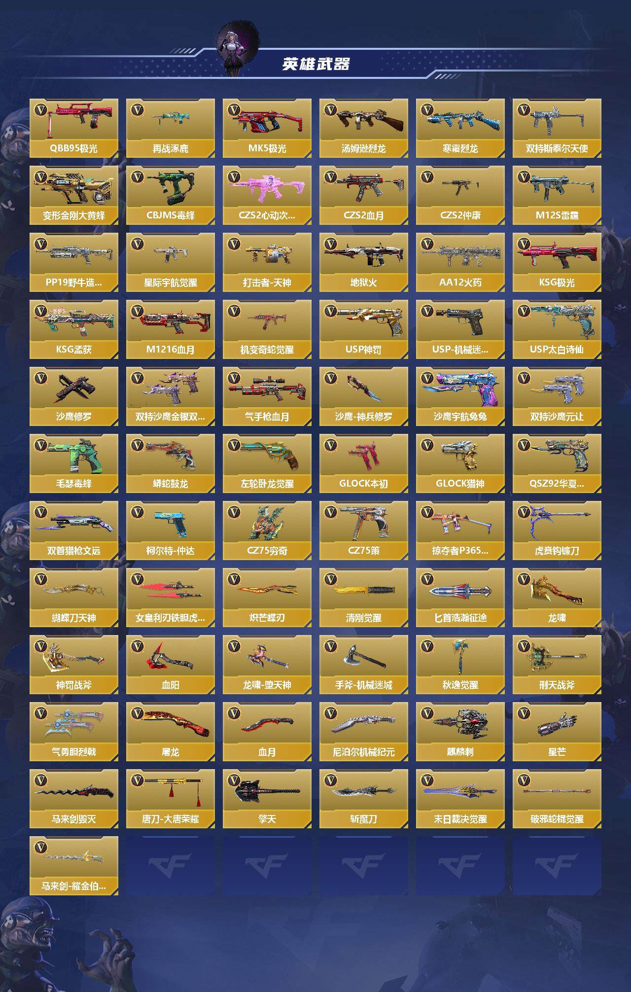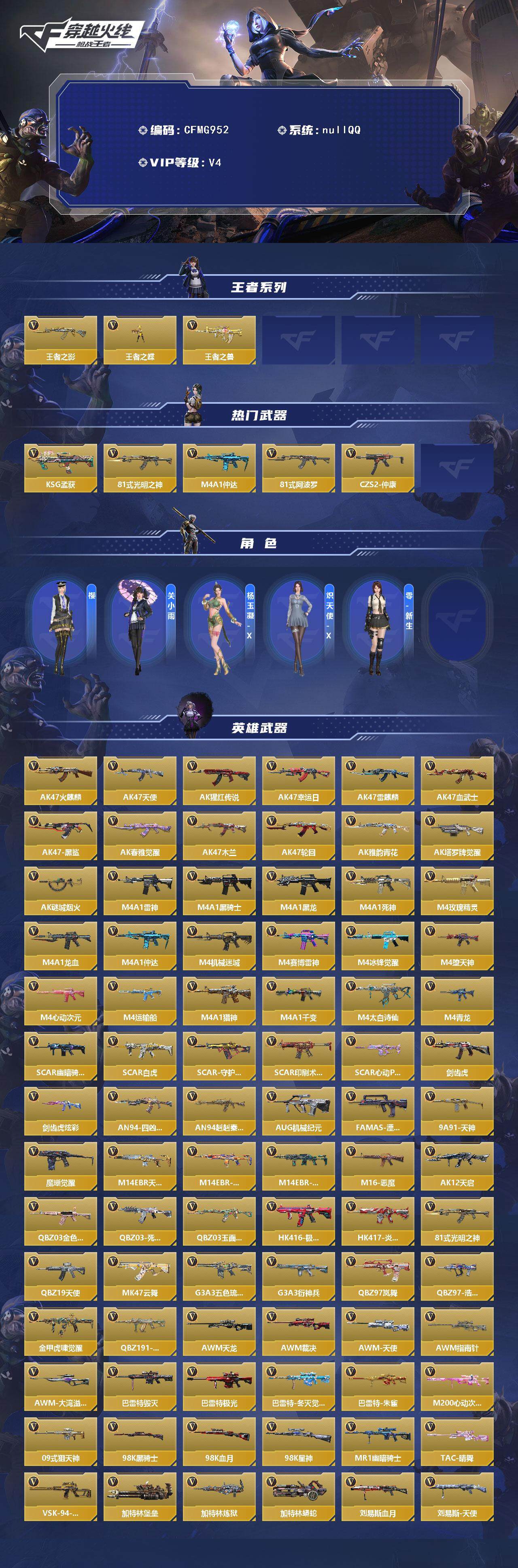 【cfmg952】vip4/324v/3王者/王者之影/王者之蝶/王者之兽/ksg-孟获/81式-光明之神/m4a1-仲达/81式-阿波罗/czs2-仲康/樱/关小雨/杨玉凝-x/炽天使-x/零-新生/ak47-火麒麟/ak47-天使/ak47-猩红传说/ak47-幸运日/ak47-雷麒麟/ak47-血武士/ak47-黑鲨/ak47-春雅觉醒/ak47-木兰/ak47-轮回/ak47-雅韵青花