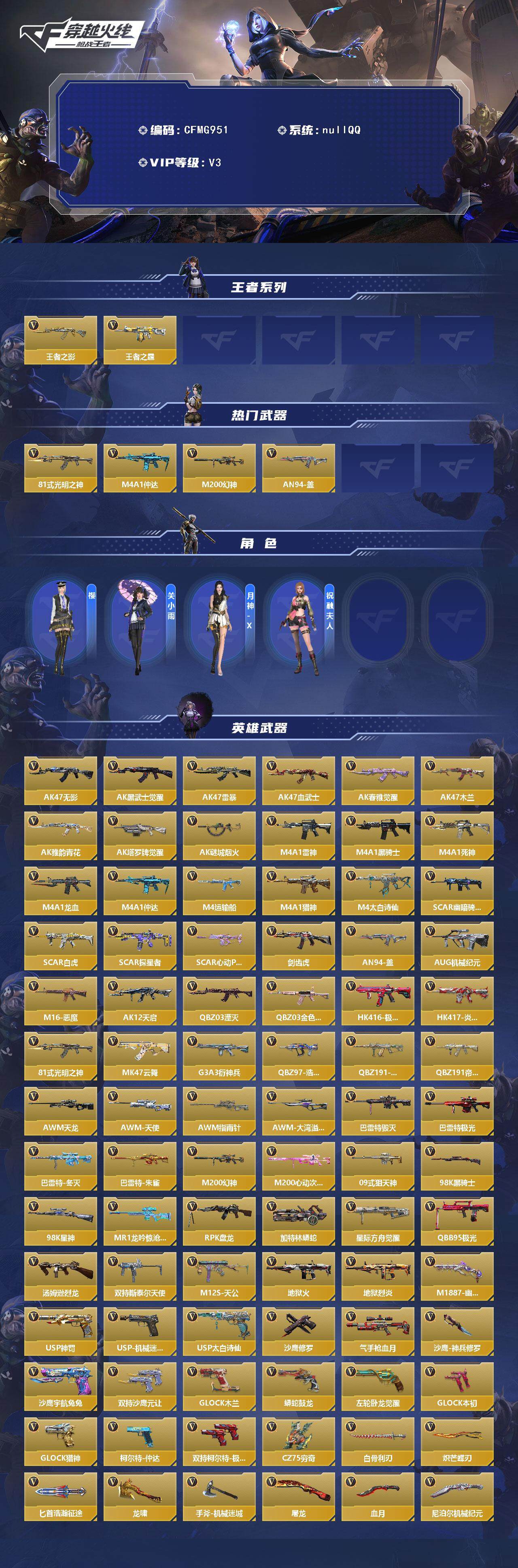 【cfmg951】vip3/201v/2王者/王者之影/王者之霆/81式-光明之神/m4a1-仲达/m200-幻神/an94-盖/樱/关小雨/月神-x/祝融夫人/ak47-无影/ak47-黑武士觉醒/ak47-雷暴/ak47-血武士/ak47-春雅觉醒/ak47-木兰/ak47-雅韵青花/ak47-塔罗牌觉醒/ak47-谜城烟火/m4a1-雷神/m4a1-黑骑士/m4a1-死神/m4a1-龙血/m4a1-运输船/m4a1-猎神/m4a1-太白诗仙/scar-幽暗骑士/scar light-白虎/scar-探星者/scar-心动pick/剑齿虎/aug-机械纪元/m16-恶魔/ak12-天启/q03-湮灭/q03-金色蔷薇/hk416-极光/hk417-炎龙铠甲/mk47-云舞/g3a3-衍神兵/q97-浩瀚征途/q191-封神榜/q191-帝皇铠甲/awm-天龙/awm-天使/awm-指南针/awm-大湾溢彩/芭蕾特-毁灭/芭蕾特-极光/芭蕾特-冬灭/芭蕾特-朱雀/m200-心动次元/09式狙-天神/98k-黑骑士/98k-星神/mr1-龙吟惊沧海/rpk-盘龙/加特林-蟒蛇/刘易斯-星际方舟觉醒/qbb95-极光/汤姆逊-烈龙/双持斯泰尔-天使/m12s-天公/地狱火/地狱烈炎/m1887-幽冥玄喵觉醒/usp-神罚/usp-机械迷城/usp-太白诗仙/沙鹰-修罗/气手呛-血月/沙鹰-神兵修罗/沙鹰-宇航兔兔/双持沙鹰-元让/改装glock-木兰/蟒蛇-鼓龙/左轮-卧龙觉醒/双持glock18-本初/glock18-猎神/柯尔特-仲达/双持柯尔特-极光/cz75-穷奇/白骨利刃/炽芒蝶刃/匕首-浩瀚征途/龙啸/手斧-机械迷城/屠龙/血月/尼泊尔-机械纪元/龙鳞-觉醒/太白诗仙扇/麒麟刺/星芒/马来剑-毁灭/唐刀-华夏传说/方天画戟/唐刀-大唐荣耀/破邪蛇棍觉醒/马来剑-耀金伯爵