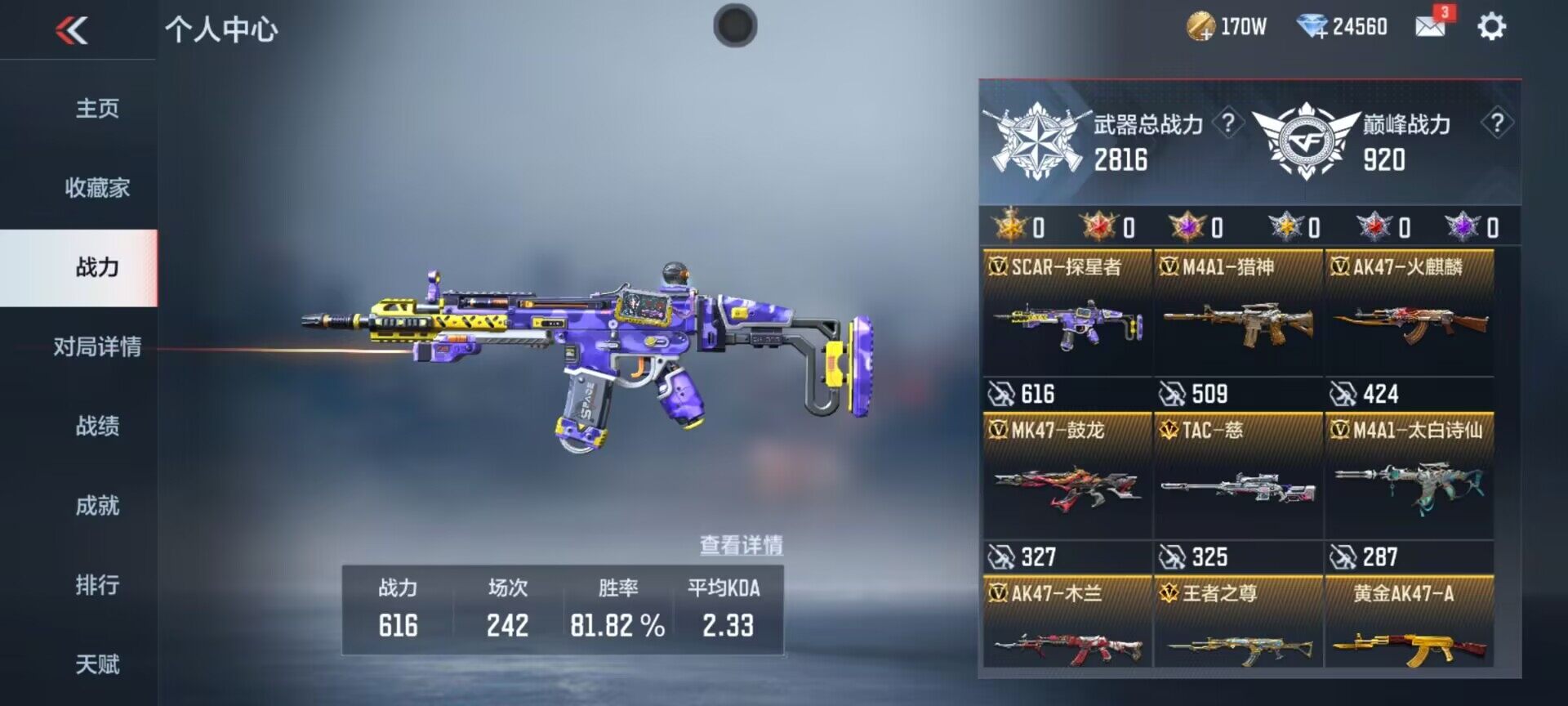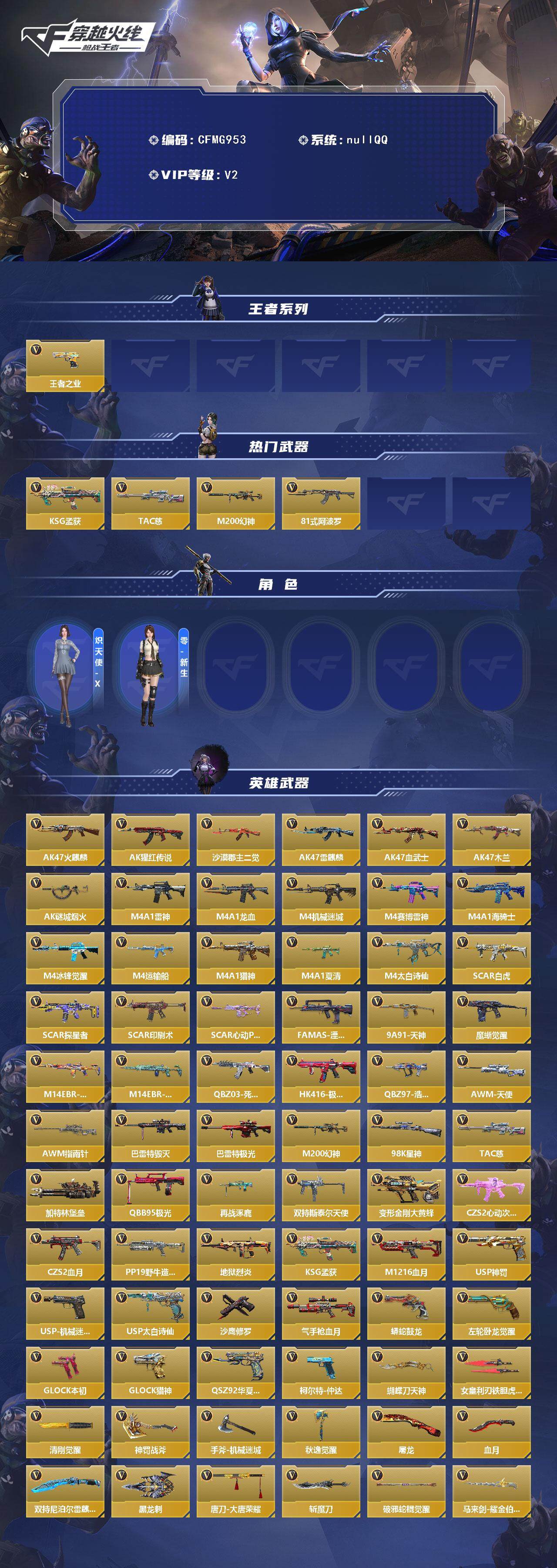 【cfmg953】vip2/177v/1王者/王者之业/ksg-孟获/tac-慈/m200-幻神/81式-阿波罗/炽天使-x/零-新生/ak47-火麒麟/ak47-猩红传说/ak47-沙漠郡主-二觉/ak47-雷麒麟/ak47-血武士/ak47-木兰/ak47-谜城烟火/m4a1-雷神/m4a1-龙血/m4a1-机械迷城/m4a1-赛博雷神/m4a1-海骑士/m4a1-冰锋觉醒/m4a1-运输船/m4a1-猎神/m4a1-夏清/m4a1-太白诗仙/scar light-白虎/scar-探星者/scar-印刷术/scar-心动pick/famas-湮灭/9a91-天神/9a91-魔蜥觉醒/m14ebr-拂影/m14ebr-葫芦山庄/q03-死神/hk416-极光/q97-浩瀚征途/awm-天使/awm-指南针/芭蕾特-毁灭/芭蕾特-极光/98k-星神/加特林-堡垒/qbb95-极光/qbb95-再战涿鹿/双持斯泰尔-天使/qcw05-变形金刚·大黄蜂/czs2-心动次元/czs2-血月/pp19野牛-造纸术/地狱烈炎/m1216-血月/usp-神罚/usp-机械迷城/usp-太白诗仙/沙鹰-修罗/气手呛-血月/蟒蛇-鼓龙/左轮-卧龙觉醒/双持glock18-本初/glock18-猎神/qsz92-华夏传说/柯尔特-仲达/蝴蝶刀-天神/女皇利刃-铁胆虎魄/清刚-觉醒/神罚战斧/手斧-机械迷城/秋逸觉醒/屠龙/血月/双持尼泊尔-雷麒麟/龙鳞-觉醒/黑龙刺/唐刀-华夏传说/唐刀-大唐荣耀/斩魔刀/破邪蛇棍觉醒/马来剑-耀金伯爵