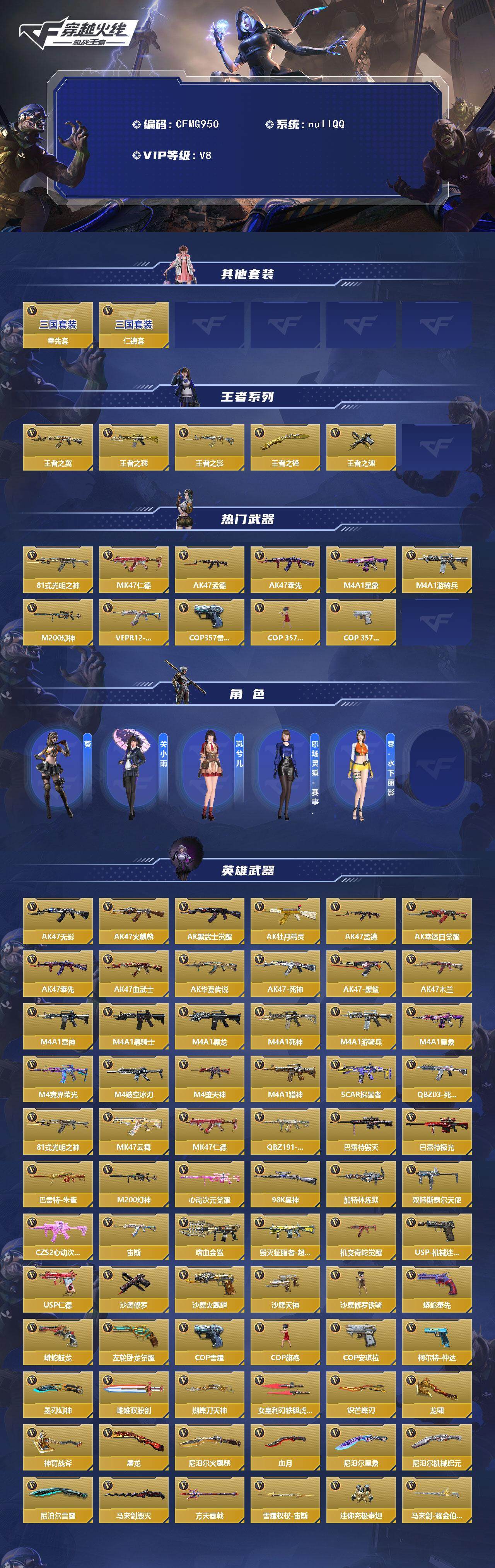 【cfmg950】vip8/137v/5王者/奉先套/仁德套/王者之翼/王者之戮/王者之影/王者之锋/王者之魂/81式-光明之神/mk47-仁德/ak47-孟德/ak47-奉先/m4a1-星象/m4a1-游骑兵/m200-幻神/vepr12-宙斯/cop 357-雷霆/cop 357-旗袍/cop 357-安琪拉/葵/关小雨/岚兮儿/职场灵狐-赛事经理/零-水下丽影/ak47-无影/ak47-火麒麟/ak47-黑武士觉醒/ak47-牡丹精灵/ak47-幸运日觉醒/ak47-血武士/ak47-华夏传说/ak47-死神/ak47-黑鲨/ak47-木兰/m4a1-雷神/m4a1-黑骑士/m4a1-黑龙/m4a1-死神/m4a1-竞界荣光/m4a1-破空冰刃/m4a1-堕天神/m4a1-猎神/scar-探星者/q03-死神/mk47-云舞/q191-封神榜/芭蕾特-毁灭/芭蕾特-极光/芭蕾特-朱雀/m200-心动次元觉醒/98k-星神/加特林-炼狱/双持斯泰尔-天使/czs2-心动次元/嗜血金鲨/毁灭征服者-超越max/igin12-机变奇蛇觉醒/usp-机械迷城/usp-仁德/沙鹰-修罗/沙鹰-火麒麟/沙鹰-天神/沙鹰-修罗-铁骑/蟒蛇-奉先/蟒蛇-鼓龙/左轮-卧龙觉醒/柯尔特-仲达/墨刃-幻神/雌雄双股剑/蝴蝶刀-天神/女皇利刃-铁胆虎魄/炽芒蝶刃/龙啸/神罚战斧/屠龙/尼泊尔-火麒麟/血月/尼泊尔-星象/尼泊尔-机械纪元/尼泊尔-雷霆/龙鳞-觉醒/马来剑-毁灭/方天画戟/雷霆权杖-宙斯/迷你究极泰坦/马来剑-耀金伯爵