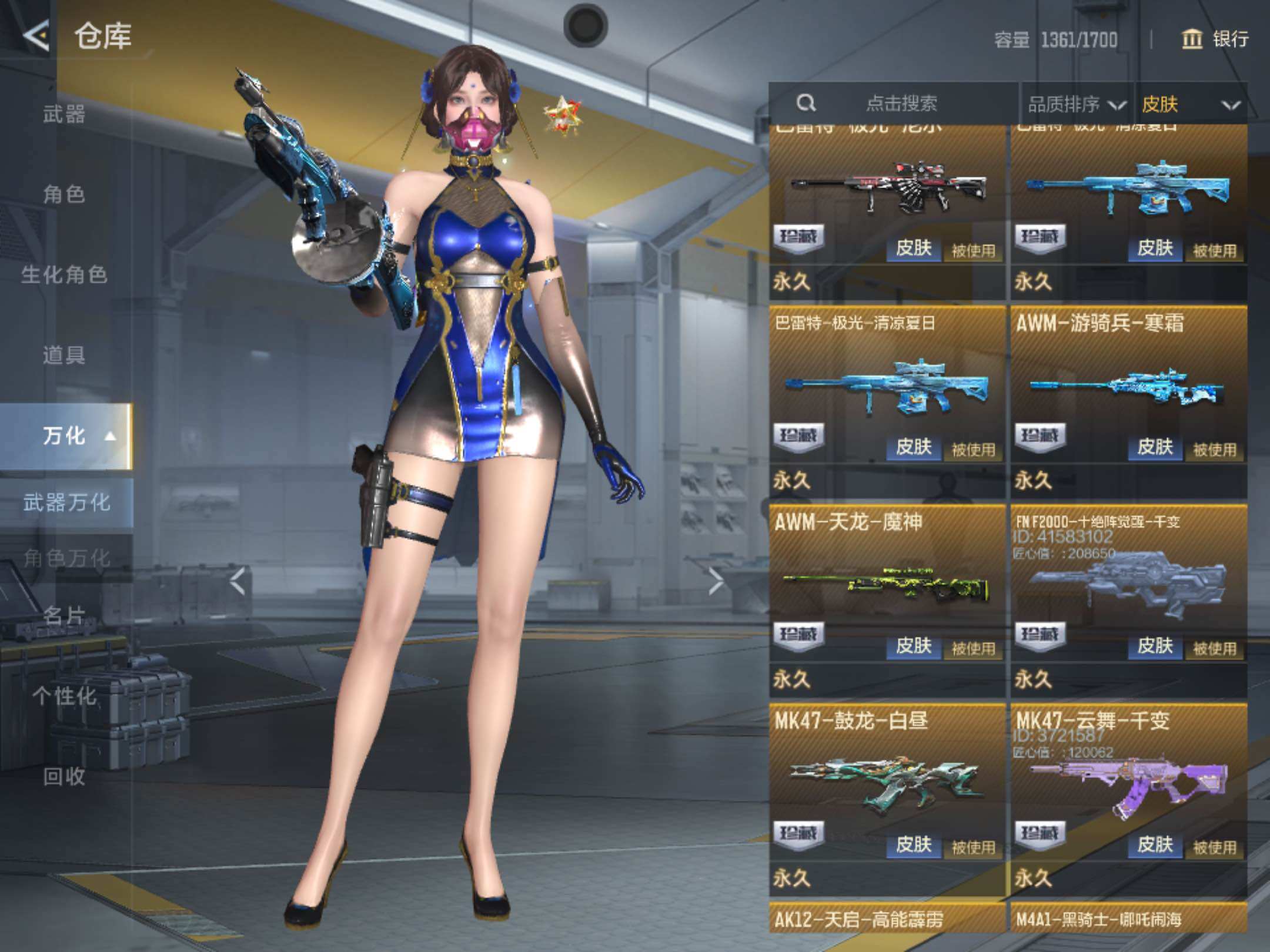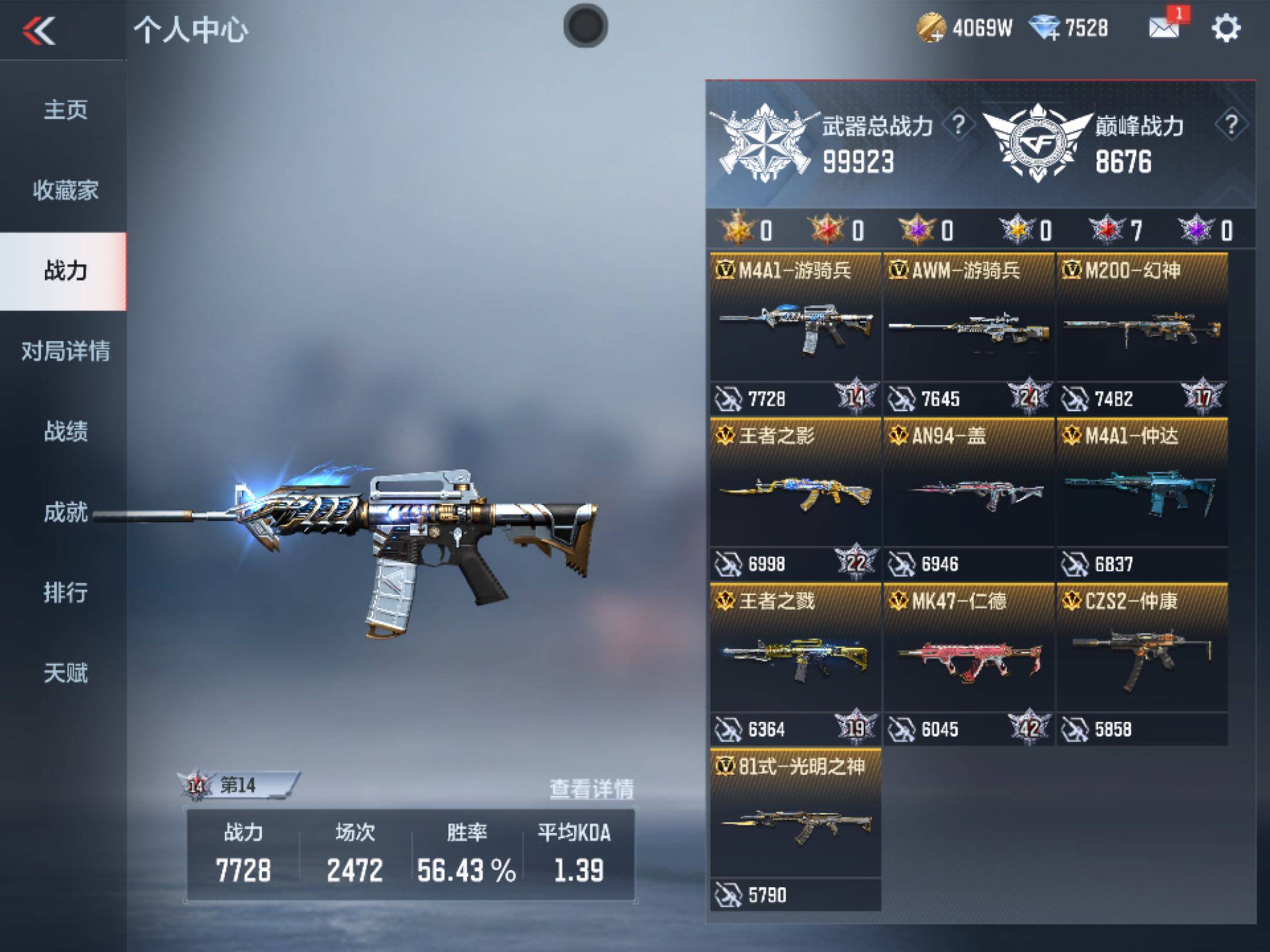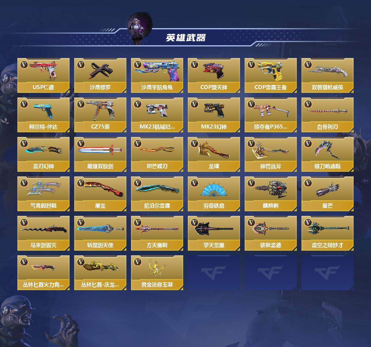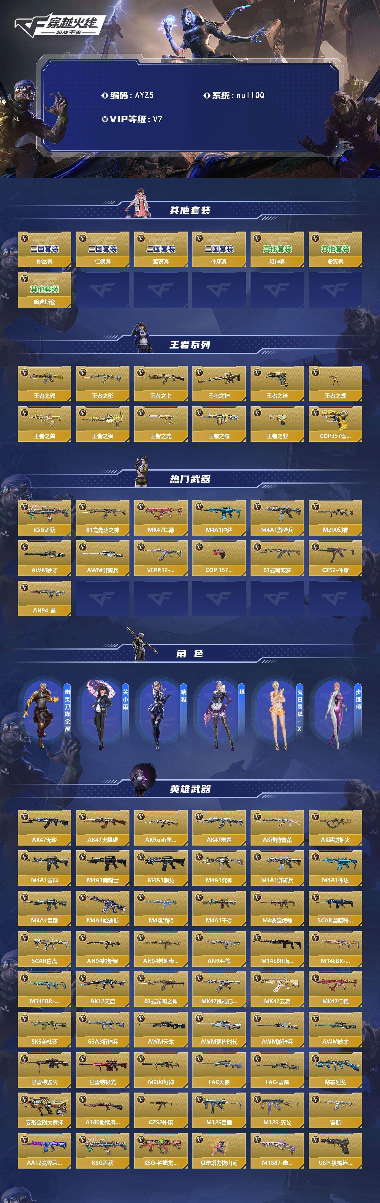 6英雄角色数-196英雄武器数 【王者系列】:王者之戮,王者之影,王者之心,王者之神,王者之迹,王者之蝶,王者之兽,王者之狱,王者之隐,王者之霆,王者之业,cop 357-雷霆王者 【热门武器】:ksg-孟获,81式-光明之神,mk47-仁德,m4a1-仲达,m4a1-游骑兵,m200-幻神,awm-妙才,awm-游骑兵,vepr12-宙斯,cop 357-堕天神,81式-阿波罗,czs2-仲康,an94-盖 【角色】:幽灵刀锋-觉醒,关小雨,晴雅,蝉,夏日灵狐-x,步练师 【英雄武器】:ak47-无影,ak47-火麒麟,ak47-rush-星速,ak47-雷霆,ak47-雅韵青花,ak47-谜城烟火,m4a1-雷神,m4a1-黑骑士2,m4a1-黑龙2,m4a1-死神,m4a1-游骑兵,m4a1-仲达,m4a1-雷霆,m4a1-哈迪斯,m4a1-运输船,m4a1-千变,m4a1-铁胆虎魄,scar-幽暗骑士,scar light-白虎,an94-超新星,an94-赳赳秦师,an94-盖,m14ebr-暗夜,m14ebr-拂影,m14ebr-葫芦山庄,ak12-天启,81式-光明之神,mk47-机械纪元,mk47-云舞,mk47-仁德,sks-美杜莎,g3a3-衍神兵,awm-天龙,awm-赛博时代,awm-游骑兵,awm-妙才,芭蕾特-毁灭,芭蕾特-极光6,m200-幻神,tac-天使,tac-雷暴,寒霜烈龙5,qcw05-变形金刚·大黄蜂,a180-地狱凤凰,czs2-仲康,m12s-雷霆,m12s-天公,vepr12-宙斯,aa12-竞界荣光,ksg-孟获,ksg-钟馗觉醒,贝雷塔-力拔山河,m1887-幽冥玄喵觉醒2,usp-机械迷城,usp-仁德,沙鹰-修罗,沙鹰-宇航兔兔,蚩尤战弓觉醒,cop 357-堕天神,cop 357-雷霆王者,双管猎呛-威侯,柯尔特-仲达,cz75-策,mk23-机械纪元,mk23-幻神,掠夺者p365-虹舞,白骨利刃,墨刃-幻神,雌雄双股剑,炽芒蝶刃6,龙啸,神罚战斧2,镰刀-哈迪斯,气勇胆烈戟,屠龙14,尼泊尔-雷霆3,穷奇铁扇,龙鳞-觉醒,麒麟刺,星芒,马来剑-毁灭,斩魔剑-天使,唐刀-华夏传说,方天画戟,擎天觉醒,铁锹-孟德,虚空之槌-妙才,丛林匕首-火力竞放觉醒,丛林匕首-庆龙觉醒,黄金迷你玉凝 【三国/其他套装】:孟获套,仲康套,幻神套,毁灭套,仁德套,仲达套,哈迪斯套