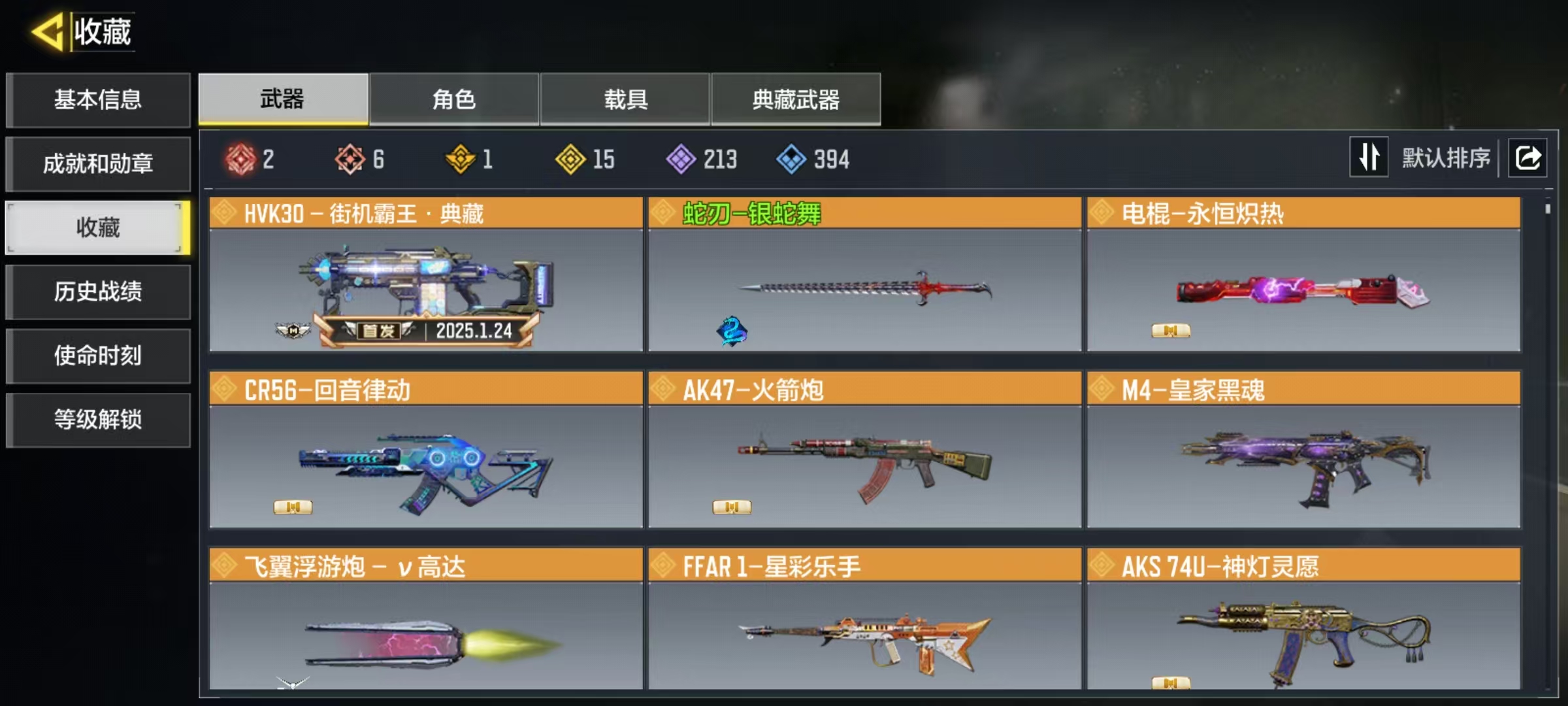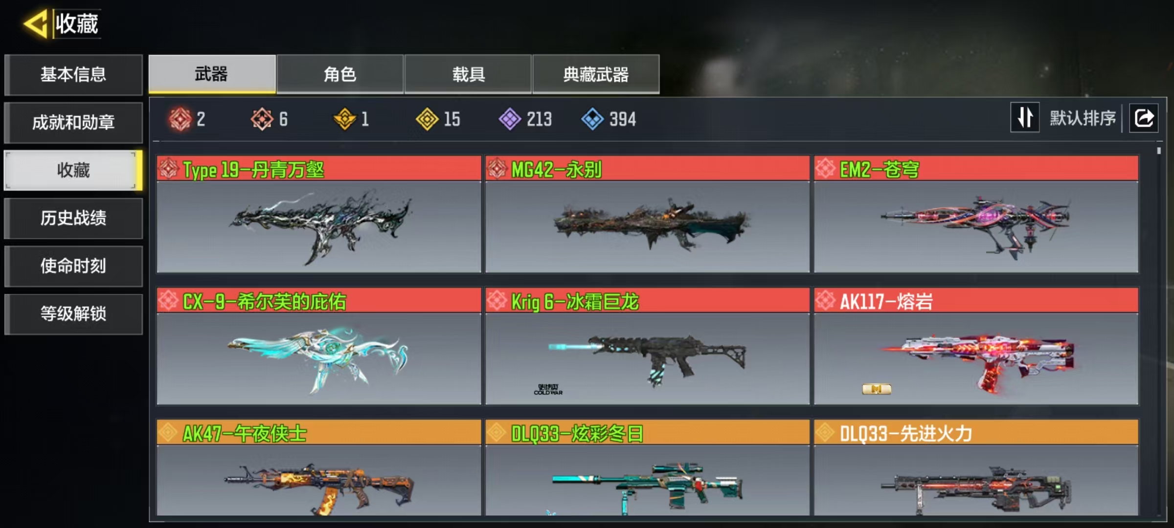 安卓q-等级368-史诗呛械213 【6神话2满级】 type 19-丹青万壑 (满级) cx-9-希尔芙的庇佑 mg42-永别 (满级) krig 6-冰霜巨龙 em2-苍穹 ak117-熔岩 【1典藏传说】 hvk30-街机霸王·典藏 【15传说】 ak47-午夜侠士 dlq33-炫彩冬日 dlq33-先进火力 hvk30-街机霸王·典藏 蛇刃-银蛇舞 电棍-永恒炽热 cr