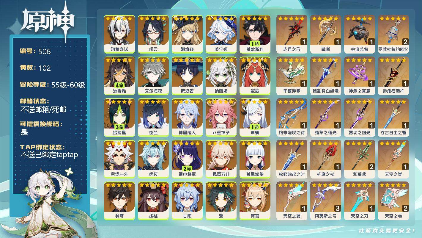 [11764237]60级/102黄/女主/40个五星角色/27个五星武器 0命阿蕾奇诺0命闲云0命娜维娅0命芙宁娜1命莱欧斯利4命迪希雅0命艾尔海森0命流浪者0命纳西妲0命妮露3命提纳里0命夜兰0命神里绫人0命八重神子1命申鹤0命荒泷一斗0命优菈2命雷电将军0命枫原万叶0命神里绫华0命钟离0命胡桃0命甘雨0命魈0命宵宫0命温迪0命可莉0命阿贝多0命珊瑚宫心海3命刻晴满命七七4命琴1命莫娜4命迪卢克0命基尼奇1命希诺宁0命玛拉妮0命恰斯卡0命梦见月瑞希0命菈乌玛精1赤月之形精1裁断精1金流监督精2图莱杜拉的回忆精1千夜浮梦精1波乱月白经津精1神乐之真意精1赤角石溃杵精1终末嗟叹之诗精1薙草之稻光精1雾切之回光精1苍古自由之誓精1松籁响起之时精1护摩之杖精2和璞鸢精1天空之脊精1天空之翼精3阿莫斯之弓精1天空之刃精2天空之卷精1天空之傲精1岩峰巡歌精1星鹫赤羽