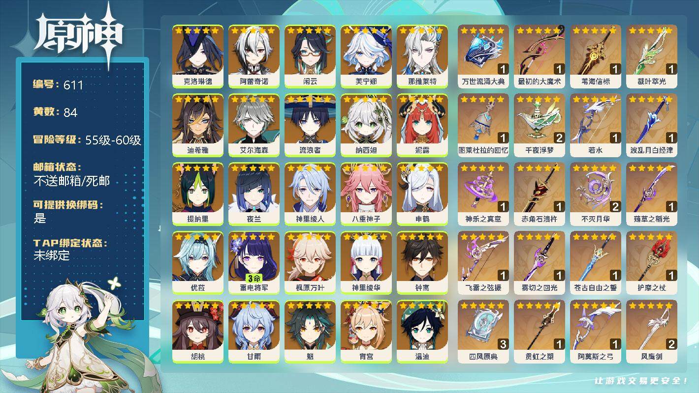 [12468160]60级/84黄/女主/33个五星角色/24个五星武器 0命克洛琳德0命阿蕾奇诺0命闲云0命芙宁娜0命那维莱特0命迪希雅0命艾尔海森0命流浪者0命纳西妲0命妮露0命提纳里0命夜兰0命神里绫人0命八重神子0命申鹤0命优菈3命雷电将军0命枫原万叶0命神里绫华0命钟离0命胡桃0命甘雨0命魈0命宵宫0命温迪0命可莉0命达达利亚0命珊瑚宫心海3命七七3命琴满命莫娜4命迪卢克0命玛薇卡精1万世流涌大典精1最初的大魔术精1苇海信标精1裁叶萃光精1图莱杜拉的回忆精2千夜浮梦精1若水精1波乱月白经津精1神乐之真意精1赤角石溃杵精2不灭月华精1薙草之稻光精1飞雷之弦振精1雾切之回光精1苍古自由之誓精1护摩之杖精3四风原典精1贯虹之槊精1阿莫斯之弓精2风鹰剑精3狼的末路精2天空之傲精1冲浪时光