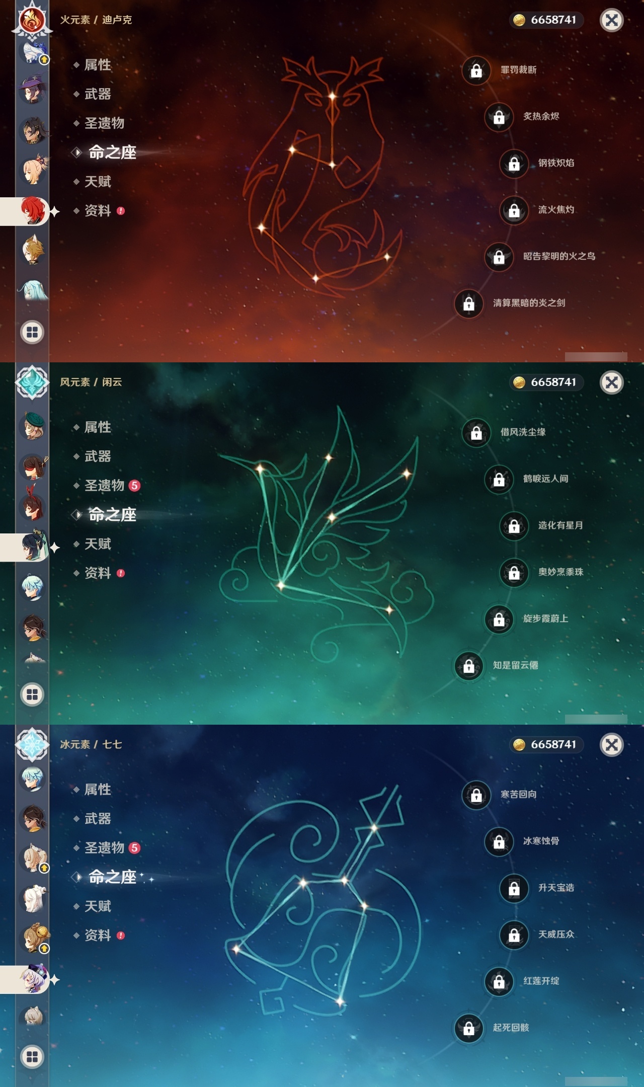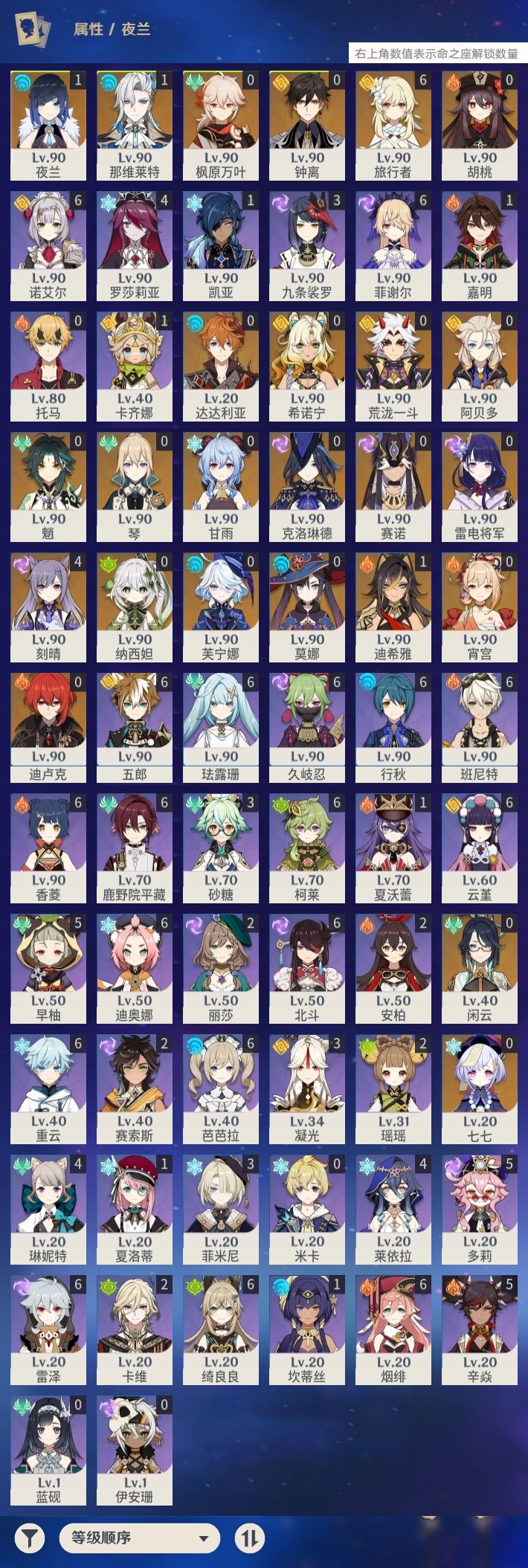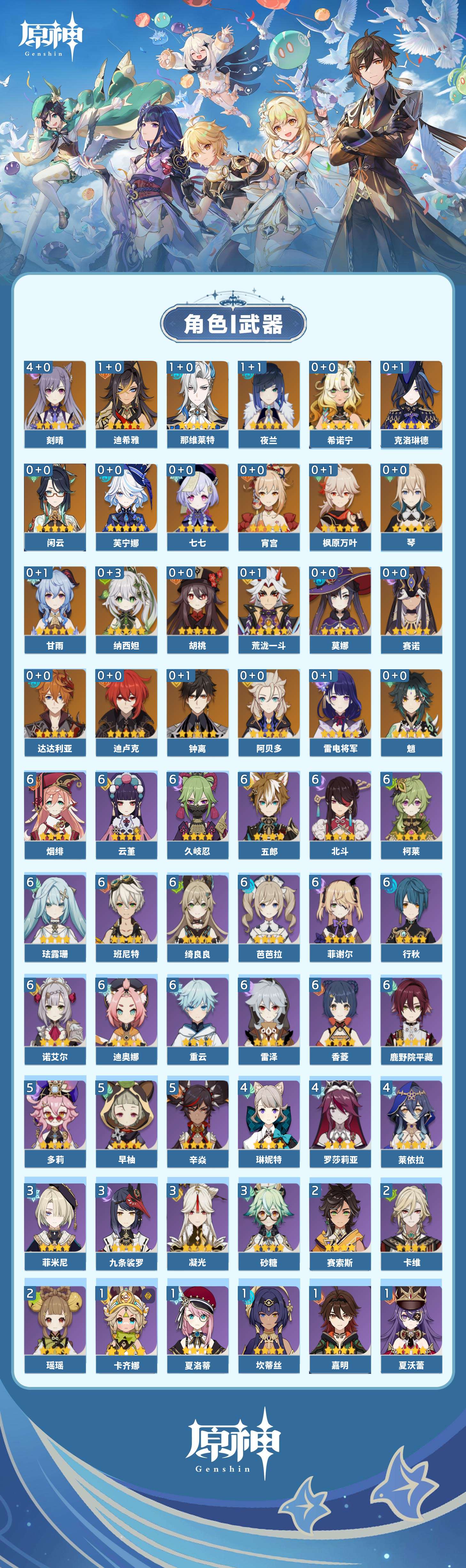 【原神】【lyys7966】冒险等级:60,五星数量:42,五星角色:刻晴 4命迪希雅 1命那维莱特 1命夜兰 1命莫娜七七琴希诺宁宵宫钟离荒泷一斗达达利亚阿贝多芙宁娜闲云赛诺纳西妲迪卢克枫原万叶甘雨魈胡桃克洛琳德雷电将军__五星武器:千夜浮梦 3精天空之脊 2精天空之卷 2精天空之刃 2精最初的大魔术阿莫斯之弓苍古自由之誓风鹰剑天空之傲无工之剑雾切之回光薙草之稻光赤角石溃杵息灾贯虹之槊若水圣显之钥赦罪__四星角色:班尼特 6命行秋 6命香菱 6命久岐忍 6命鹿野院平藏 6命珐露珊 6命迪奥娜 6命绮良良 6命柯莱 6命芭芭拉 6命云堇 6命五郎 6命烟绯 6命重云 6命诺艾尔 6命雷泽 6命菲谢尔 6命北斗 6命多莉 5命早柚 5命辛焱 5命莱依拉 4命罗莎莉亚 4命琳妮特 4命九条裟罗 3命凝光 3命砂糖 3命菲米尼 3命瑶瑶 2命卡维 2命赛索斯 2命卡齐娜 1命坎蒂丝 1命夏洛蒂 1命夏沃蕾 1命嘉明 1命米卡蓝砚托马伊安珊