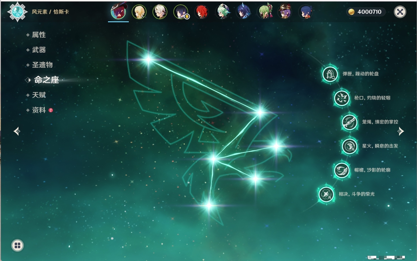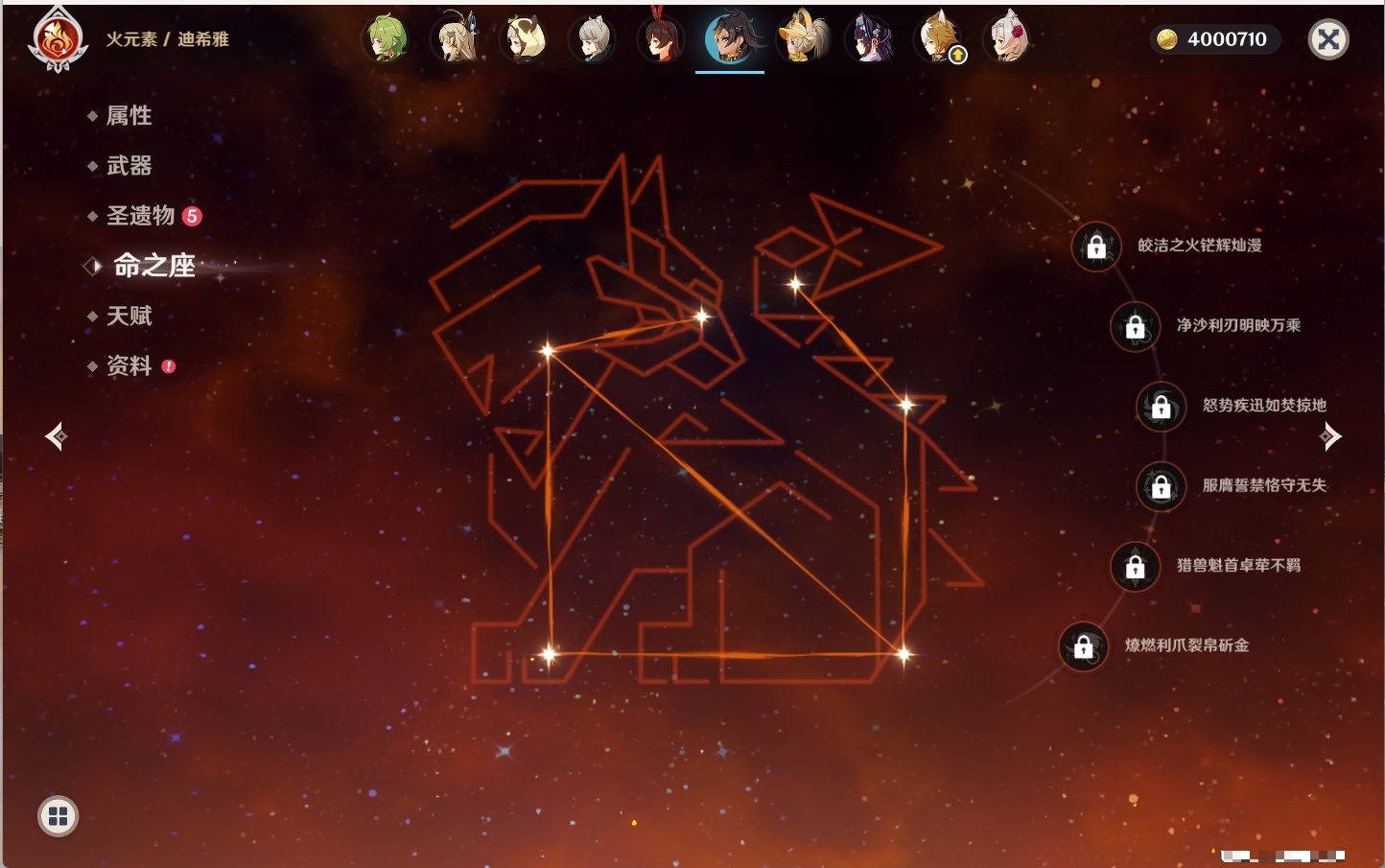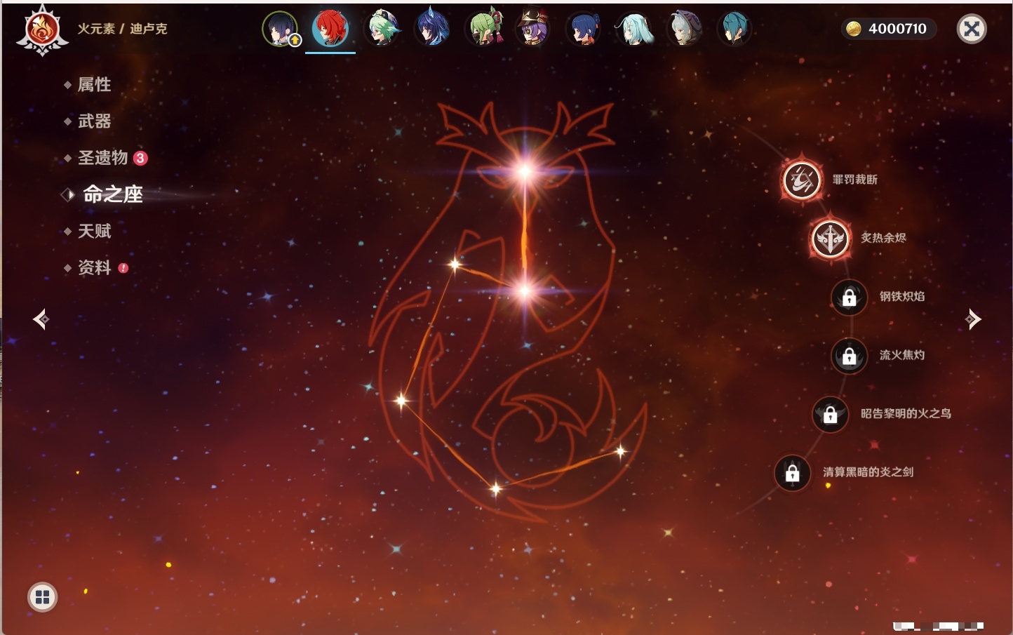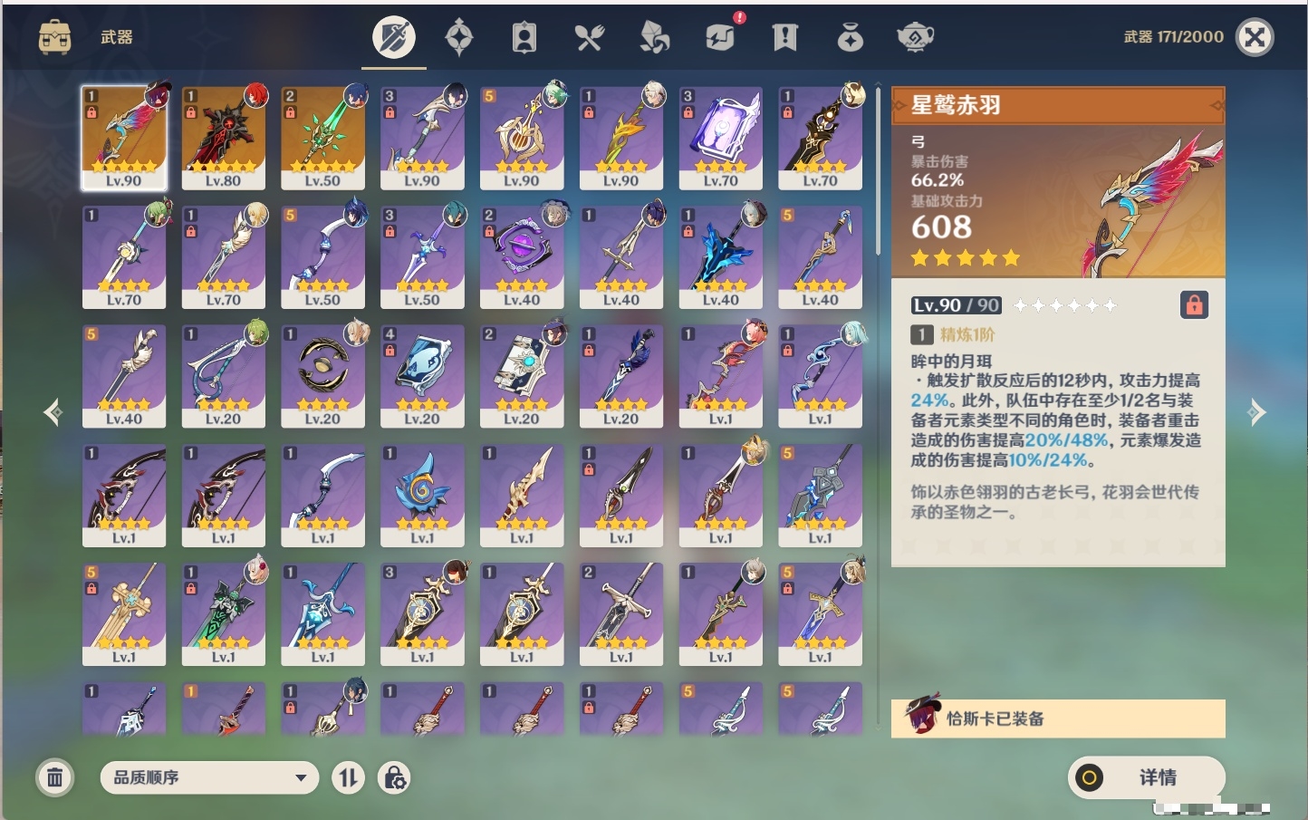 [13977248]19黄 风:6命恰斯卡,1命琴 火:2命迪卢克,0命迪希雅 水:0命夜兰,0命莫娜 弓:精1星鹫赤羽 双手剑:精1狼的末路 长柄武器:精2和璞鸢 【角色皮肤】 四星角色:班尼特-炽绘奇旅