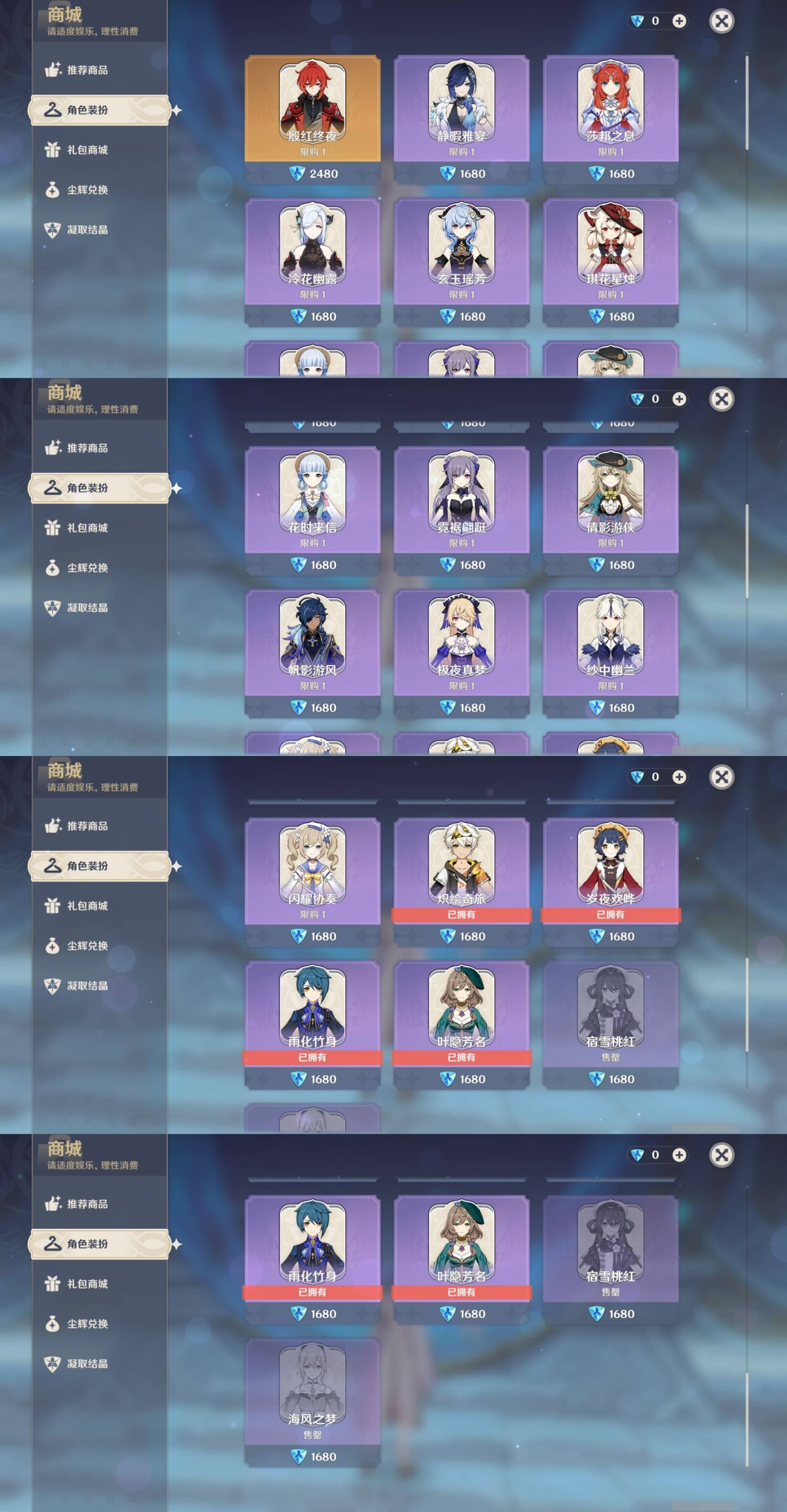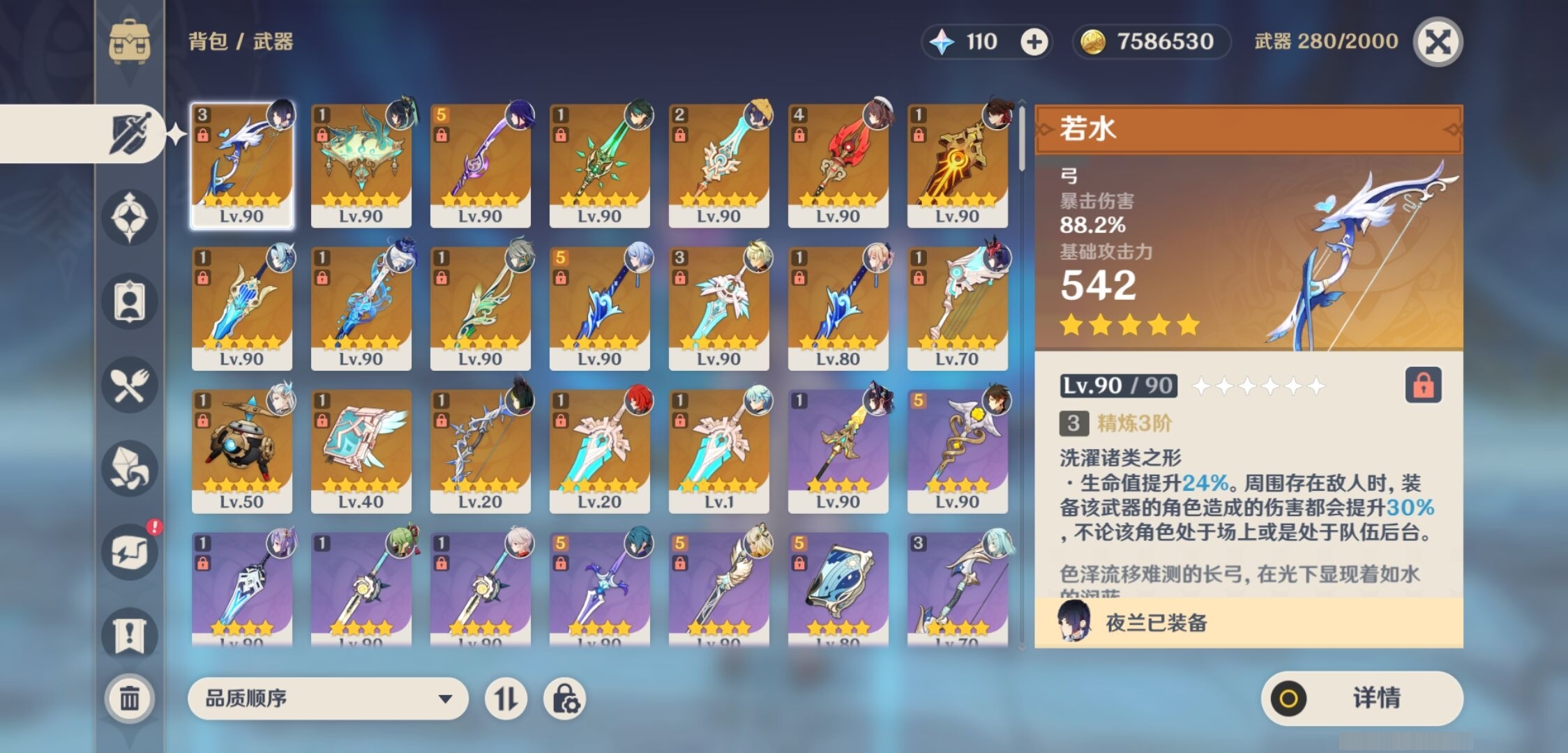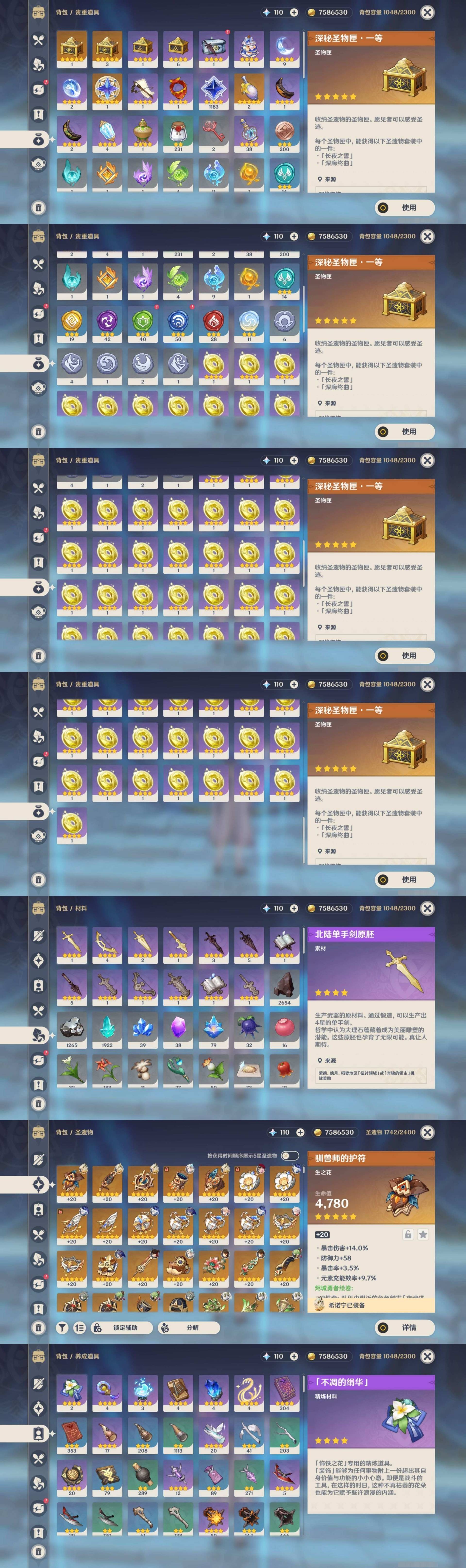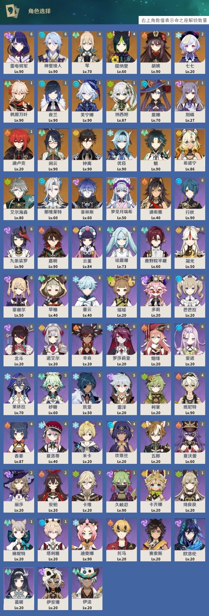 [13977439]90黄 风:0命魈,1命枫原万叶,0命闲云,4命琴,0命梦见月瑞希 火:3命胡桃,0命迪希雅,1命迪卢克 水:6命神里绫人,1命芙宁娜,1命夜兰,1命莫娜,0命那维莱特 冰:0命优菈,2命七七 岩:0命钟离,0命希诺宁 雷:6命雷电将军,0命菲林斯,1命刻晴 草:1命纳西妲,0命艾尔海森,4命提纳里 弓:精3若水,精1天空之翼,精1冬极白星 法器:精1鹤鸣余音,精1金流监督,精1天空之卷 单手剑:精1静水流涌之辉,精1裁叶萃光,精5波乱月白经津,精1波乱月白经津,精3天空之刃 双手剑:精1苇海信标,精1松籁响起之时,精1天空之傲,精1天空之傲 长柄武器:精5薙草之稻光,精1和璞鸢,精2天空之脊,精4护摩之杖 【角色皮肤】 五星角色:胡桃-宿雪桃红,琴-海风之梦 四星角色:班尼特-炽绘奇旅,香菱-岁夜欢哗,行秋-雨化竹身,丽莎-叶隐芳名