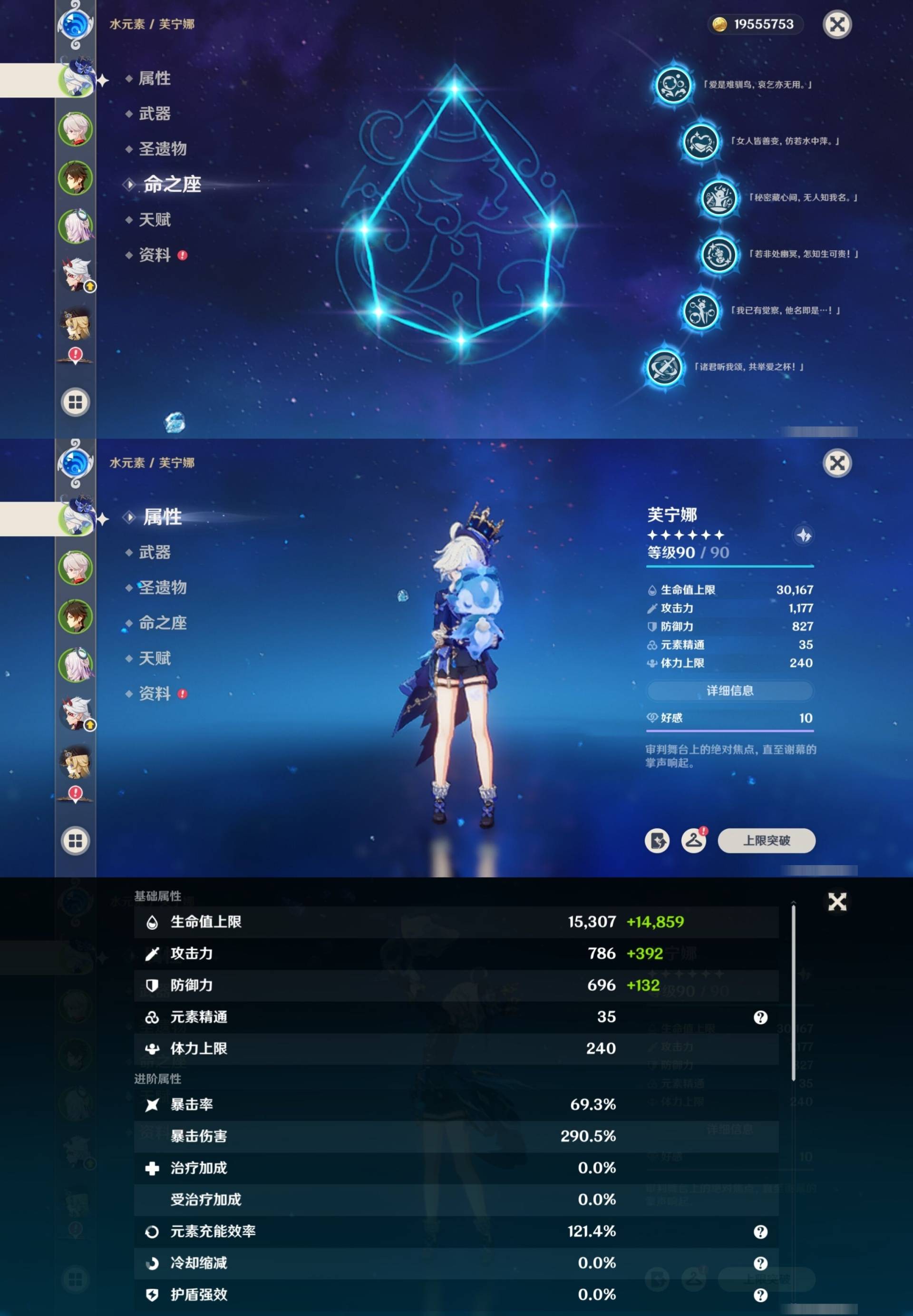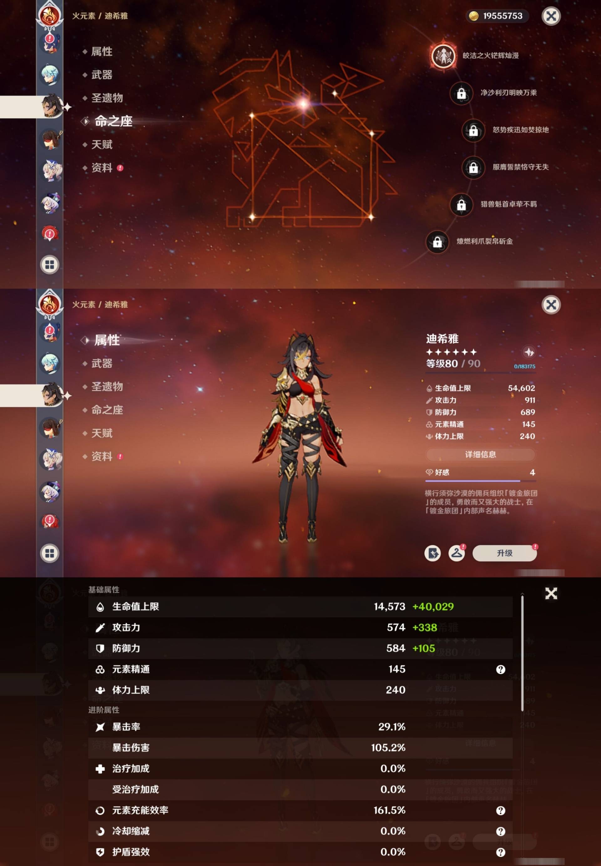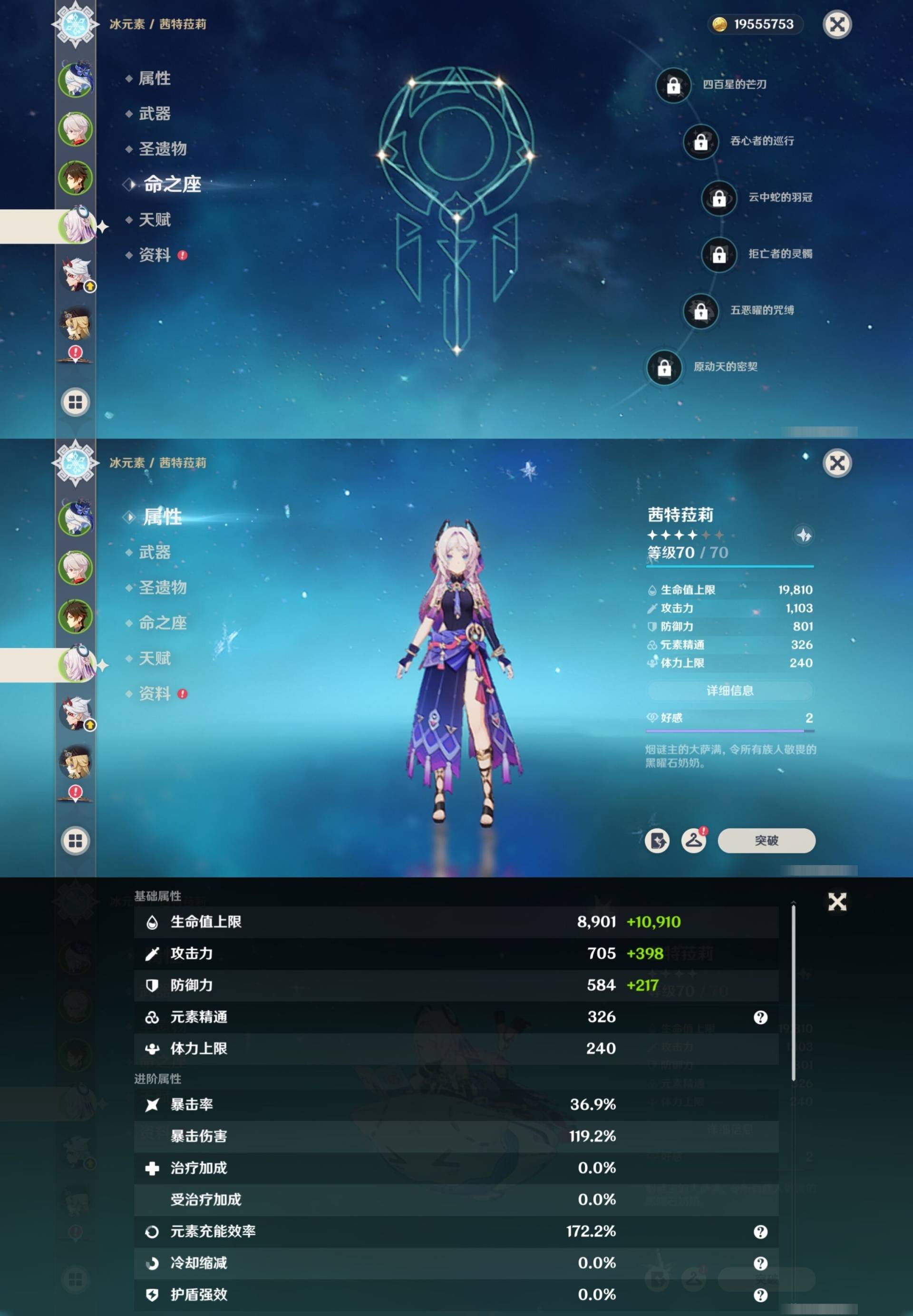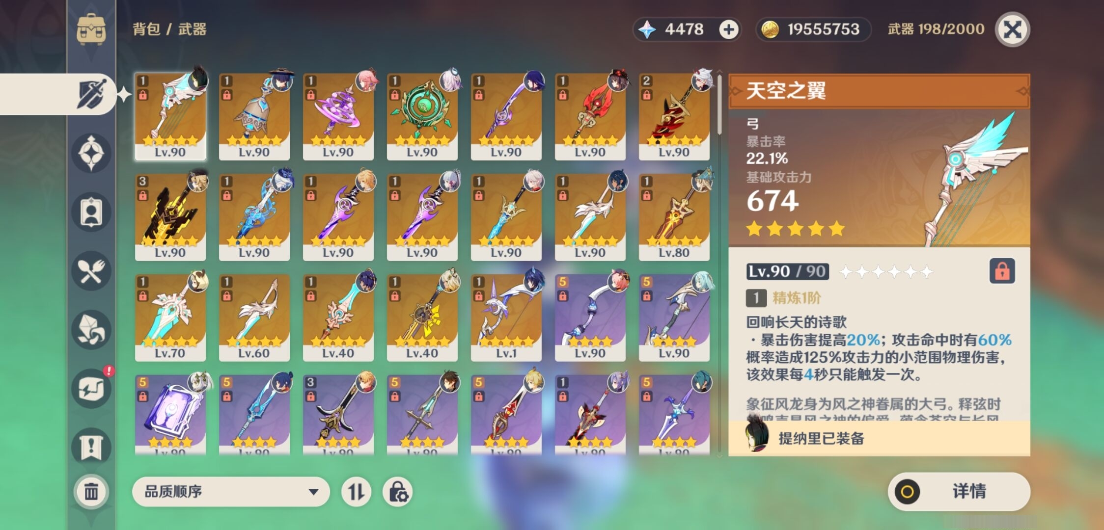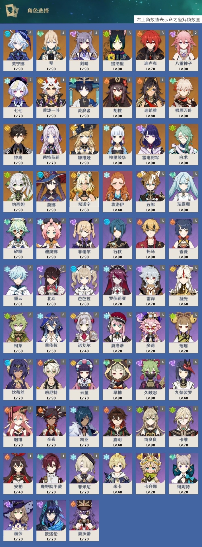 [14000924]72黄 风:0命枫原万叶,1命流浪者,4命琴 火:1命胡桃,1命迪希雅,3命迪卢克 水:6命芙宁娜,0命莫娜 冰:0命茜特菈莉,0命神里绫华,2命七七,0命埃洛伊 岩:0命钟离,1命荒泷一斗,0命娜维娅,0命希诺宁 雷:2命八重神子,0命雷电将军,4命刻晴 草:0命白术,0命纳西妲,3命提纳里 弓:精1天空之翼,精1阿莫斯之弓 法器:精1图莱杜拉的回忆,精1神乐之真意,精1碧落之珑 单手剑:精1静水流涌之辉,精1雾切之回光,精1雾切之回光,精1苍古自由之誓,精1风鹰剑,精1风鹰剑,精1圣显之钥,精1岩峰巡歌 双手剑:精2赤角石溃杵,精3无工之剑,精1天空之傲 长柄武器:精1薙草之稻光,精1护摩之杖,精1天空之脊 【角色皮肤】 四星角色:绮良良-倩影游侠,行秋-雨化竹身,凯亚-帆影游风,丽莎-叶隐芳名,菲谢尔-极夜真梦,凝光-纱中幽兰,芭芭拉-闪耀协奏