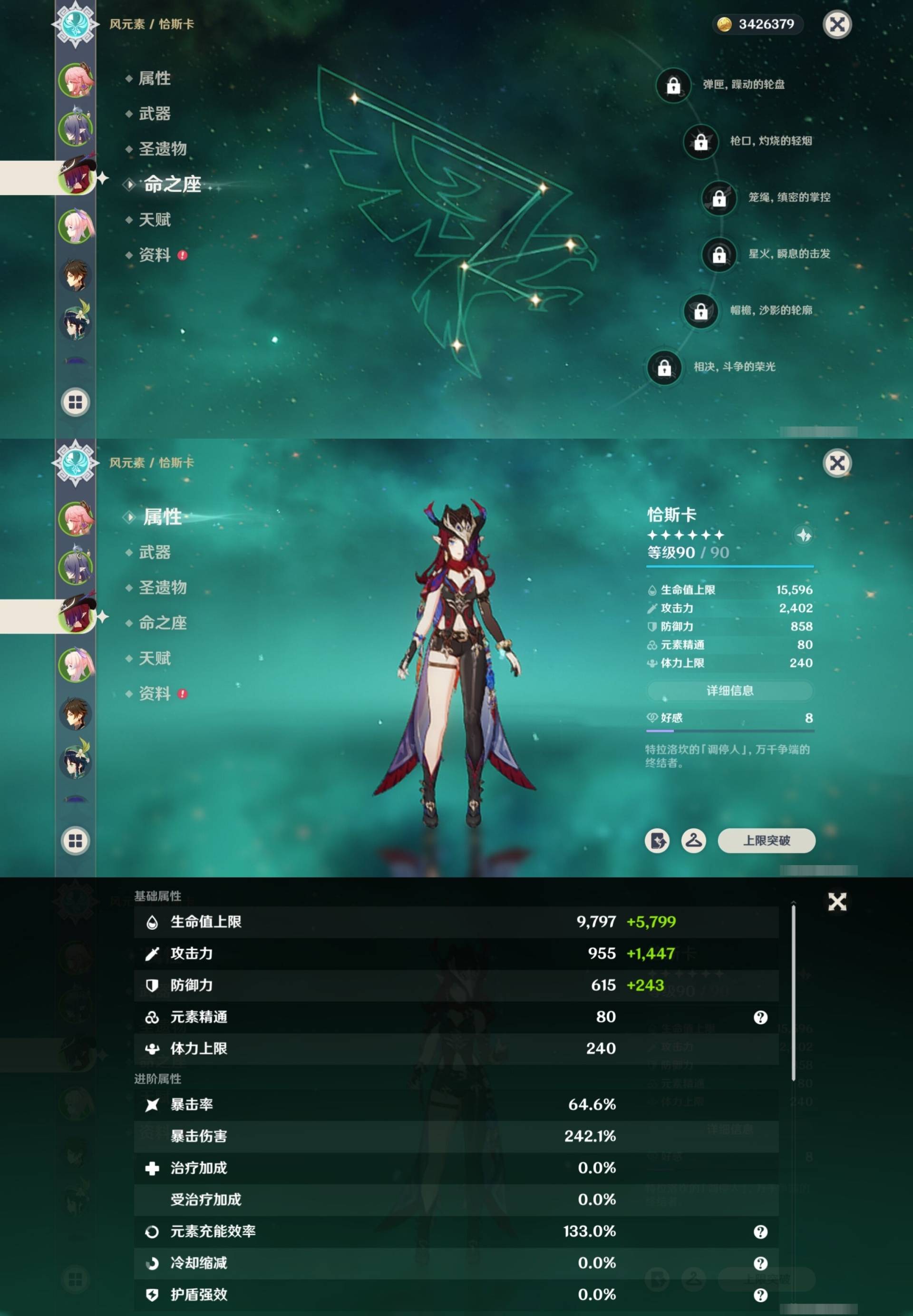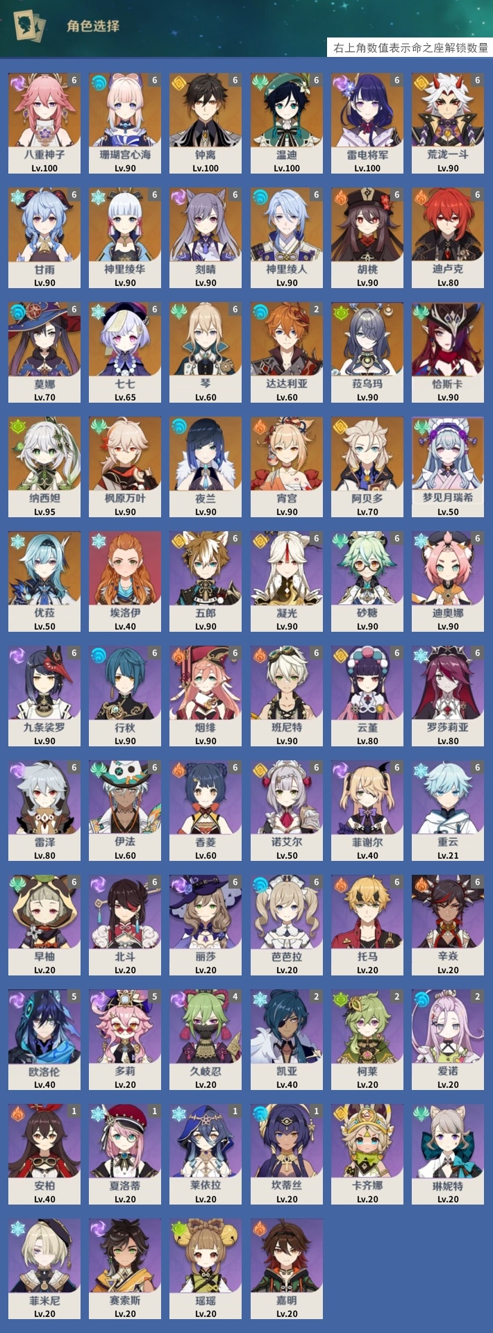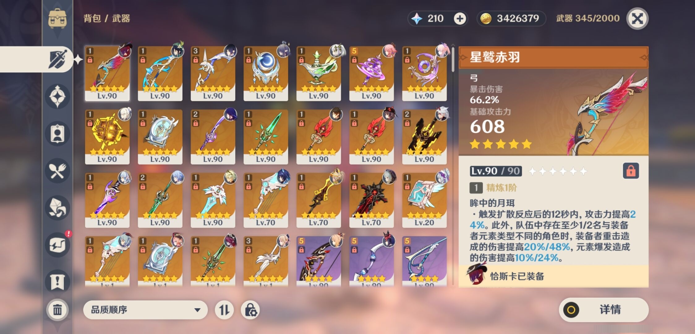 [14001684]154黄 风:0命恰斯卡,6命温迪,6命琴,0命枫原万叶,0命梦见月瑞希 火:6命胡桃,6命迪卢克,0命宵宫 水:6命珊瑚宫心海,6命神里绫人,6命莫娜,0命夜兰,2命达达利亚 冰:6命甘雨,6命神里绫华,6命七七,0命优菈,0命埃洛伊 岩:6命钟离,6命荒泷一斗,0命阿贝多 雷:6命八重神子,6命雷电将军,6命刻晴 草:0命菈乌玛,0命纳西妲 弓:精1星鹫赤羽,精1终末嗟叹之诗,精3阿莫斯之弓,精1天空之翼,精1天空之翼 法器:精1纺夜天镜,精1千夜浮梦,精5神乐之真意,精1不灭月华,精1尘世之锁,精1四风原典,精1四风原典,精1天空之卷 单手剑:精1雾切之回光,精2磐岩结绿,精1天空之刃,精3风鹰剑 双手剑:精2无工之剑,精1狼的末路 长柄武器:精2薙草之稻光,精1和璞鸢,精1和璞鸢,精1护摩之杖,精1护摩之杖,精1贯虹之槊 【角色皮肤】 五星角色:迪卢克-殷红终夜,神里绫华-花时来信,刻晴-霓裾翩跹,琴-海风之梦 四星角色:丽莎-叶隐芳名,菲谢尔-极夜真梦,凝光-纱中幽兰,芭芭拉-闪耀协奏