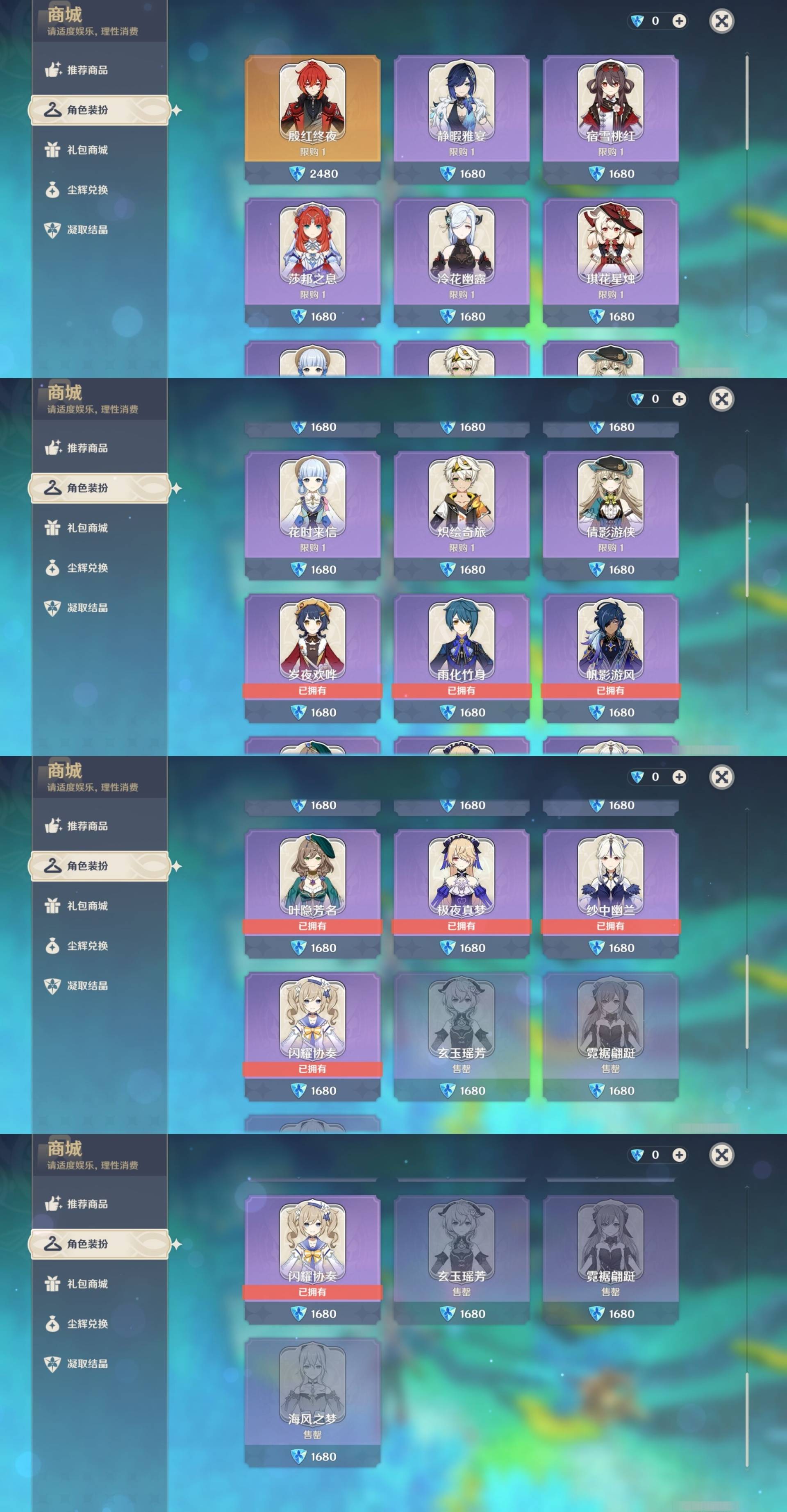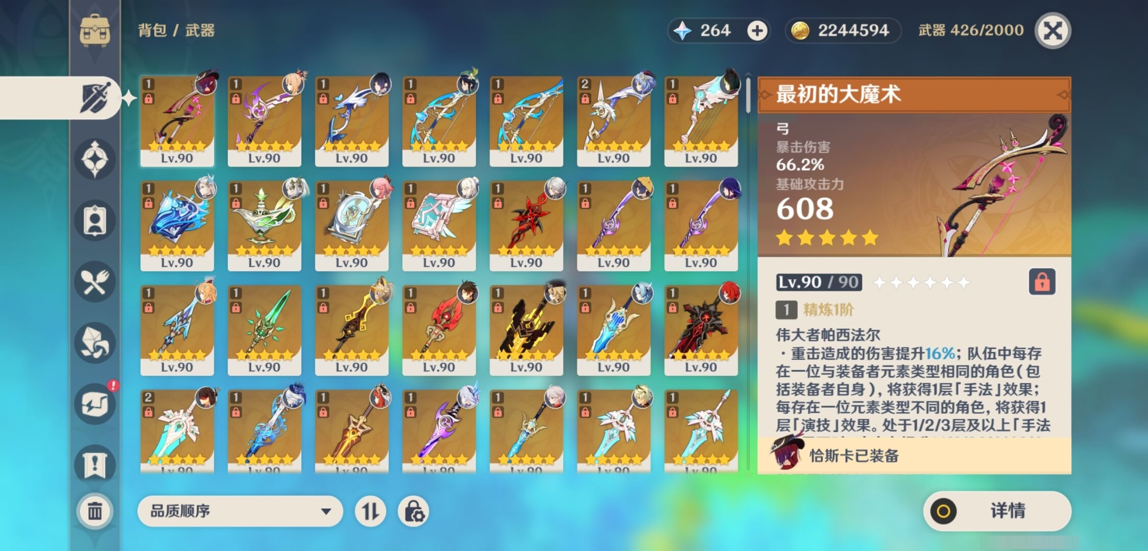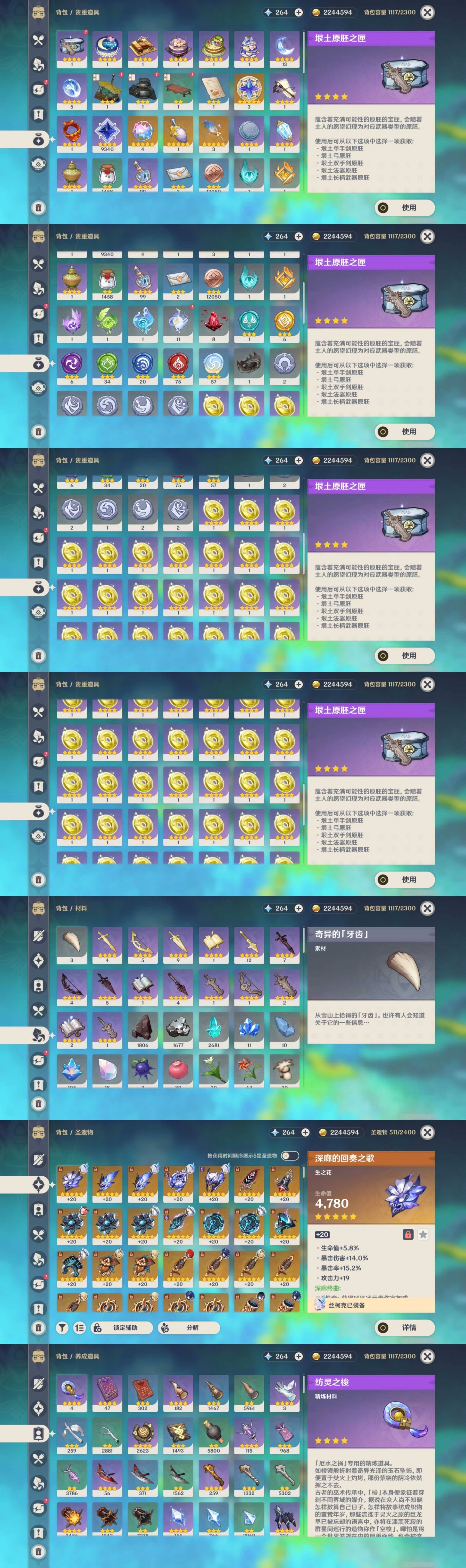 [14030478]100黄 风:0命枫原万叶,0命恰斯卡,0命闲云,0命温迪,2命琴 火:1命阿蕾奇诺,1命宵宫,2命迪希雅,6命迪卢克 水:2命芙宁娜,0命玛拉妮,6命那维莱特,0命妮露,1命夜兰,0命珊瑚宫心海,3命莫娜 冰:0命丝柯克,0命爱可菲,6命优菈,0命甘雨,0命神里绫华,1命七七,0命埃洛伊 岩:0命希诺宁,0命娜维娅,0命钟离 雷:0命八重神子,0命雷电将军,3命刻晴 草:0命白术,0命纳西妲,4命提纳里 弓:精1最初的大魔术,精1飞雷之弦振,精1若水,精1终末嗟叹之诗,精1终末嗟叹之诗,精2阿莫斯之弓,精1天空之翼 法器:精1万世流涌大典,精1千夜浮梦,精1四风原典,精1天空之卷 单手剑:精1静水流涌之辉,精1圣显之钥,精1雾切之回光,精1苍古自由之誓,精1天空之刃,精1天空之刃 双手剑:精1无工之剑,精1松籁响起之时,精1狼的末路,精2天空之傲 长柄武器:精1赤月之形,精1薙草之稻光,精1薙草之稻光,精1息灾,精1和璞鸢,精1贯虹之槊,精1护摩之杖 【角色皮肤】 五星角色:甘雨-玄玉瑶芳,刻晴-霓裾翩跹,琴-海风之梦 四星角色:香菱-岁夜欢哗,行秋-雨化竹身,凯亚-帆影游风,丽莎-叶隐芳名,菲谢尔-极夜真梦,凝光-纱中幽兰,芭芭拉-闪耀协奏