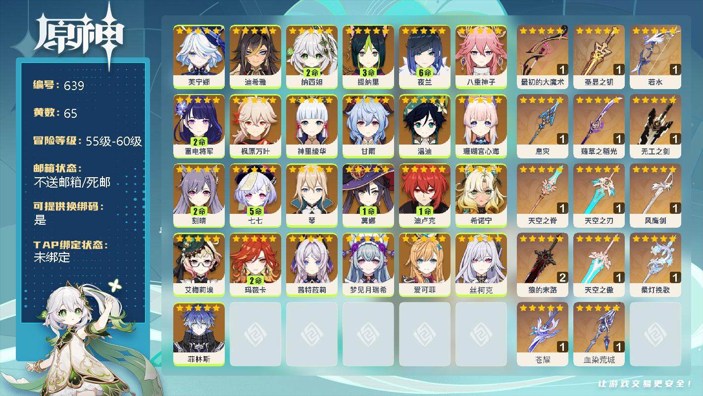 [14075244]60级/65黄/男主/25个五星角色/15个五星武器 0命芙宁娜0命迪希雅2命纳西妲3命提纳里满命夜兰0命八重神子2命雷电将军0命枫原万叶0命神里绫华0命甘雨0命温迪0命珊瑚宫心海2命刻晴5命七七0命琴1命莫娜1命迪卢克0命希诺宁0命艾梅莉埃2命玛薇卡0命茜特菈莉0命梦见月瑞希0命爱可菲0命丝柯克0命菲林斯精1最初的大魔术精1圣显之钥精1若水精1息灾精1薙草之稻光精1无工之剑精1天空之脊精1天空之刃精1风鹰剑精2狼的末路精1天空之傲精1柔灯挽歌精1苍耀精1血染荒城