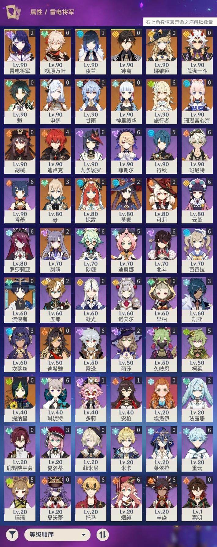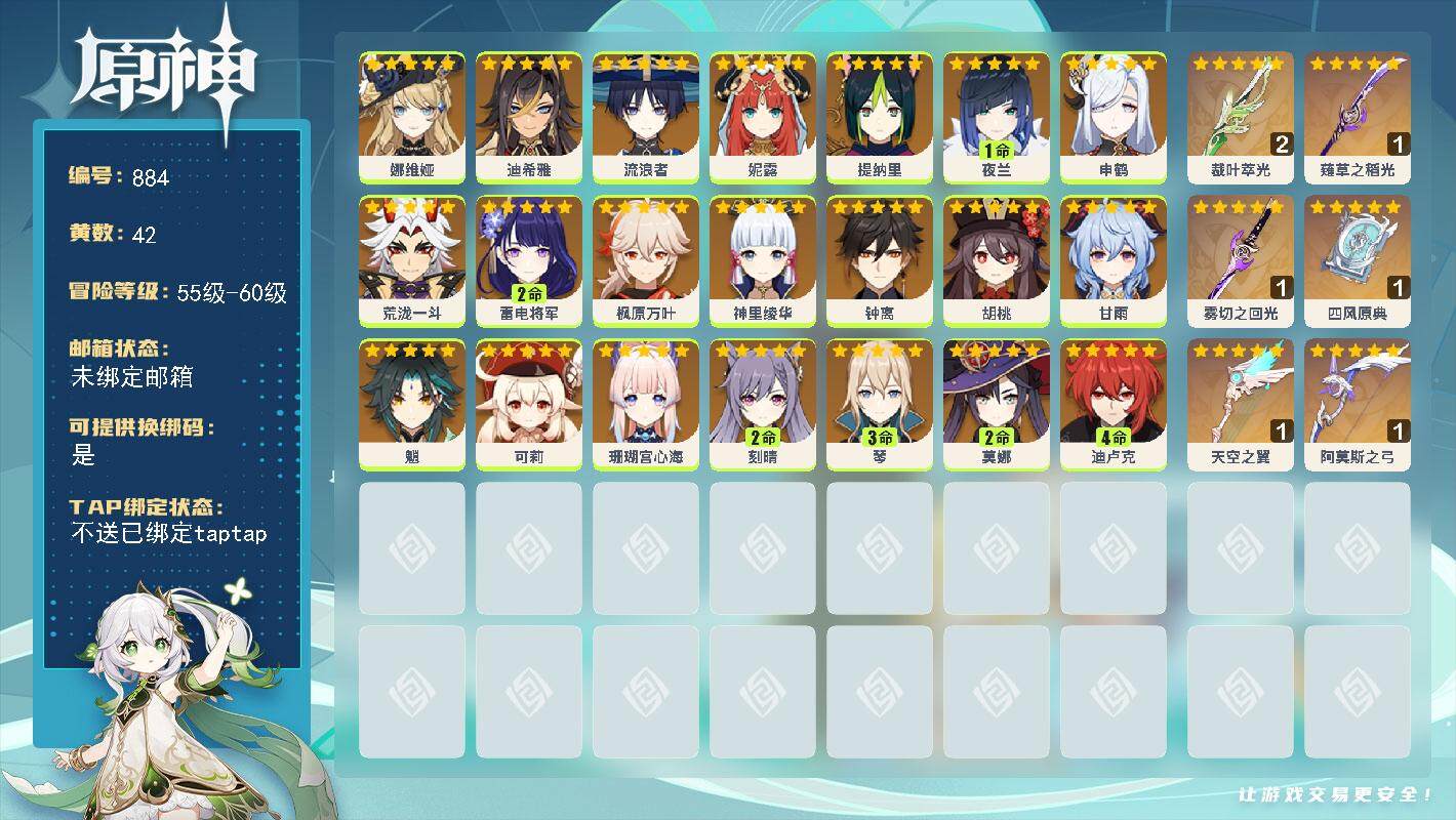 [14081612]59级/42黄/女主/21个五星角色/6个五星武器 0命娜维娅0命迪希雅0命流浪者0命妮露0命提纳里1命夜兰0命申鹤0命荒泷一斗2命雷电将军0命枫原万叶0命神里绫华0命钟离0命胡桃0命甘雨0命魈0命可莉0命珊瑚宫心海2命刻晴3命琴2命莫娜4命迪卢克精2裁叶萃光精1薙草之稻光精1雾切之回光精1四风原典精1天空之翼精1阿莫斯之弓