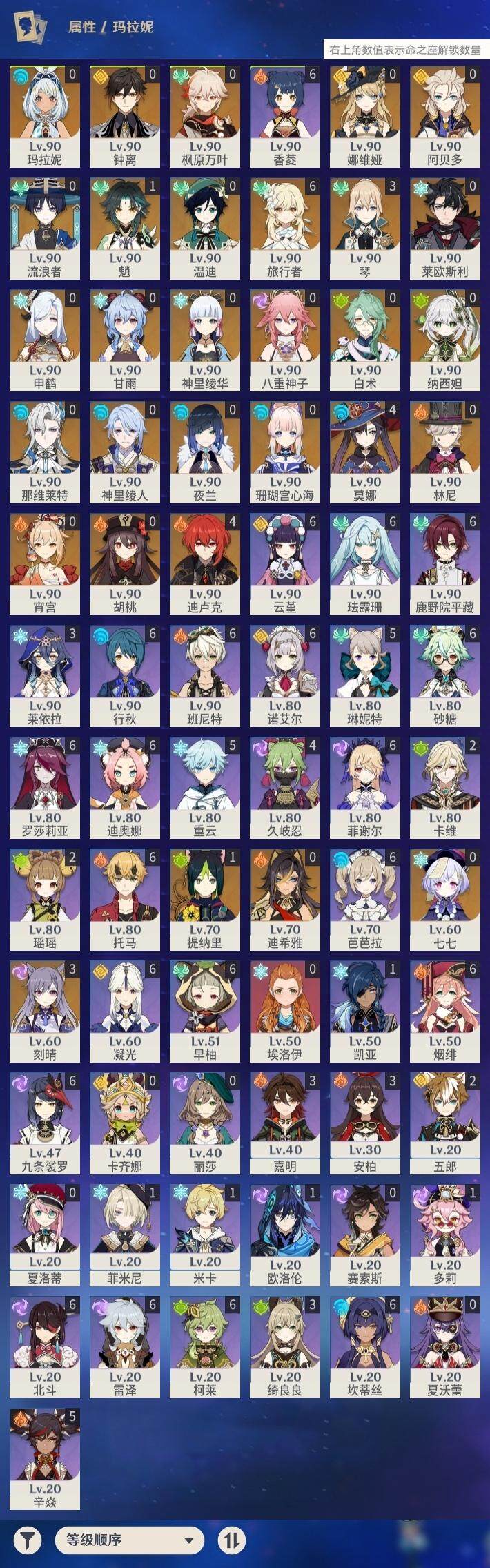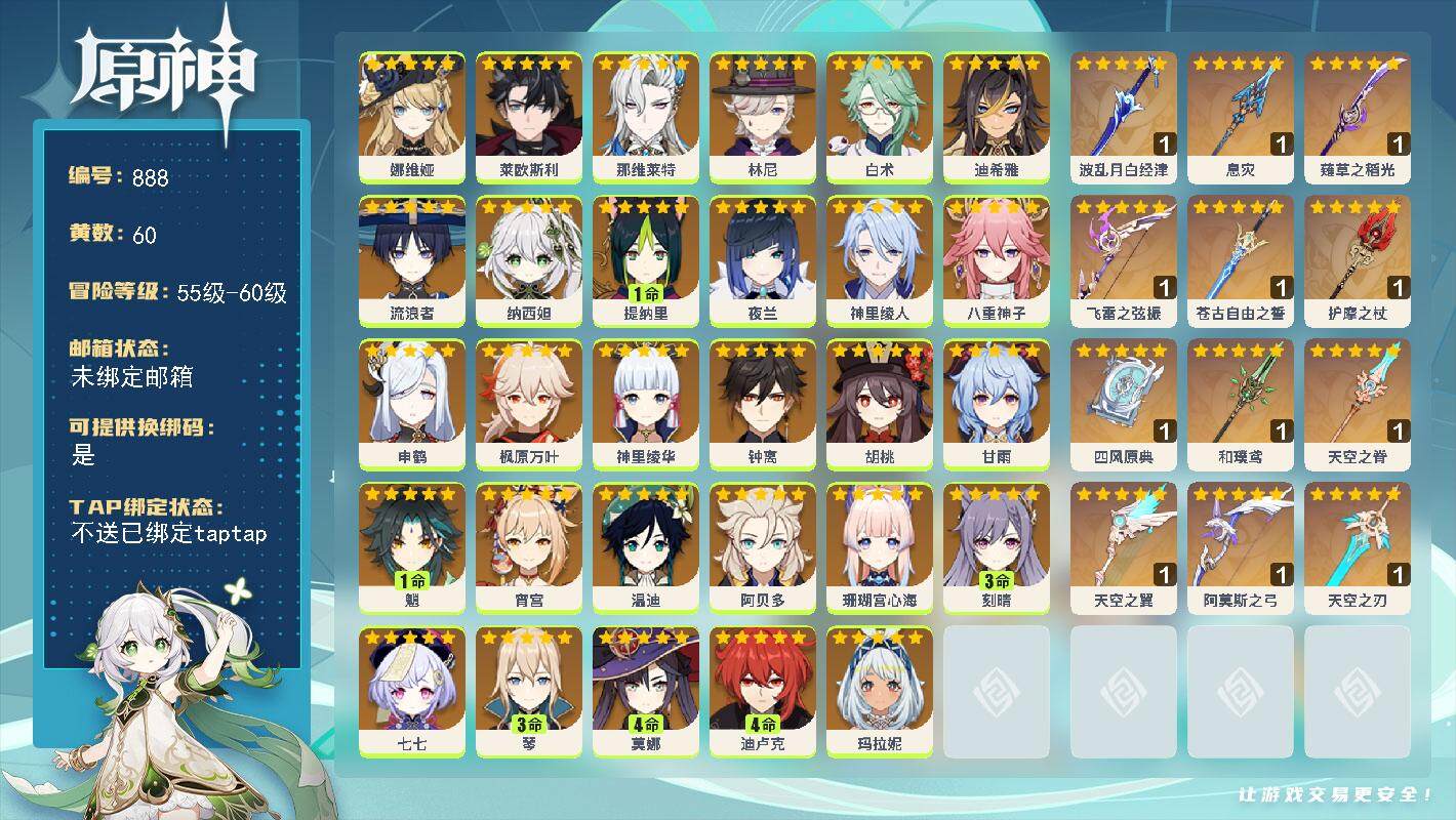 [14081669]60级/60黄/女主/29个五星角色/15个五星武器 0命娜维娅0命莱欧斯利0命那维莱特0命林尼0命白术0命迪希雅0命流浪者0命纳西妲1命提纳里0命夜兰0命神里绫人0命八重神子0命申鹤0命枫原万叶0命神里绫华0命钟离0命胡桃0命甘雨1命魈0命宵宫0命温迪0命阿贝多0命珊瑚宫心海3命刻晴0命七七3命琴4命莫娜4命迪卢克0命玛拉妮精1波乱月白经津精1息灾精1薙草之稻光精1飞雷之弦振精1苍古自由之誓精1护摩之杖精1四风原典精1和璞鸢精1天空之脊精1天空之翼精1阿莫斯之弓精1天空之刃