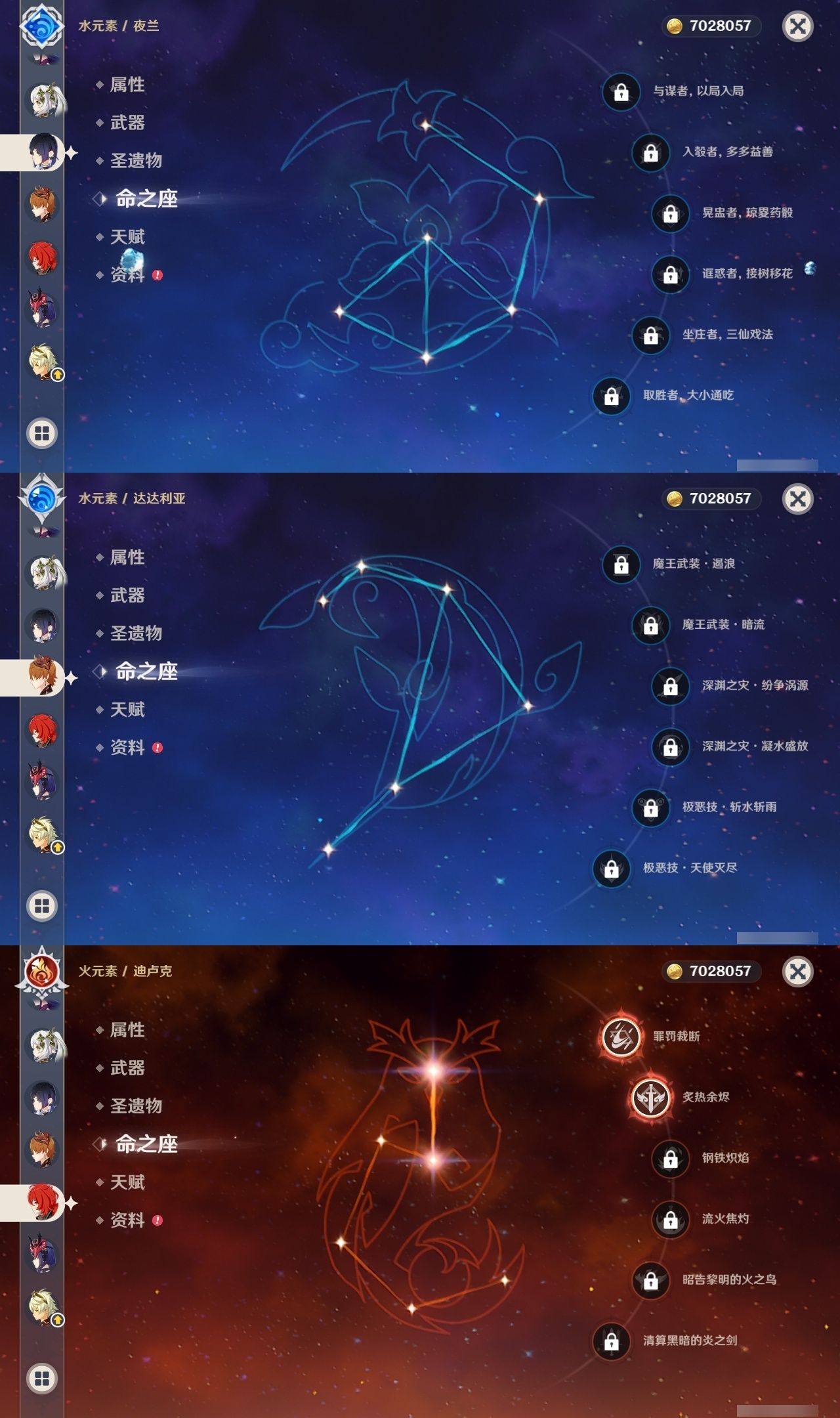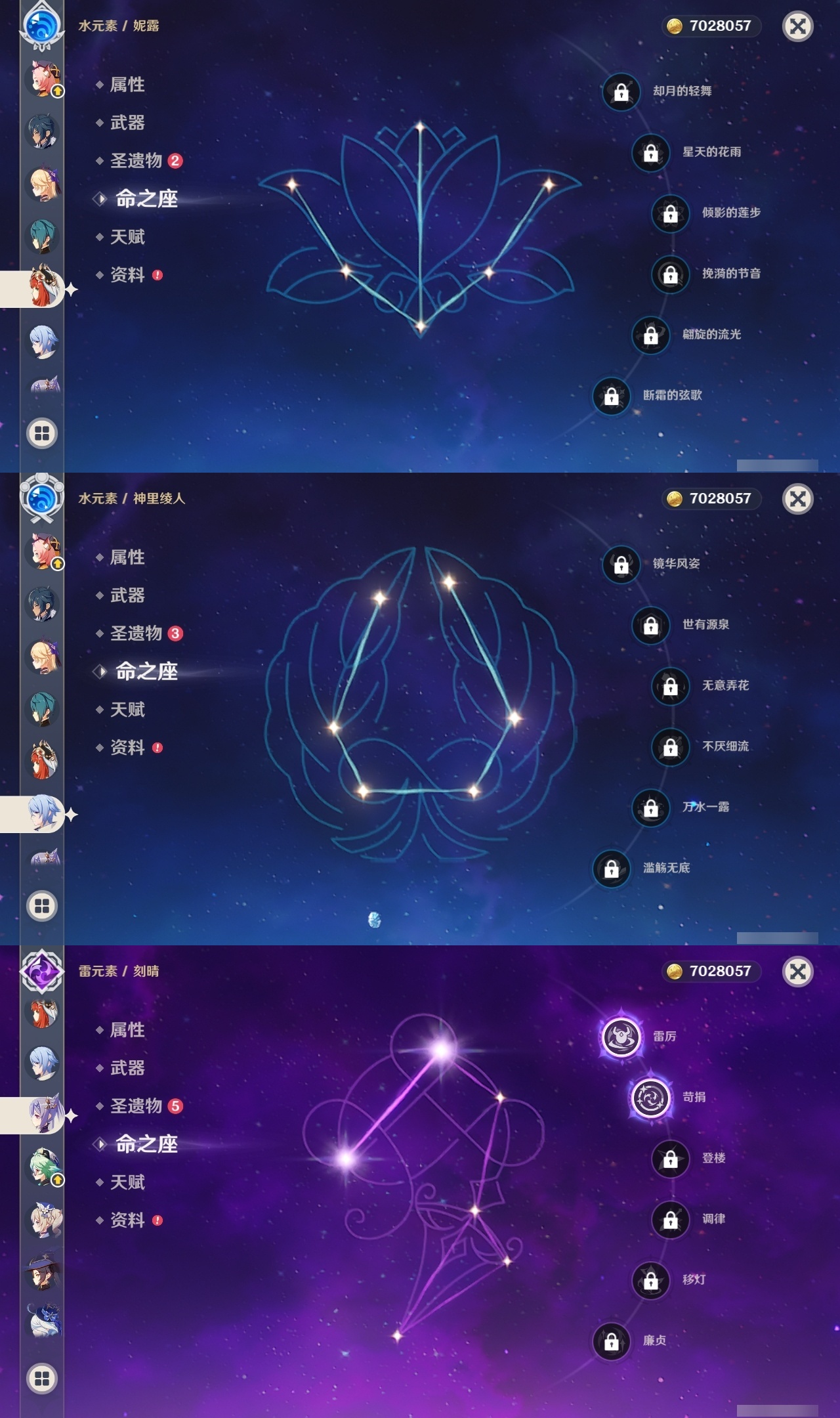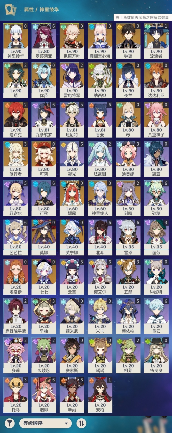 【原神】【lyys8668】冒险等级:58,五星数量:34,五星角色:迪卢克 2命魈 2命刻晴 2命雷电将军 2命流浪者 1命莫娜七七琴珊瑚宫心海神里绫华优菈钟离达达利亚八重神子神里绫人夜兰芙宁娜妮露纳西妲枫原万叶可莉__五星武器:无工之剑 3精天空之卷 2精图莱杜拉的回忆飞雷之弦振护摩之杖四风原典松籁响起之时天空之脊天空之刃雾切之回光薙草之稻光若水__四星角色:行秋 6命九条裟罗 6命香菱 6命凝光 6命砂糖 6命芭芭拉 6命烟绯 6命重云 6命辛焱 6命诺艾尔 6命罗莎莉亚 6命雷泽 6命北斗 6命班尼特 5命莱依拉 5命云堇 5命菲谢尔 5命迪奥娜 3命早柚 3命托马 3命五郎 3命久岐忍 2命鹿野院平藏 2命珐露珊 2命多莉 2命柯莱 2命埃洛伊绮良良瑶瑶米卡菲米尼琳妮特赛索斯