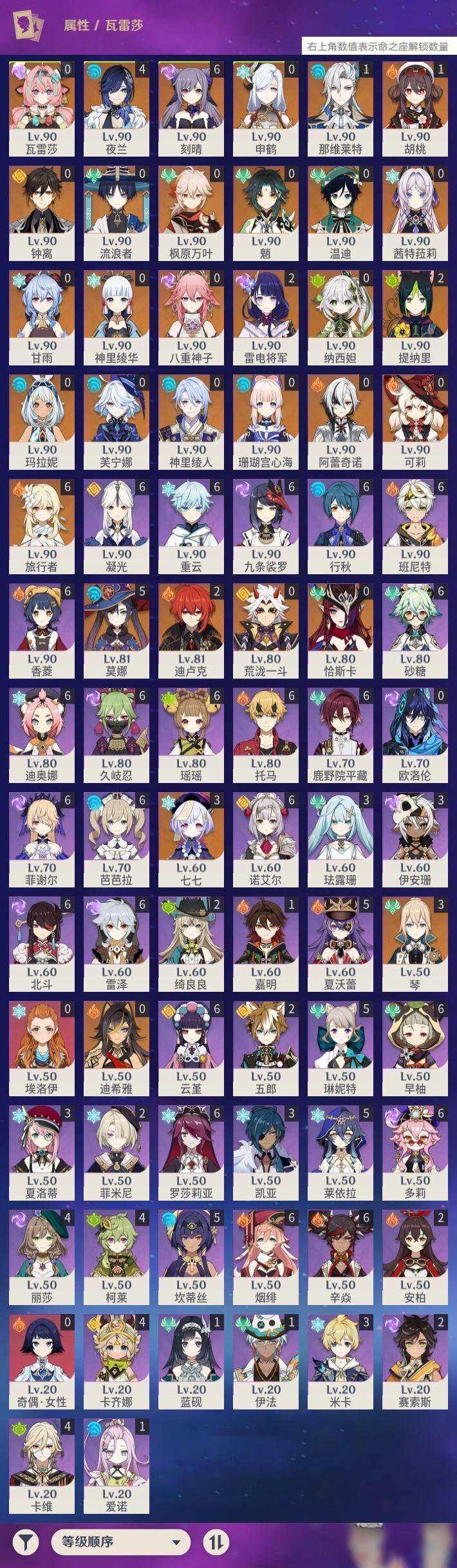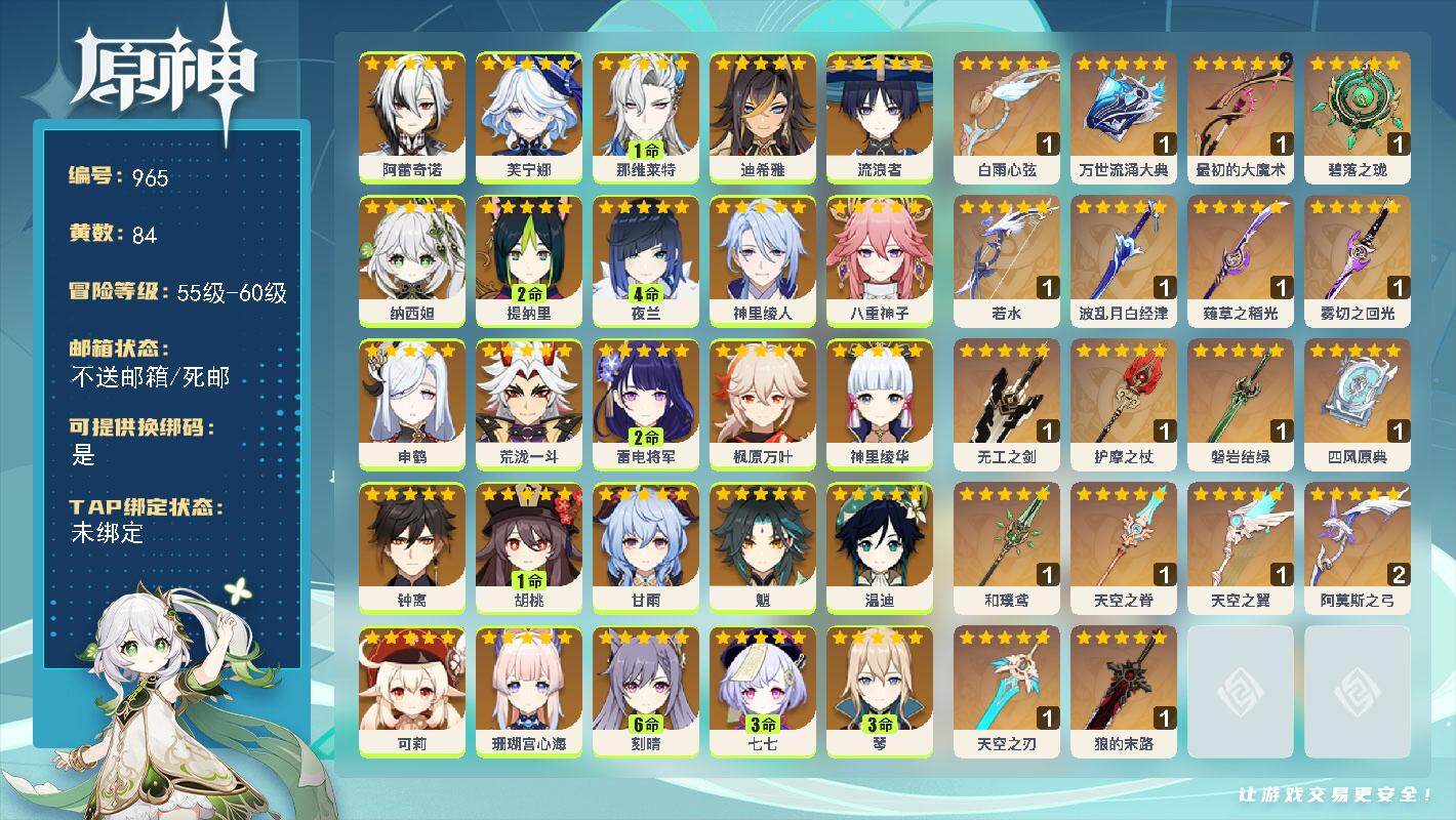 [14328913]60级/84黄/女主/31个五星角色/23个五星武器 0命阿蕾奇诺0命芙宁娜1命那维莱特0命迪希雅0命流浪者0命纳西妲2命提纳里4命夜兰0命神里绫人0命八重神子0命申鹤0命荒泷一斗2命雷电将军0命枫原万叶0命神里绫华0命钟离1命胡桃0命甘雨0命魈0命温迪0命可莉0命珊瑚宫心海满命刻晴3命七七3命琴5命莫娜2命迪卢克0命玛拉妮0命恰斯卡0命茜特菈莉0命瓦雷莎精1白雨心弦精1万世流涌大典精1最初的大魔术精1碧落之珑精1若水精1波乱月白经津精1薙草之稻光精1雾切之回光精1无工之剑精1护摩之杖精1磐岩结绿精1四风原典精1和璞鸢精1天空之脊精1天空之翼精2阿莫斯之弓精1天空之刃精1狼的末路