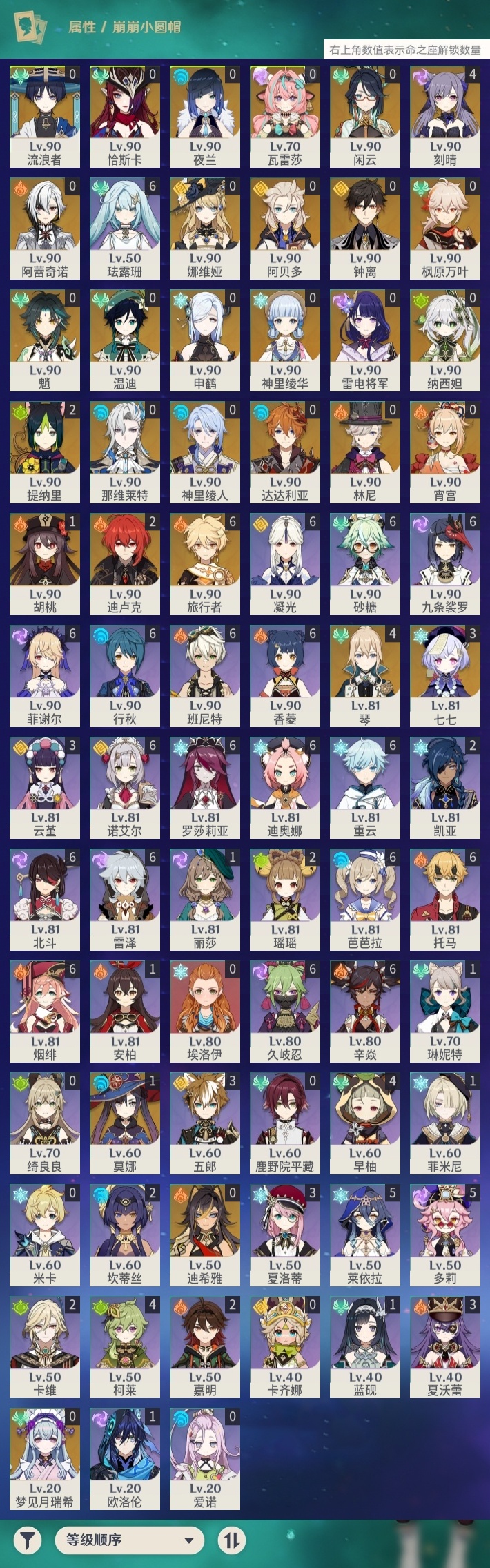 【原神】【lyys8995】冒险等级:60,五星数量:46,五星角色:刻晴 4命琴 4命七七 3命迪卢克 2命提纳里 2命胡桃 1命莫娜 1命神里绫华温迪恰斯卡宵宫迪希雅钟离达达利亚梦见月瑞希申鹤瓦雷莎神里绫人林尼阿贝多那维莱特夜兰娜维娅闲云阿蕾奇诺纳西妲流浪者枫原万叶魈雷电将军__五星武器:星鹫赤羽最初的大魔术裁断飞雷之弦振风鹰剑和璞鸢磐岩结绿四风原典天空之傲天空之刃天空之翼雾切之回光斫峰之刃波乱月白经津若水__四星角色:班尼特 6命行秋 6命九条裟罗 6命香菱 6命久岐忍 6命珐露珊 6命凝光 6命迪奥娜 6命砂糖 6命芭芭拉 6命托马 6命烟绯 6命重云 6命辛焱 6命诺艾尔 6命罗莎莉亚 6命雷泽 6命菲谢尔 6命北斗 6命莱依拉 5命多莉 5命柯莱 4命早柚 4命云堇 3命五郎 3命夏洛蒂 3命夏沃蕾 3命瑶瑶 2命坎蒂丝 2命卡维 2命嘉明 2命欧洛伦 1命蓝砚 1命菲米尼 1命琳妮特 1命埃洛伊卡齐娜鹿野院平藏绮良良米卡爱诺