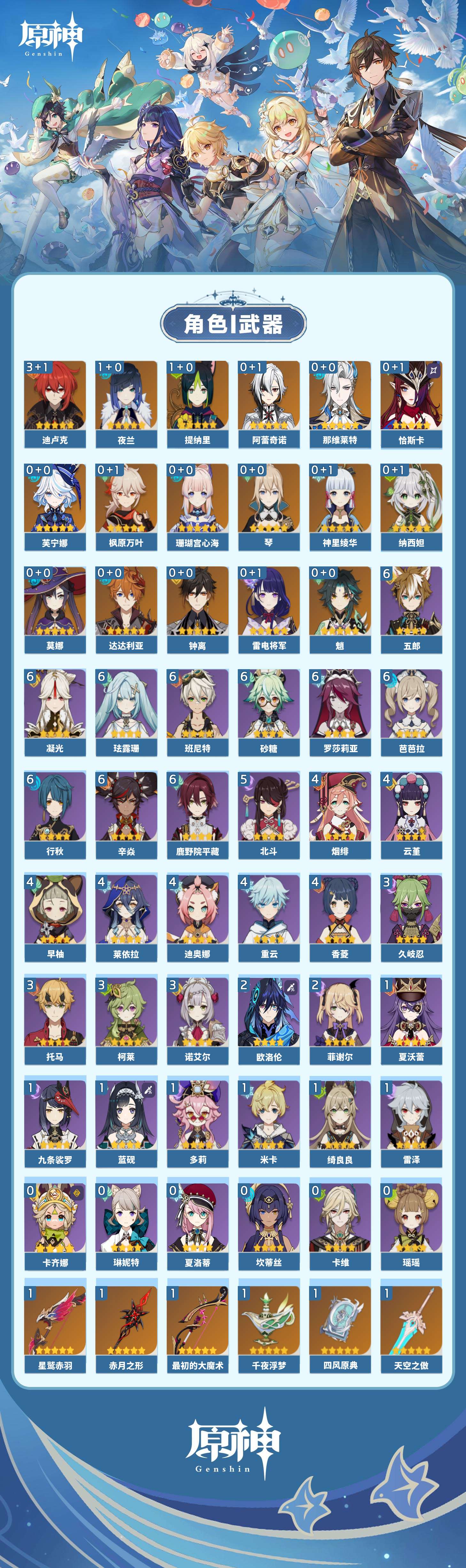 【原神】【lyys9000】冒险等级:60,五星数量:31,五星角色:迪卢克 3命夜兰 1命提纳里 1命莫娜琴珊瑚宫心海神里绫华恰斯卡钟离达达利亚那维莱特芙宁娜阿蕾奇诺纳西妲枫原万叶魈雷电将军__五星武器:星鹫赤羽最初的大魔术赤月之形裁叶萃光阿莫斯之弓苍古自由之誓狼的末路四风原典天空之傲天空之卷天空之刃雾切之回光薙草之稻光千夜浮梦__四星角色:班尼特 6命行秋 6命鹿野院平藏 6命珐露珊 6命凝光 6命砂糖 6命芭芭拉 6命五郎 6命辛焱 6命罗莎莉亚 6命北斗 5命香菱 4命迪奥娜 4命莱依拉 4命云堇 4命早柚 4命烟绯 4命重云 4命久岐忍 3命柯莱 3命托马 3命诺艾尔 3命欧洛伦 2命菲谢尔 2命九条裟罗 1命绮良良 1命米卡 1命多莉 1命蓝砚 1命雷泽 1命夏沃蕾 1命卡齐娜瑶瑶坎蒂丝卡维琳妮特夏洛蒂