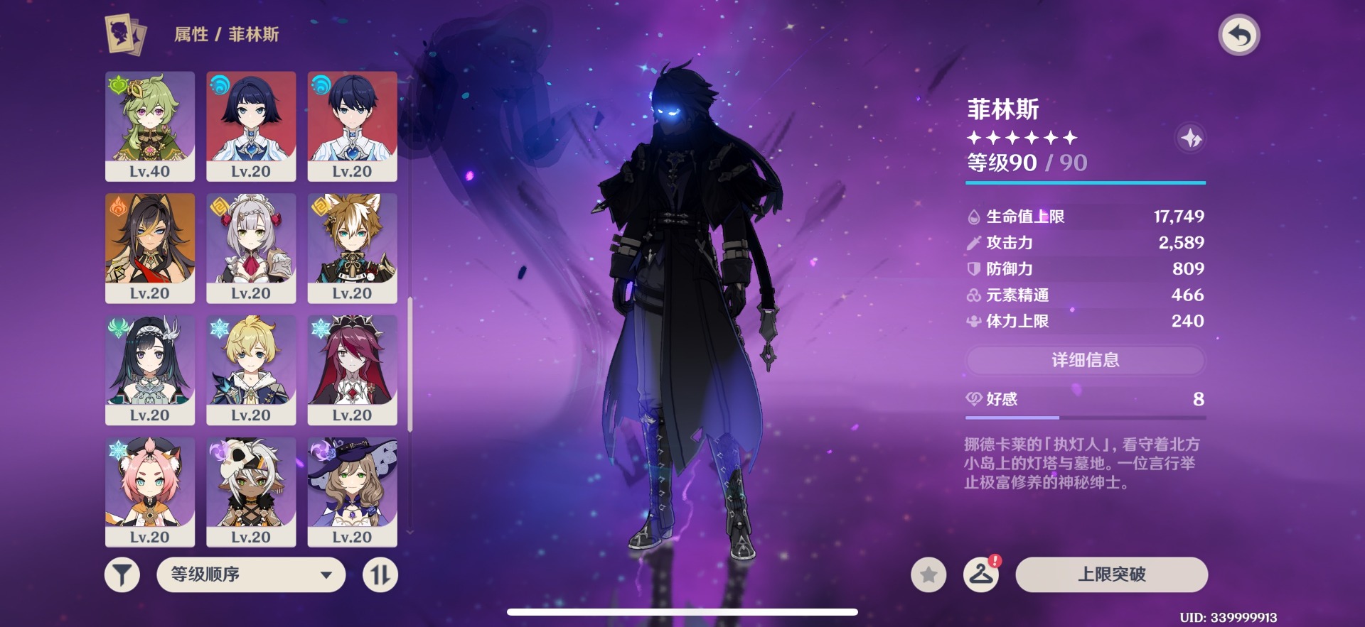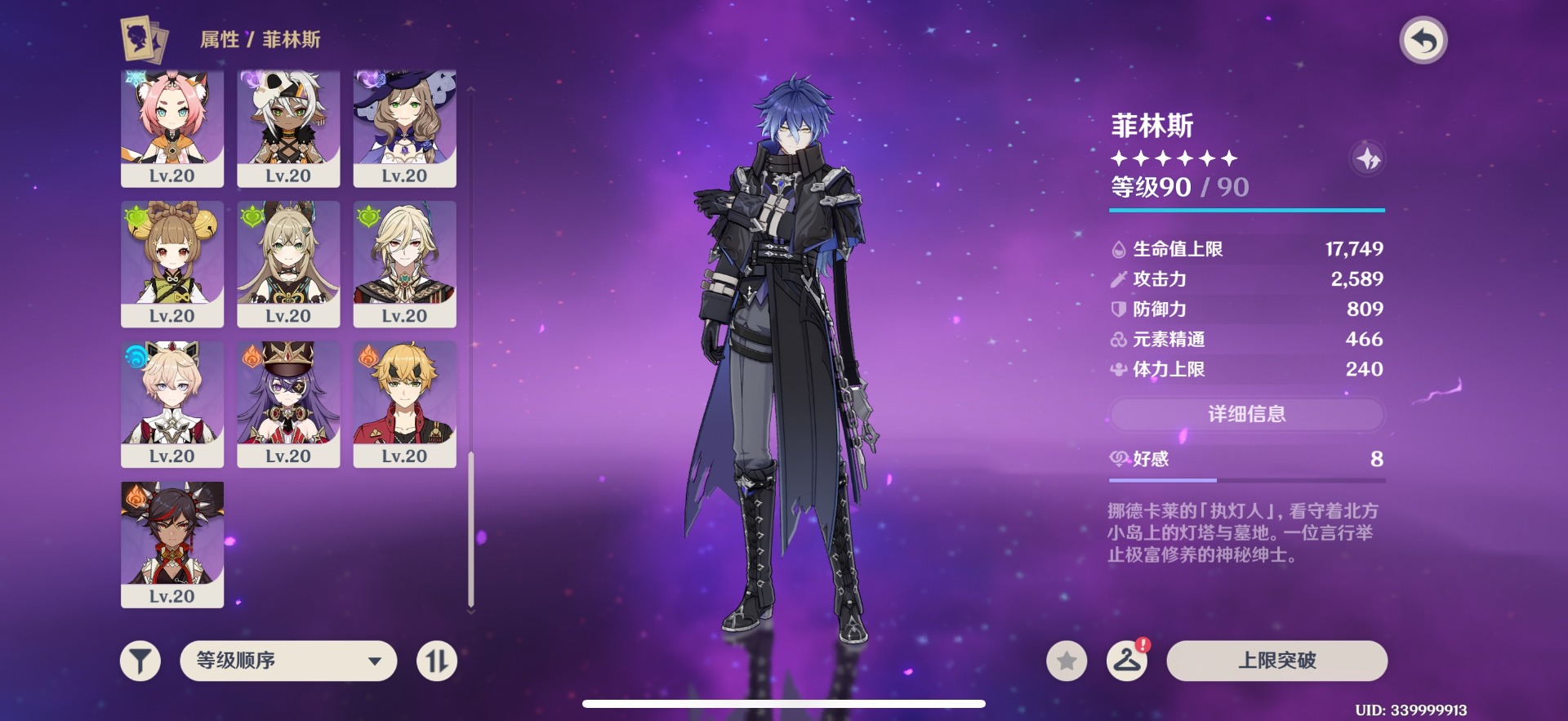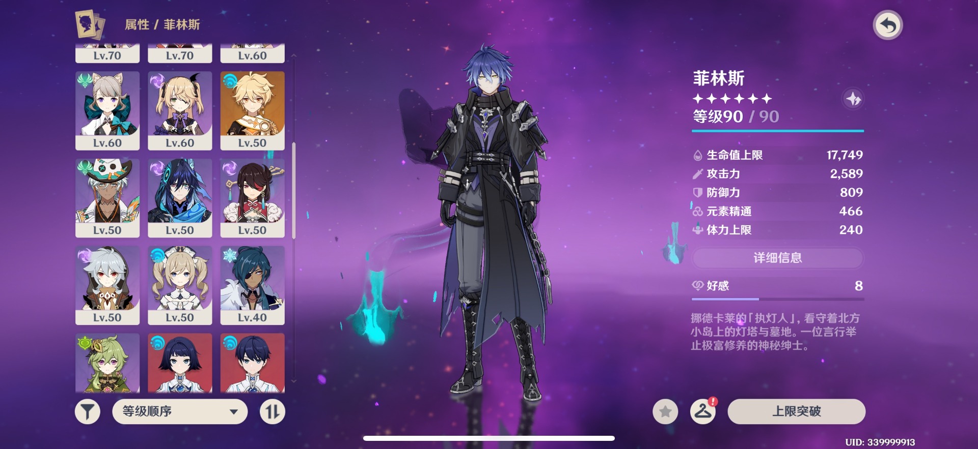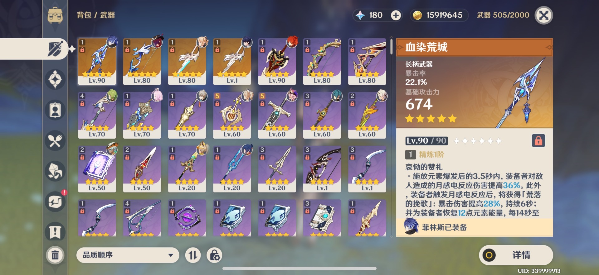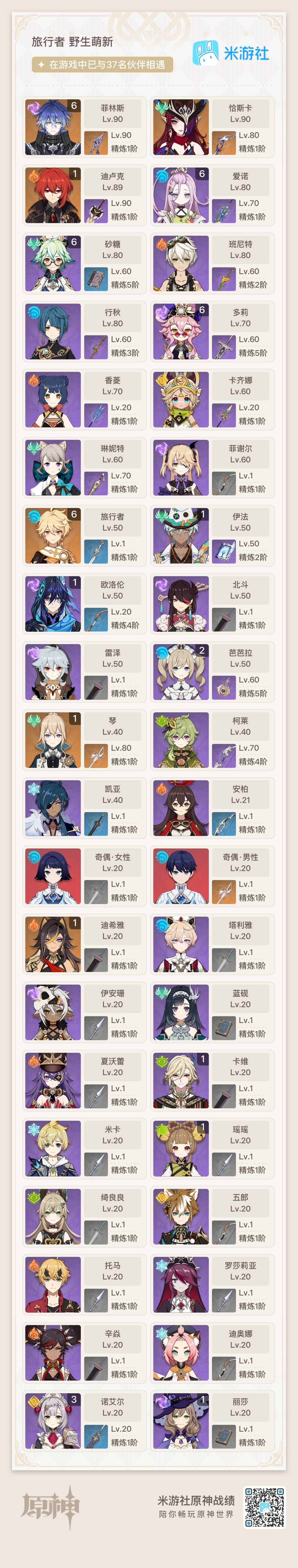[14493603]【总黄数】:14 【冒险等级】:56 【6命金色角色】:满命菲林斯 【1命金色角色】:一命迪希雅一命迪卢克一命琴 【0命金色角色】:恰斯卡