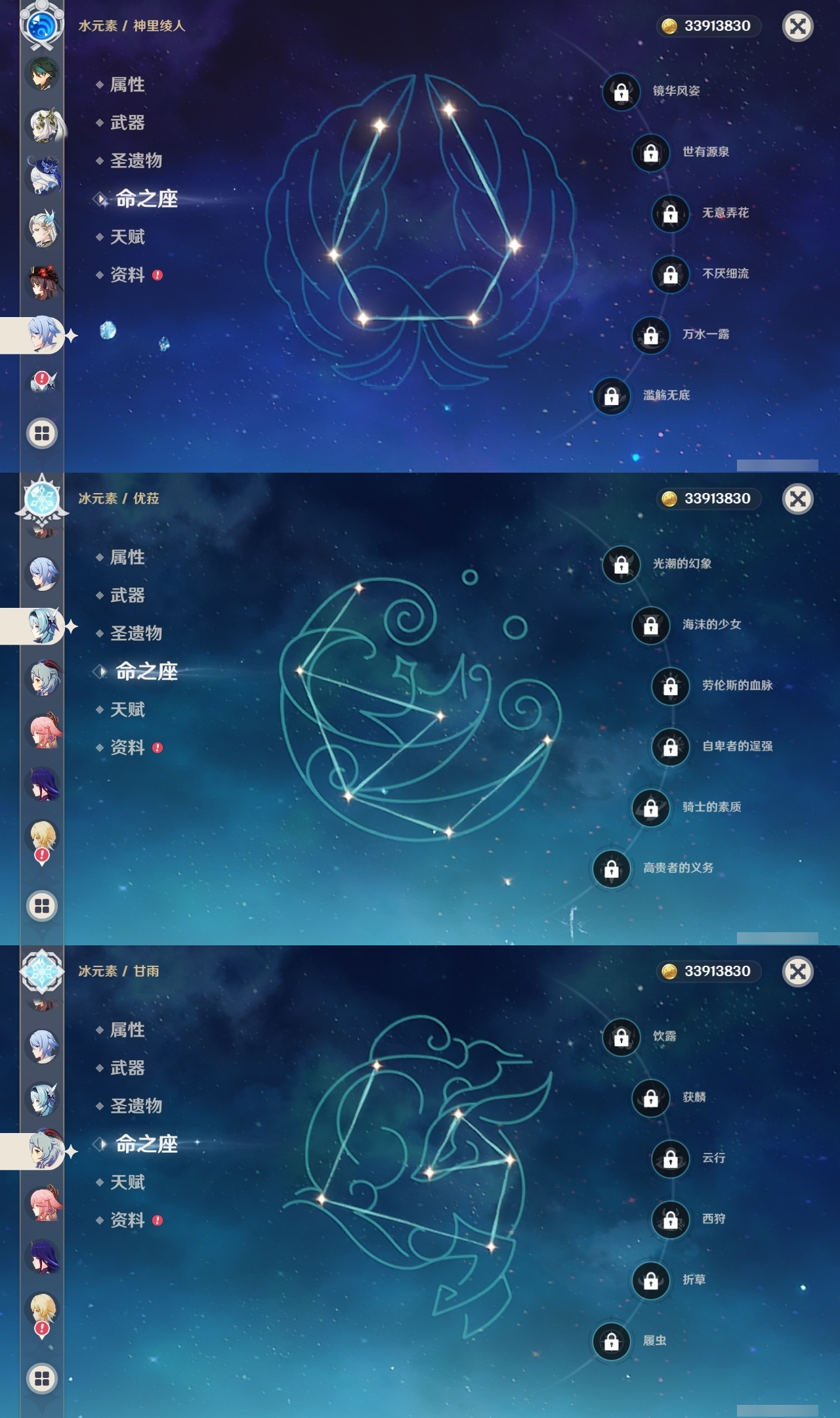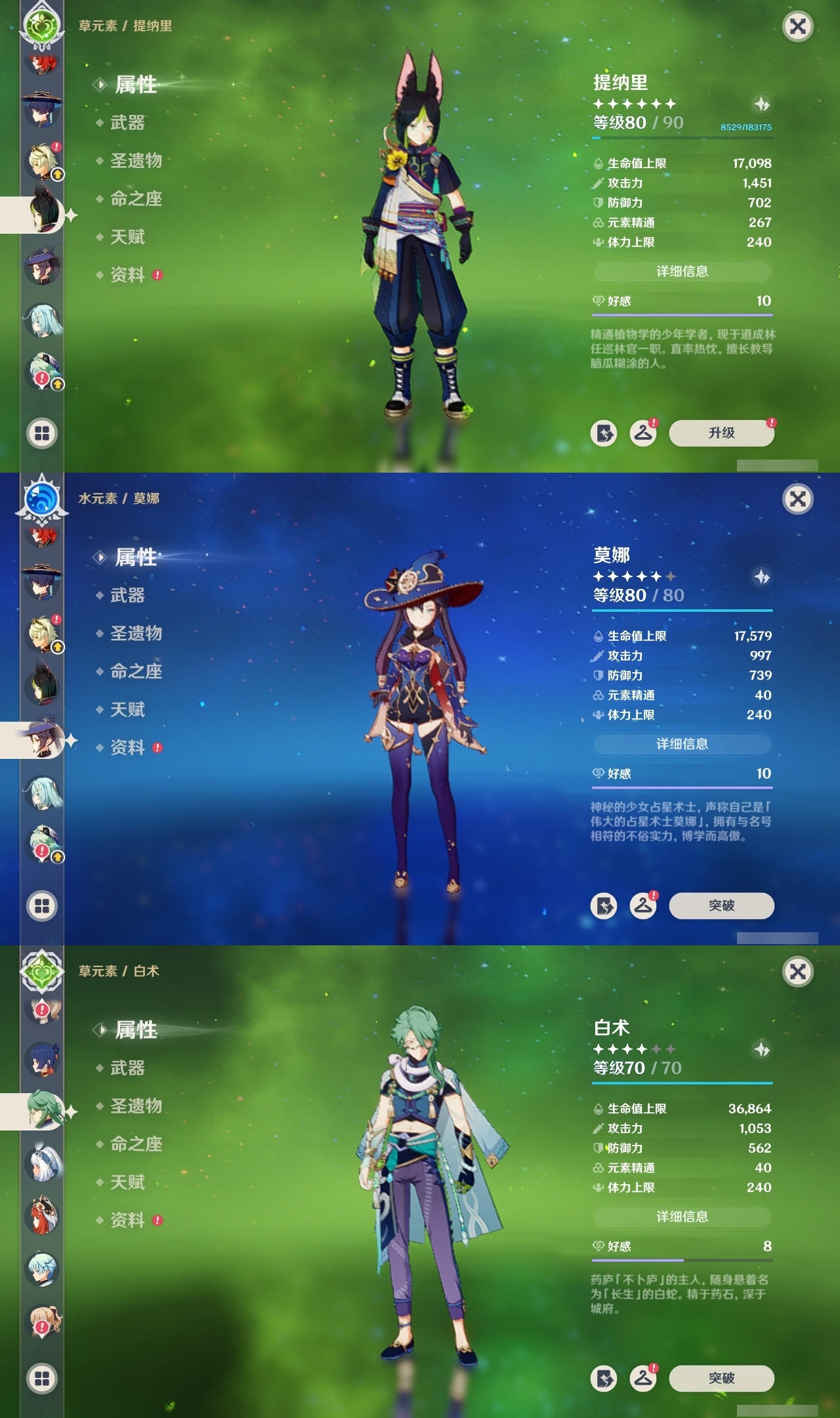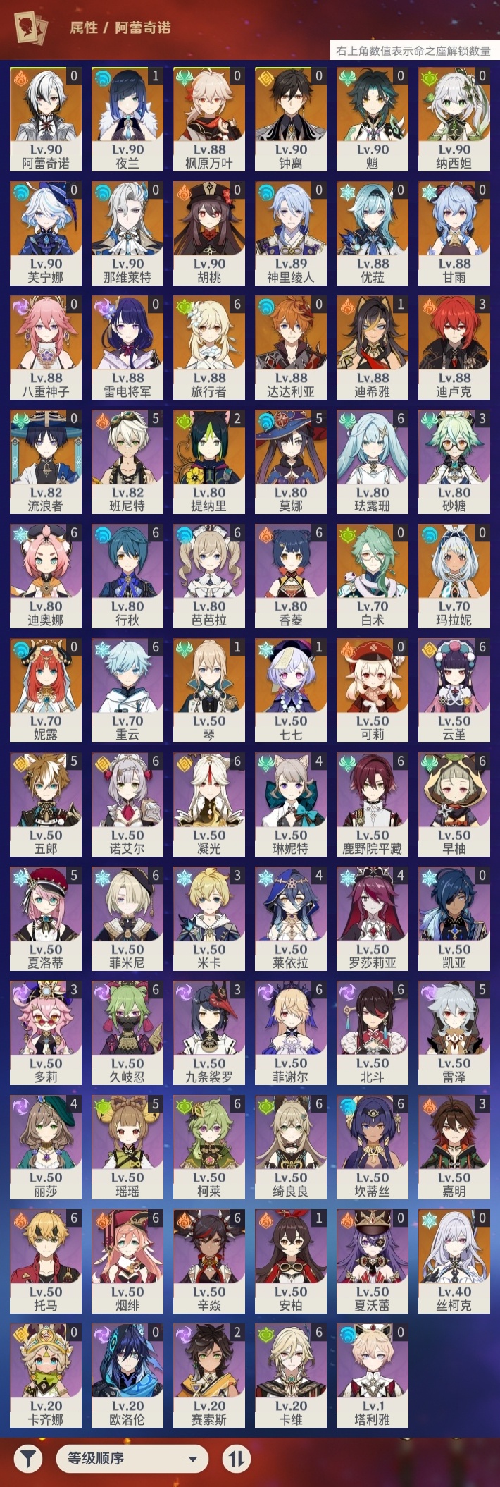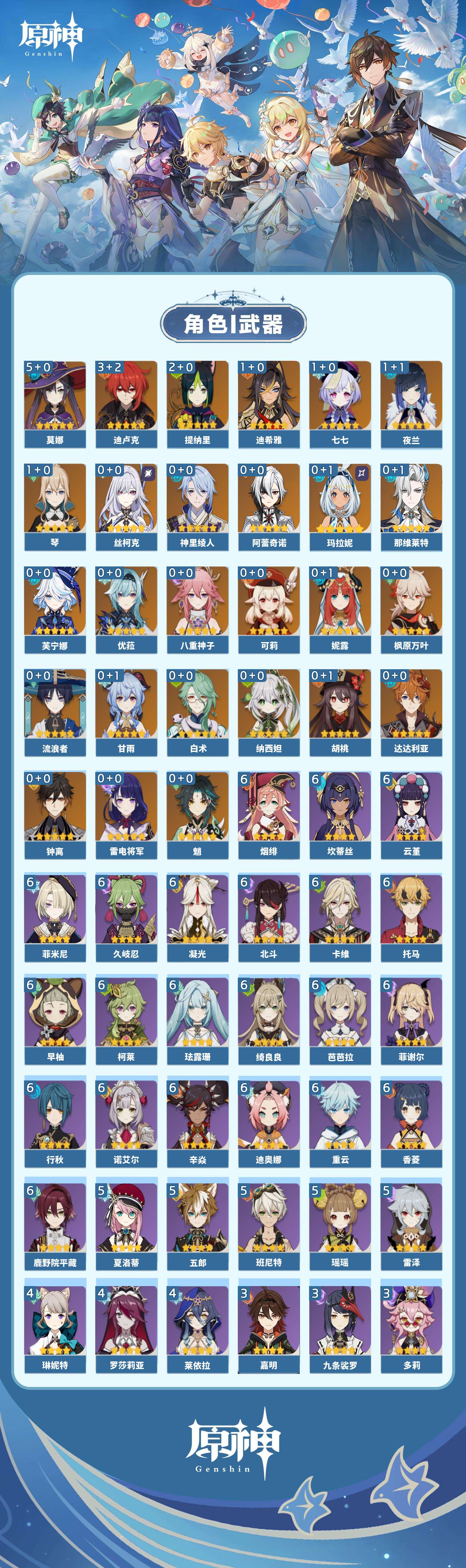 【原神】【lyys9095】冒险等级:60,五星数量:38,五星角色:莫娜 5命迪卢克 3命提纳里 2命迪希雅 1命七七 1命琴 1命夜兰 1命玛拉妮白术优菈钟离达达利亚八重神子神里绫人那维莱特芙宁娜阿蕾奇诺丝柯克妮露纳西妲流浪者枫原万叶甘雨魈胡桃可莉雷电将军__五星武器:狼的末路 2精冲浪时光万世流涌大典阿莫斯之弓飞雷之弦振护摩之杖天空之卷天空之刃天空之翼若水圣显之钥__四星角色:行秋 6命香菱 6命久岐忍 6命鹿野院平藏 6命珐露珊 6命凝光 6命迪奥娜 6命绮良良 6命坎蒂丝 6命柯莱 6命卡维 6命芭芭拉 6命云堇 6命早柚 6命托马 6命烟绯 6命重云 6命辛焱 6命诺艾尔 6命菲谢尔 6命北斗 6命菲米尼 6命班尼特 5命瑶瑶 5命五郎 5命雷泽 5命夏洛蒂 5命莱依拉 4命罗莎莉亚 4命琳妮特 4命九条裟罗 3命砂糖 3命米卡 3命多莉 3命嘉明 3命赛索斯 2命卡齐娜欧洛伦夏沃蕾塔利雅