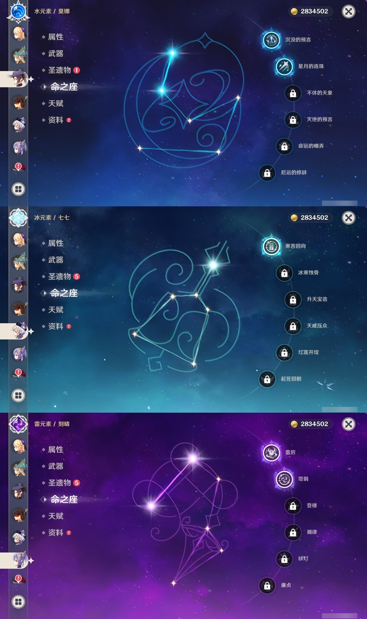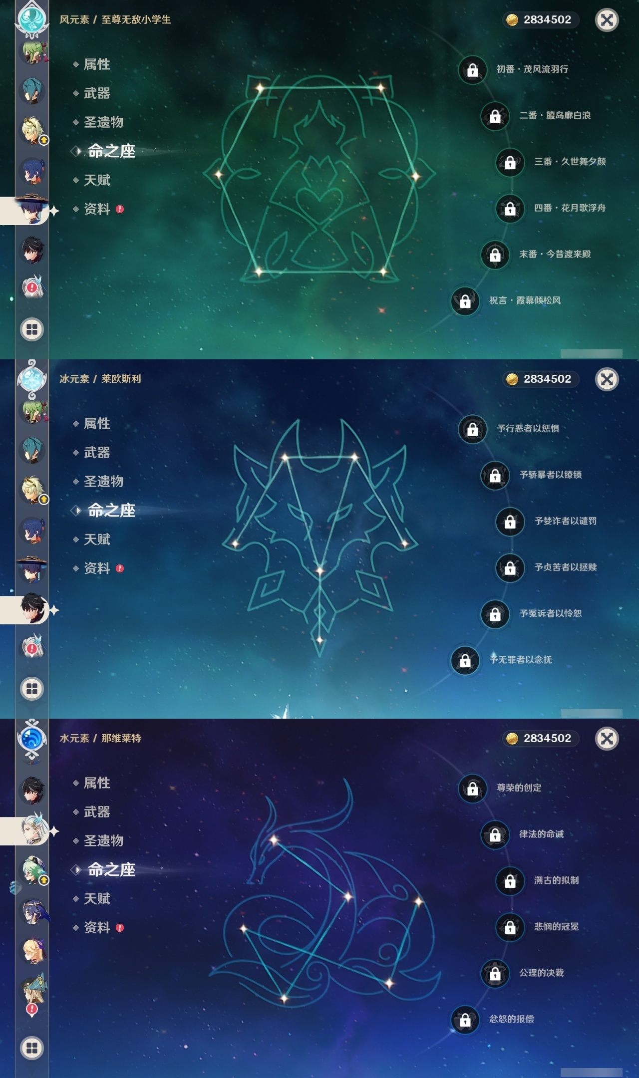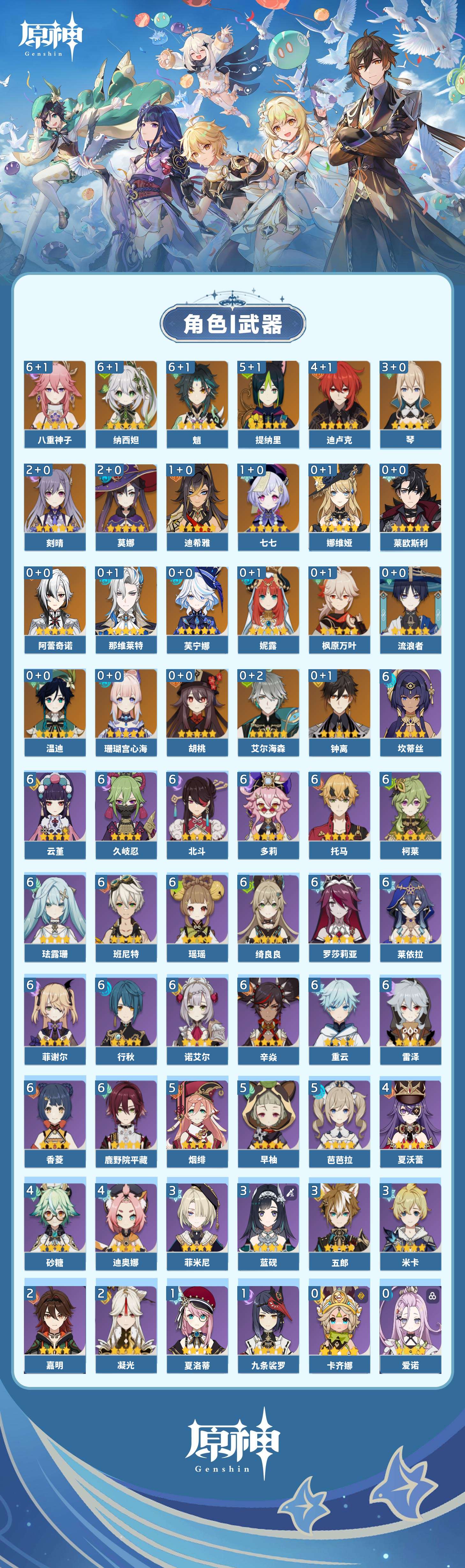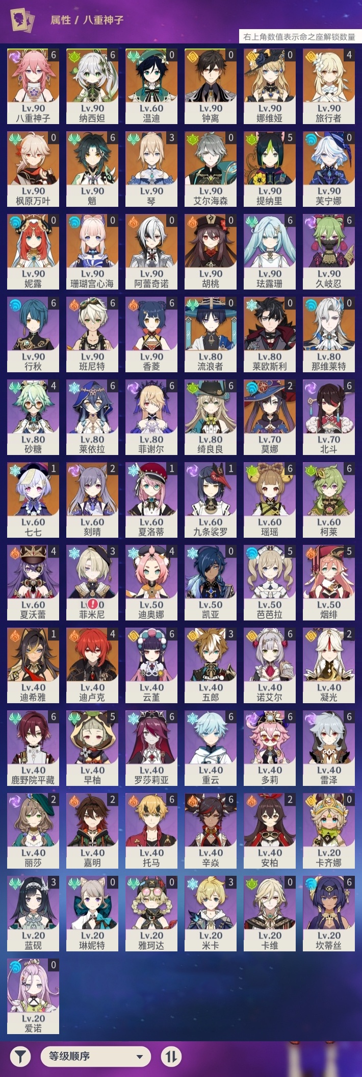 【原神】满命,冒险等级:60,五星数量:36,五星角色:魈 6命八重神子 6命纳西妲 6命提纳里 5命迪卢克 4命琴 3命刻晴 2命莫娜 2命迪希雅 1命七七 1命珊瑚宫心海温迪钟离那维莱特莱欧斯利芙宁娜娜维娅阿蕾奇诺妮露艾尔海森流浪者枫原万叶胡桃__五星武器:天空之脊 2精裁叶萃光 2精万世流涌大典裁断苍古自由之誓飞雷之弦振和璞鸢狼的末路神乐之真意贯虹之槊猎人之径圣显之钥千夜浮梦__四星角色:班尼特 6命行秋 6命香菱 6命久岐忍 6命鹿野院平藏 6命珐露珊 6命绮良良 6命瑶瑶 6命莱依拉 6命坎蒂丝 6命多莉 6命柯莱 6命云堇 6命托马 6命重云 6命辛焱 6命诺艾尔 6命罗莎莉亚 6命雷泽 6命菲谢尔 6命北斗 6命芭芭拉 5命早柚 5命烟绯 5命迪奥娜 4命砂糖 4命夏沃蕾 4命米卡 3命蓝砚 3命五郎 3命菲米尼 3命凝光 2命嘉明 2命九条裟罗 1命夏洛蒂 1命卡齐娜卡维琳妮特爱诺