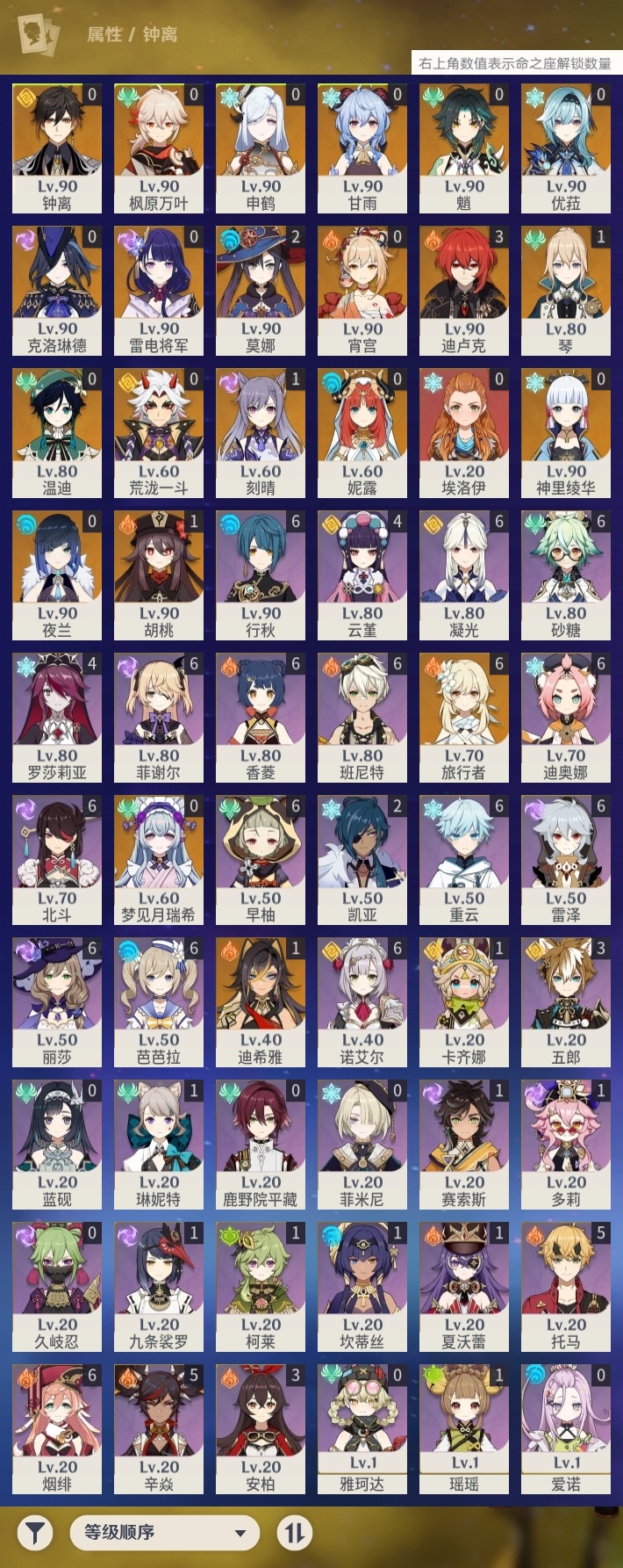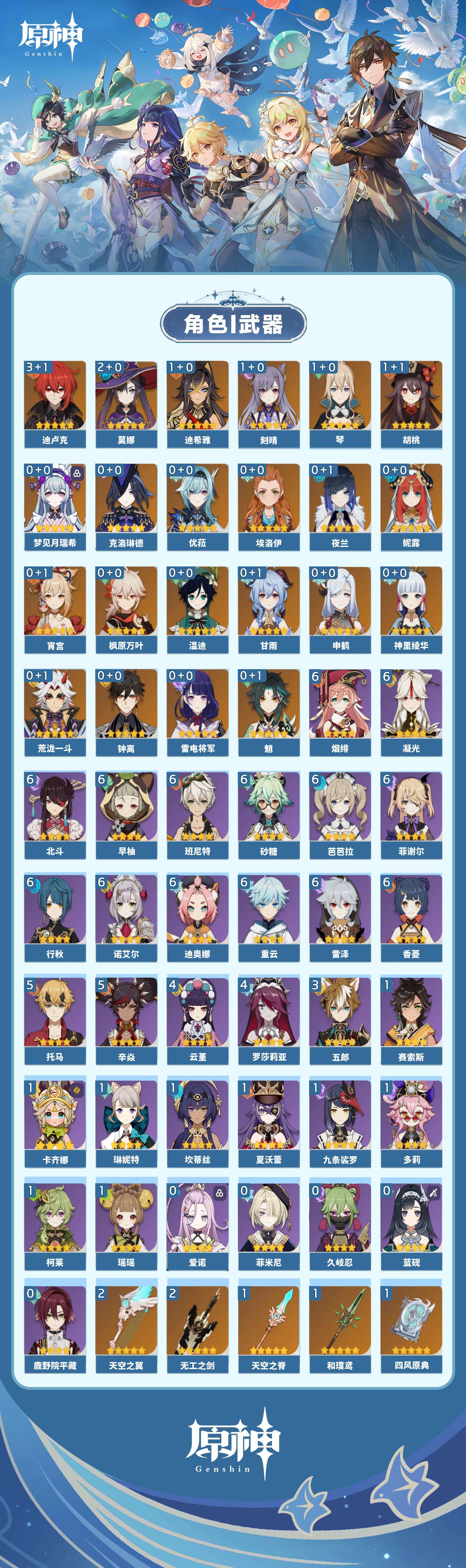 【原神】【lyys9112】冒险等级:59,五星数量:39,五星角色:迪卢克 3命莫娜 2命迪希雅 1命胡桃 1命刻晴 1命琴 1命神里绫华温迪宵宫优菈钟离荒泷一斗梦见月瑞希申鹤夜兰妮露枫原万叶甘雨魈克洛琳德雷电将军__五星武器:天空之翼 2精无工之剑 2精裁叶萃光阿莫斯之弓飞雷之弦振风鹰剑和璞鸢护摩之杖狼的末路磐岩结绿四风原典天空之傲天空之脊天空之卷天空之刃赤角石溃杵若水__四星角色:班尼特 6命行秋 6命香菱 6命凝光 6命迪奥娜 6命砂糖 6命芭芭拉 6命早柚 6命烟绯 6命重云 6命诺艾尔 6命雷泽 6命菲谢尔 6命北斗 6命托马 5命辛焱 5命云堇 4命罗莎莉亚 4命五郎 3命卡齐娜 1命九条裟罗 1命瑶瑶 1命坎蒂丝 1命多莉 1命柯莱 1命琳妮特 1命夏沃蕾 1命赛索斯 1命埃洛伊久岐忍鹿野院平藏蓝砚菲米尼爱诺