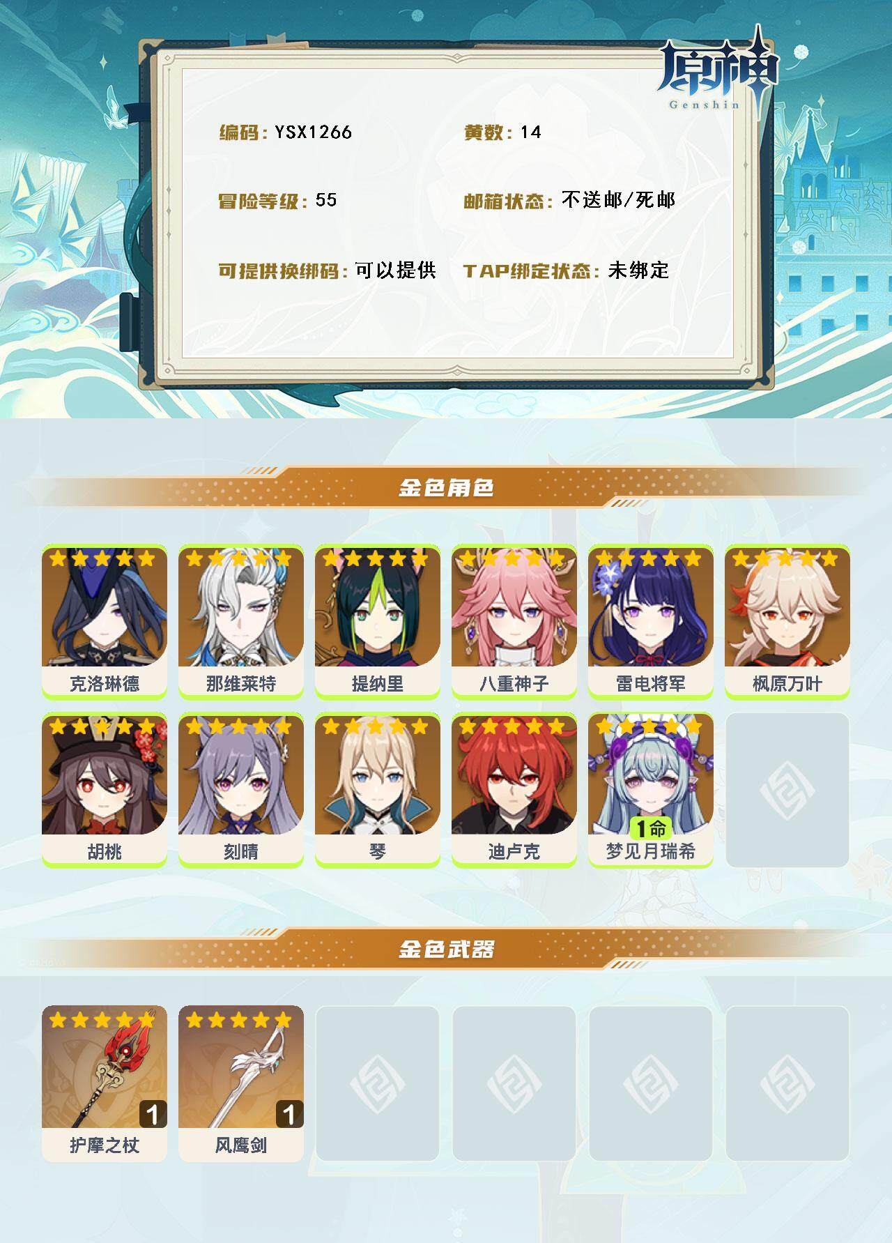 【ysx1266】55级/14黄/女主/11个五星角色/2个五星武器/0命枫原万叶/0命雷电将军/0命八重神子/0命胡桃/0命提纳里/0命刻晴/0命克洛琳德/1命梦见月瑞希/0命琴/0命迪卢克/0命那维莱特/精1护摩之杖/精1风鹰剑