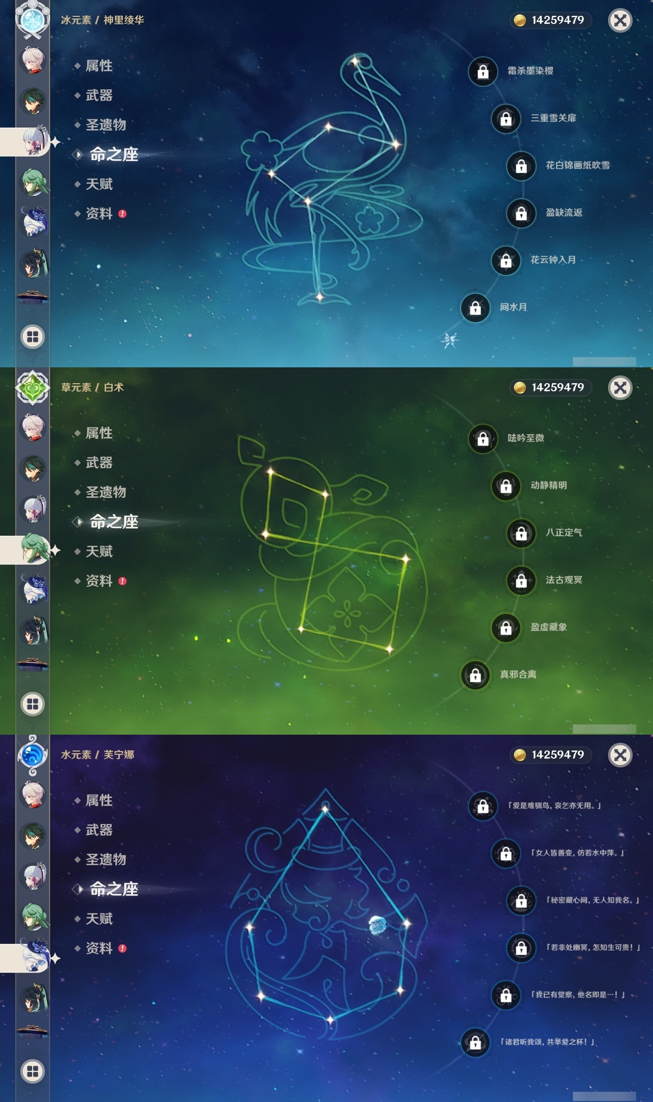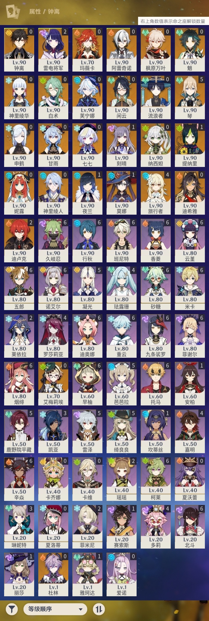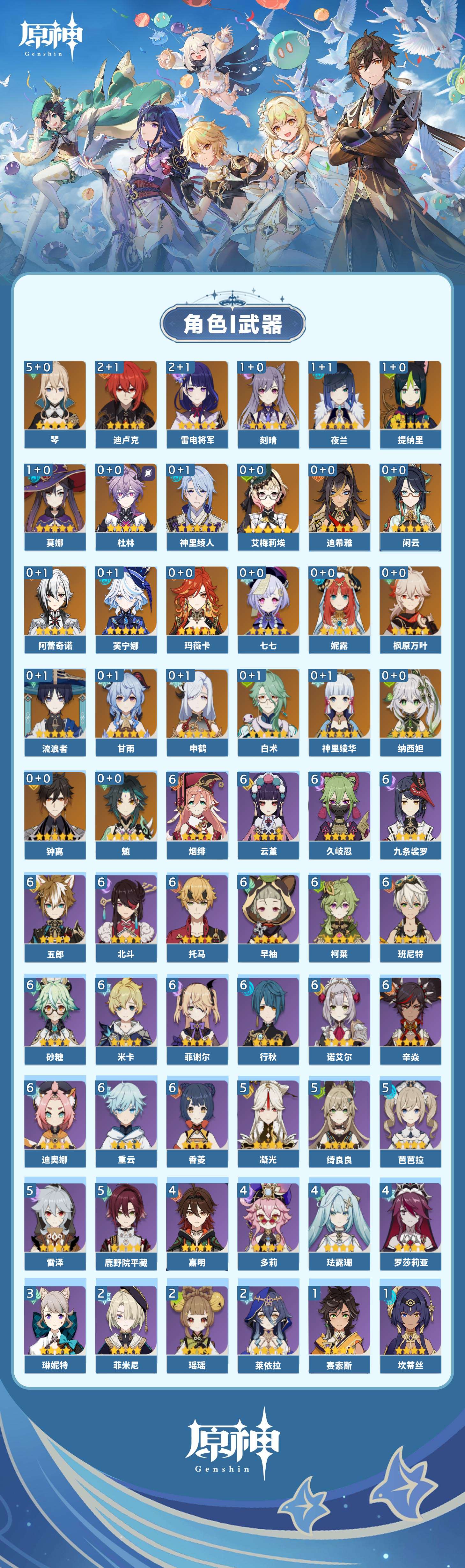 【原神】【lyys9126】冒险等级:60,五星数量:42,五星角色:琴 5命迪卢克 2命雷电将军 2命刻晴 1命莫娜 1命夜兰 1命提纳里 1命七七艾梅莉埃白术神里绫华玛薇卡迪希雅钟离申鹤神里绫人芙宁娜闲云阿蕾奇诺妮露纳西妲流浪者杜林枫原万叶甘雨魈__五星武器:天空之卷 2精碧落之珑最初的大魔术静水流涌之辉赤月之形图莱杜拉的回忆阿莫斯之弓狼的末路天空之傲天空之刃天空之翼雾切之回光薙草之稻光息灾波乱月白经津若水__四星角色:班尼特 6命行秋 6命九条裟罗 6命香菱 6命久岐忍 6命迪奥娜 6命砂糖 6命米卡 6命柯莱 6命云堇 6命早柚 6命托马 6命五郎 6命烟绯 6命重云 6命辛焱 6命诺艾尔 6命菲谢尔 6命北斗 6命鹿野院平藏 5命凝光 5命绮良良 5命芭芭拉 5命雷泽 5命珐露珊 4命多莉 4命罗莎莉亚 4命嘉明 4命琳妮特 3命瑶瑶 2命莱依拉 2命菲米尼 2命坎蒂丝 1命赛索斯 1命卡齐娜卡维夏洛蒂夏沃蕾爱诺