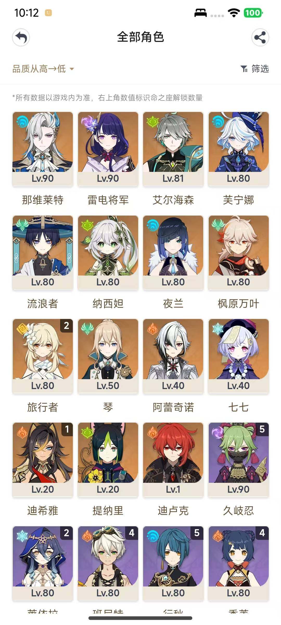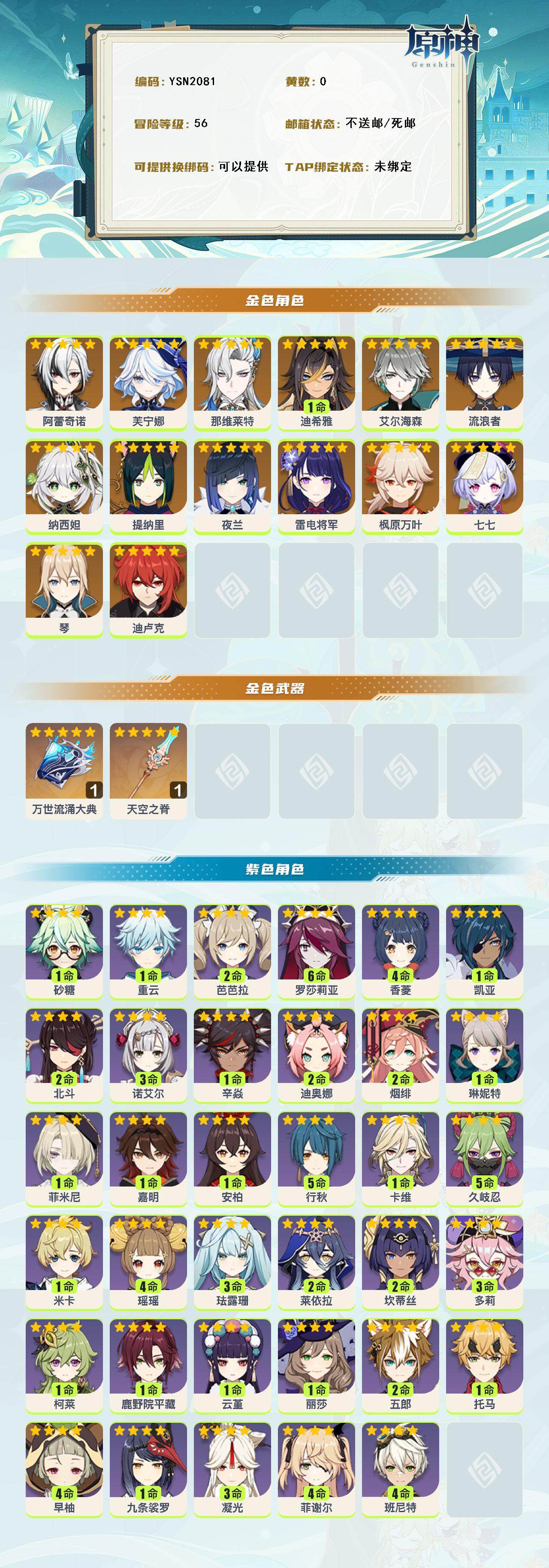 【ysn2081】56级/女主/15个五星角色/0命阿蕾奇诺/0命芙宁娜/0命那维莱特/1命迪希雅/0命艾尔海森/0命流浪者/0命纳西妲/0命提纳里/0命夜兰/0命雷电将军/0命枫原万叶/0命琴/0命迪卢克/0命七七/精1万世流涌大典/精1天空之脊/0命嘉明/0命菲米尼/1命琳妮特/0命卡维/0命米卡/4命瑶瑶/3命珐露珊/2命莱依拉/2命坎蒂丝/3命多莉/1命柯莱/1命鹿野院平藏/5命久岐忍/1命云堇/2命五郎/1命托马/0命九条裟罗/4命早柚/2命烟绯/满命罗莎莉亚/0命辛焱/2命迪奥娜/1命砂糖/4命菲谢尔/1命丽莎/2命北斗/4命香菱/1命安柏/4命班尼特/5命行秋/2命芭芭拉/3命凝光/3命诺艾尔/0命凯亚/1命重云