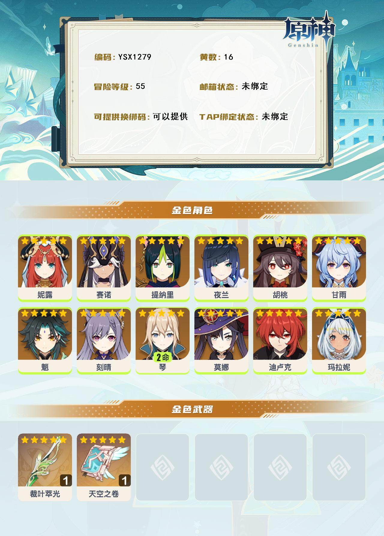 【ysx1279】55级/16黄/女主/12个五星角色/2个五星武器/0命玛拉妮/0命夜兰/0命胡桃/0命赛诺/0命魈/0命甘雨/0命妮露/0命莫娜/0命刻晴/2命琴/0命提纳里/0命迪卢克/精1天空之卷/精1裁叶萃光