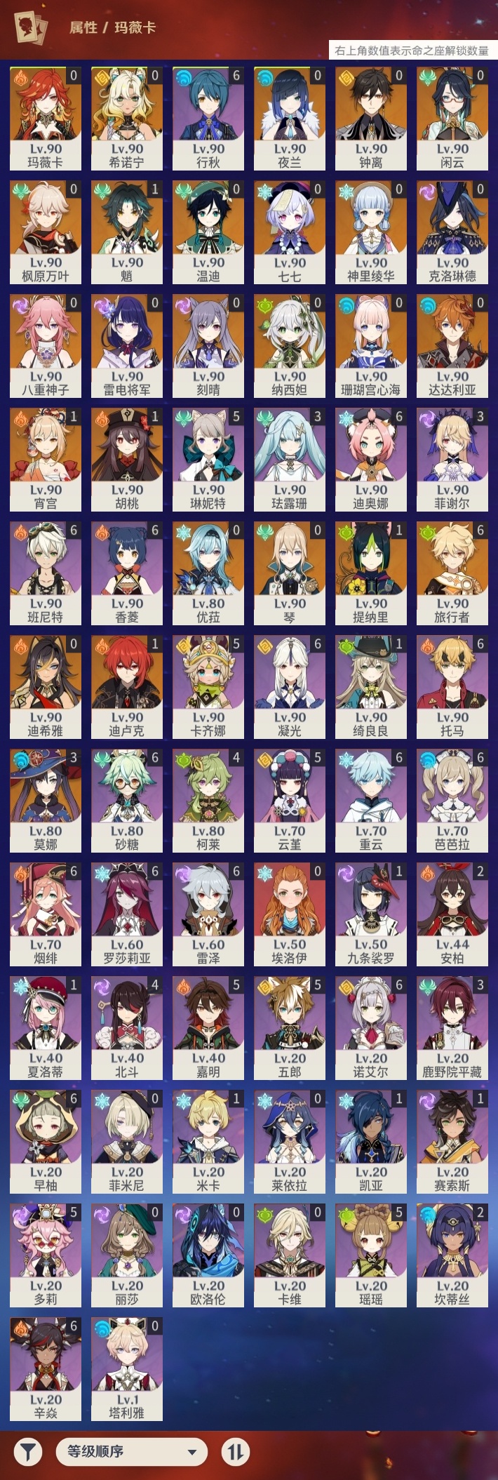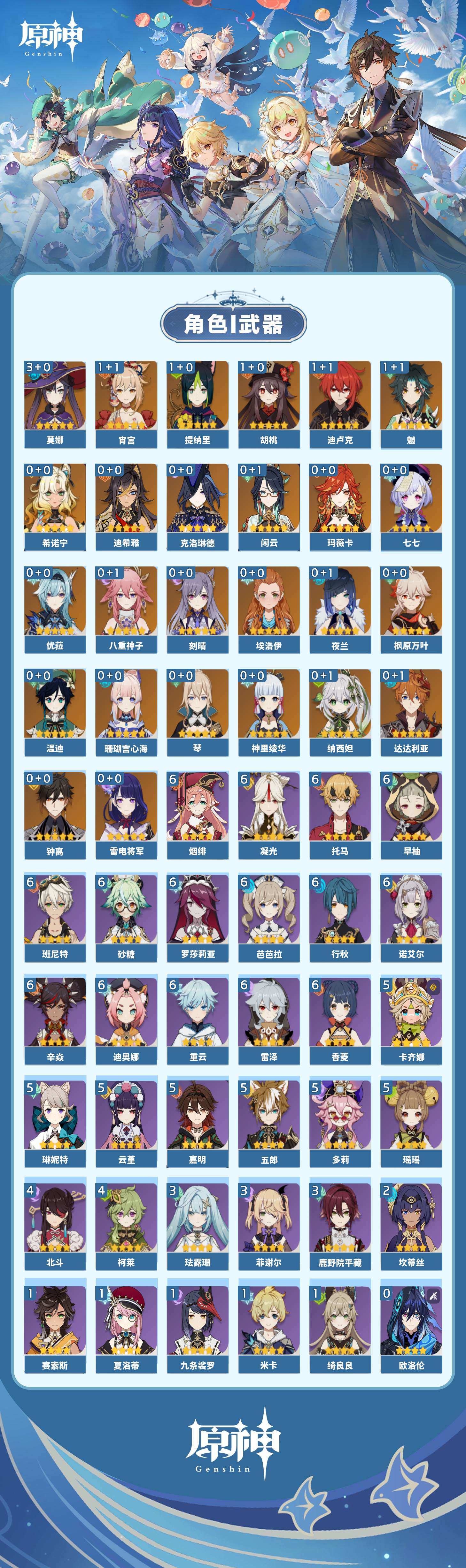 【原神】【lyys9146】冒险等级:60,五星数量:39,五星角色:莫娜 3命迪卢克 1命魈 1命胡桃 1命宵宫 1命提纳里 1命七七琴珊瑚宫心海希诺宁神里绫华温迪玛薇卡优菈迪希雅钟离达达利亚八重神子夜兰闲云纳西妲枫原万叶克洛琳德刻晴雷电将军__五星武器:鹤鸣余音裁叶萃光飞雷之弦振和璞鸢狼的末路四风原典天空之脊天空之卷天空之刃冬极白星神乐之真意若水千夜浮梦__四星角色:班尼特 6命行秋 6命香菱 6命凝光 6命迪奥娜 6命砂糖 6命芭芭拉 6命早柚 6命托马 6命烟绯 6命重云 6命辛焱 6命诺艾尔 6命罗莎莉亚 6命雷泽 6命卡齐娜 5命瑶瑶 5命多莉 5命云堇 5命五郎 5命琳妮特 5命嘉明 5命柯莱 4命北斗 4命鹿野院平藏 3命珐露珊 3命菲谢尔 3命坎蒂丝 2命九条裟罗 1命绮良良 1命米卡 1命夏洛蒂 1命赛索斯 1命埃洛伊莱依拉卡维欧洛伦菲米尼塔利雅