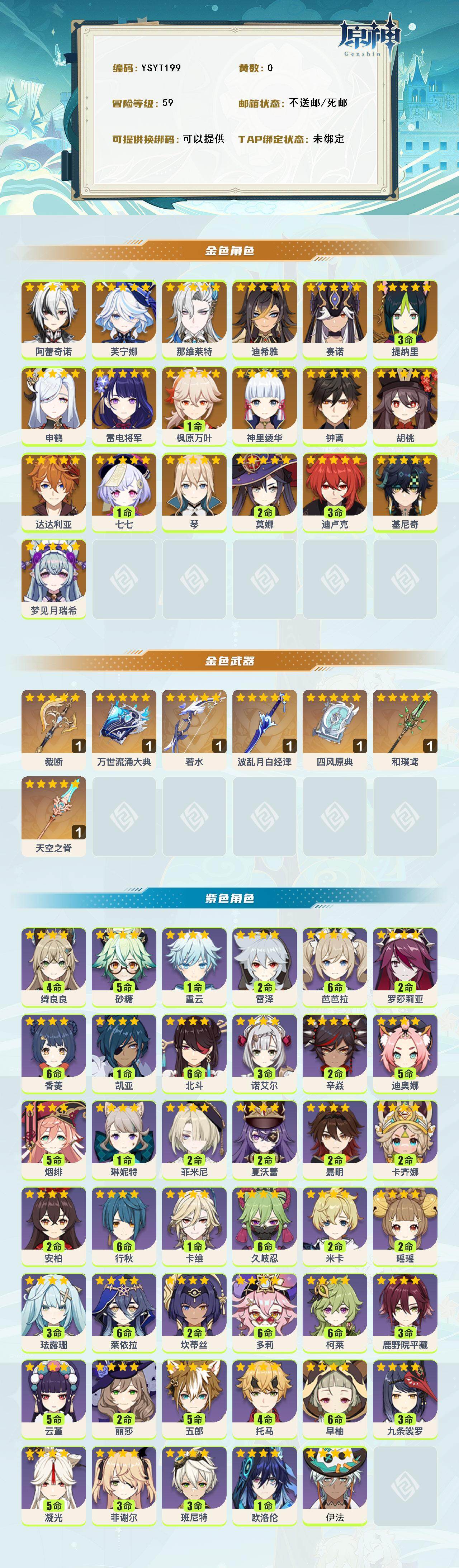 【ysyt199】59级/男主/21个五星角色/0命梦见月瑞希/0命基尼奇/0命阿蕾奇诺/0命芙宁娜/0命那维莱特/0命迪希雅/0命赛诺/3命提纳里/0命申鹤/0命雷电将军/0命神里绫华/1命枫原万叶/0命胡桃/0命钟离/0命达达利亚/0命琴/3命迪卢克/2命莫娜/1命七七/精1裁断/精1万世流涌大典/精1若水/精1波乱月白经津/精1和璞鸢/精1四风原典/精1天空之脊/0命伊法/1命欧洛伦/2命卡齐娜/2命嘉明/2命夏沃蕾/2命菲米尼/0命琳妮特/4命绮良良/0命卡维/2命米卡/2命瑶瑶/3命珐露珊/满命莱依拉/2命坎蒂丝/满命多莉/满命柯莱/3命鹿野院平藏/满命久岐忍/5命云堇/5命五郎/4命托马/3命九条裟罗/满命早柚/5命烟绯/2命罗莎莉亚/2命辛焱/5命迪奥娜/5命砂糖/2命雷泽/3命菲谢尔/2命丽莎/满命北斗/满命香菱/2命安柏/3命班尼特/满命行秋/满命芭芭拉/5命凝光/3命诺艾尔/1命凯亚/1命重云