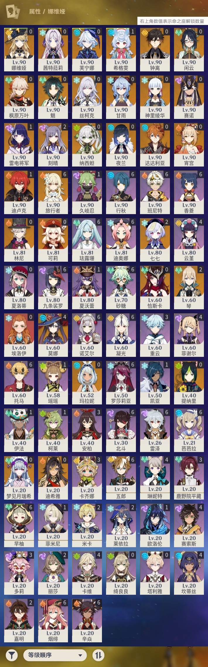 【原神】【lyys9216】冒险等级:60,五星数量:42,五星角色:莫娜 4命刻晴 2命七七 2命琴 2命迪卢克 1命雷电将军 1命希格雯 1命玛拉妮神里绫华恰斯卡茜特菈莉宵宫迪希雅钟离达达利亚梦见月瑞希林尼夜兰芙宁娜娜维娅提纳里闲云赛诺丝柯克纳西妲枫原万叶甘雨魈可莉__五星武器:天空之傲 3精风鹰剑 2精裁叶萃光飞雷之弦振和璞鸢狼的末路四风原典天空之脊终末嗟叹之诗冬极白星息灾若水__四星角色:班尼特 6命行秋 6命九条裟罗 6命香菱 6命珐露珊 6命凝光 6命迪奥娜 6命砂糖 6命芭芭拉 6命早柚 6命托马 6命五郎 6命烟绯 6命辛焱 6命诺艾尔 6命罗莎莉亚 6命雷泽 6命北斗 6命坎蒂丝 4命卡维 4命云堇 4命菲谢尔 4命琳妮特 4命赛索斯 4命卡齐娜 3命鹿野院平藏 3命多莉 3命重云 3命莱依拉 2命米卡 2命嘉明 2命久岐忍 1命瑶瑶 1命柯莱 1命欧洛伦 1命菲米尼 1命夏沃蕾 1命伊法 1命埃洛伊绮良良夏洛蒂塔利雅
