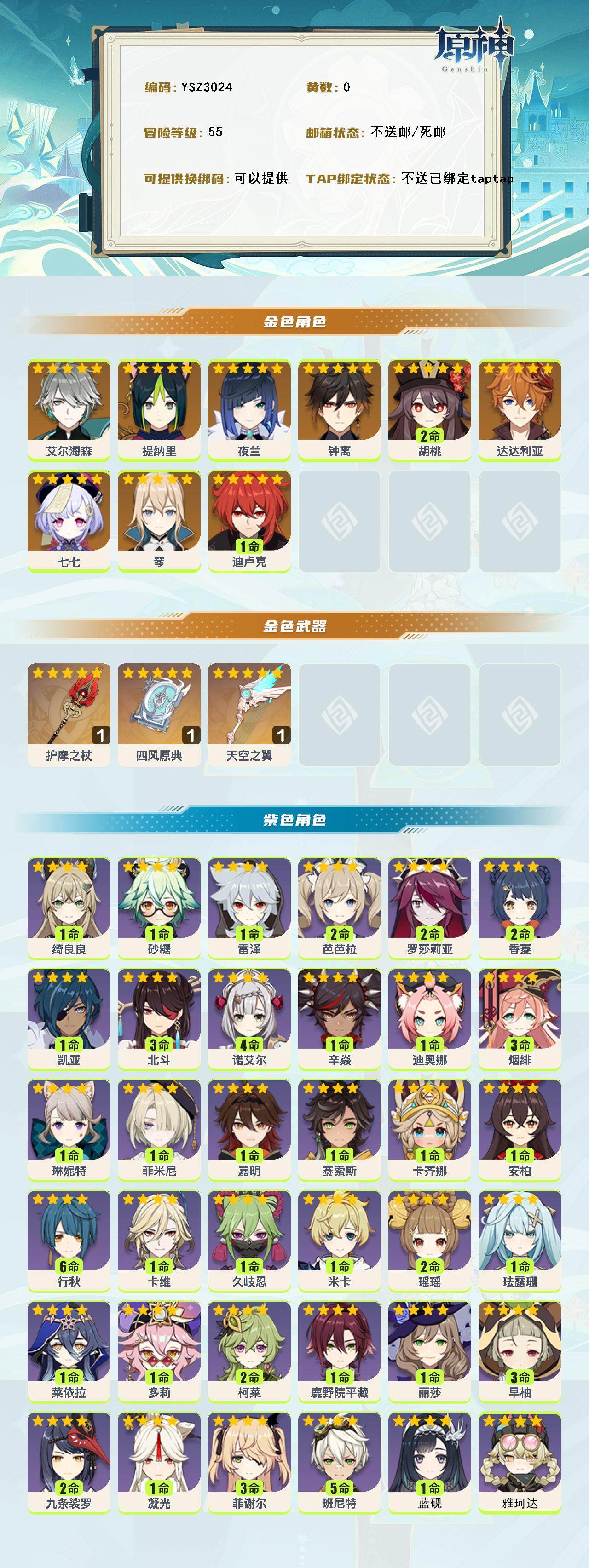 【ysz3024】55级/女主/11个五星角色/0命艾尔海森/0命提纳里/0命夜兰/2命胡桃/0命钟离/0命达达利亚/0命琴/1命迪卢克/0命七七/精1护摩之杖/精1四风原典/精1天空之翼/0命雅珂达/1命蓝砚/1命卡齐娜/0命赛索斯/0命嘉明/0命菲米尼/0命琳妮特/1命绮良良/1命卡维/0命米卡/2命瑶瑶/1命珐露珊/1命莱依拉/1命多莉/2命柯莱/1命鹿野院平藏/0命久岐忍/2命九条裟罗/3命早柚/3命烟绯/2命罗莎莉亚/1命辛焱/1命迪奥娜/1命砂糖/0命雷泽/3命菲谢尔/0命丽莎/3命北斗/2命香菱/0命安柏/5命班尼特/满命行秋/2命芭芭拉/0命凝光/4命诺艾尔/1命凯亚