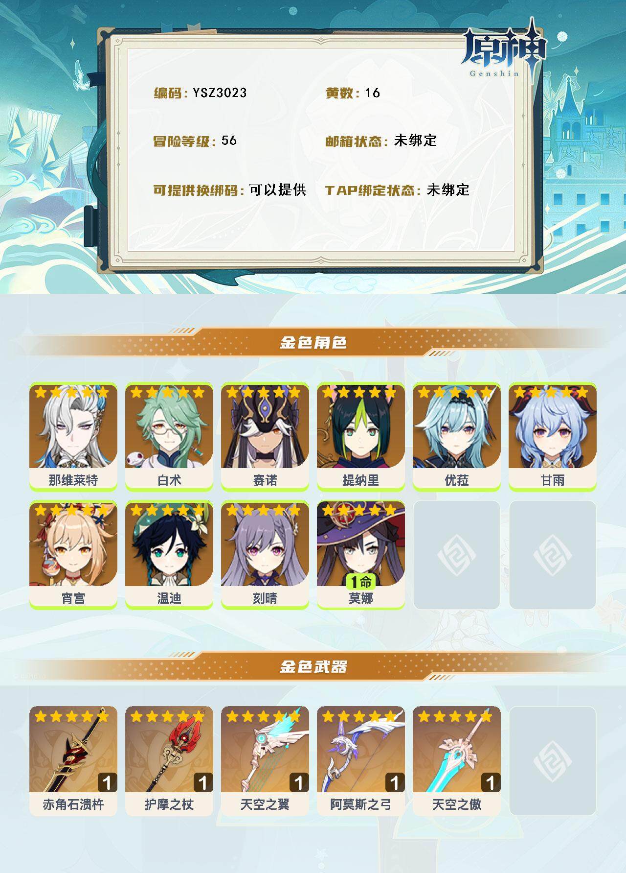 【ysz3023】56级/16黄/女主/10个五星角色/5个五星武器/0命赛诺/0命温迪/0命白术/0命优菈/0命甘雨/0命那维莱特/0命宵宫/1命莫娜/0命刻晴/0命提纳里/精1阿莫斯之弓/精1护摩之杖/精1赤角石溃杵/精1天空之翼/精1天空之傲