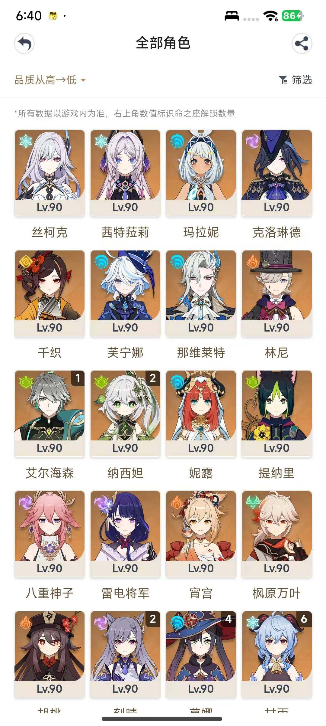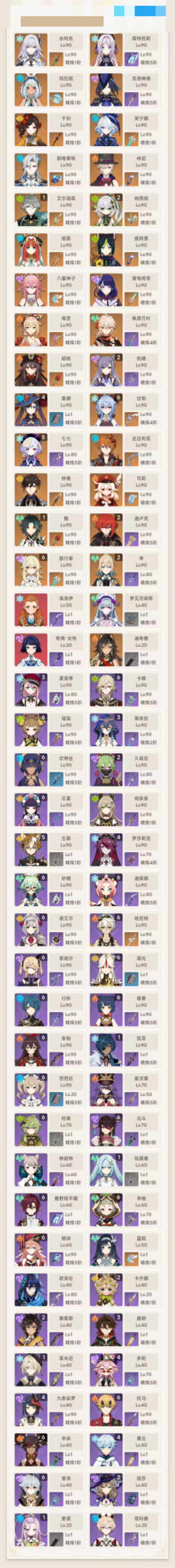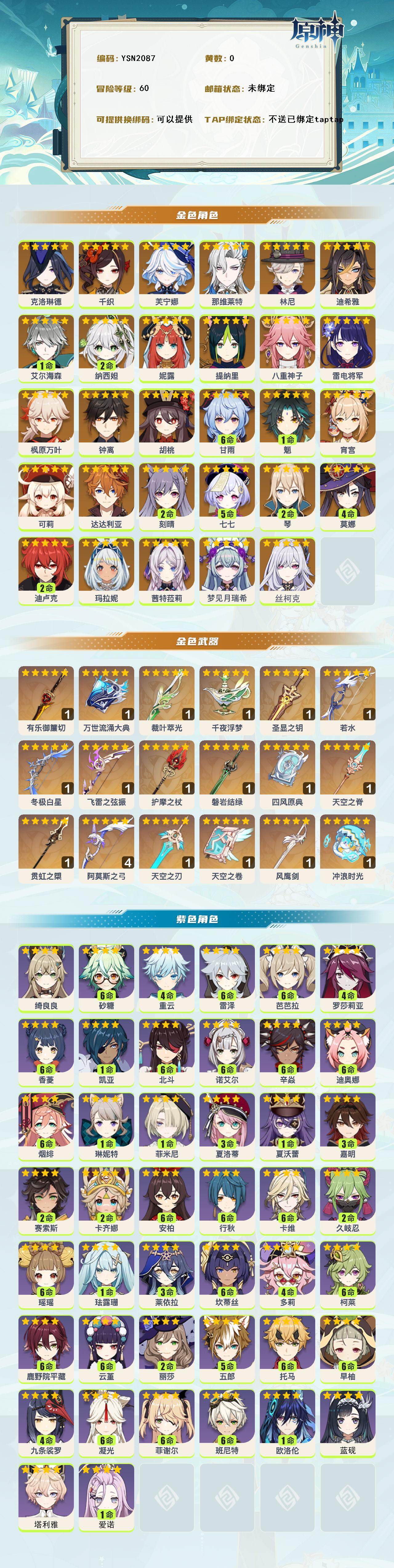 【ysn2087】60级/女主/32个五星角色/0命丝柯克/0命梦见月瑞希/0命茜特菈莉/0命玛拉妮/0命克洛琳德/0命千织/0命芙宁娜/0命那维莱特/0命林尼/0命迪希雅/1命艾尔海森/2命纳西妲/0命妮露/0命提纳里/0命八重神子/0命雷电将军/0命宵宫/0命枫原万叶/0命胡桃/1命魈/满命甘雨/0命钟离/0命达达利亚/0命可莉/2命琴/2命刻晴/2命迪卢克/4命莫娜/5命七七/精1冲浪时光/精1有乐御簾切/精1万世流涌大典/精1裁叶萃光/精1千夜浮梦/精1圣显之钥/精1若水/精1冬极白星/精1飞雷之弦振/精1护摩之杖/精1磐岩结绿/精1贯虹之槊/精1天空之卷/精1四风原典/精4阿莫斯之弓/精1风鹰剑/精1天空之脊/精1天空之刃/1命爱诺/0命塔利雅/0命蓝砚/0命欧洛伦/2命卡齐娜/2命赛索斯/3命嘉明/0命夏沃蕾/3命夏洛蒂/1命菲米尼/0命琳妮特/0命绮良良/满命卡维/满命瑶瑶/1命珐露珊/3命莱依拉/满命坎蒂丝/4命多莉/满命柯莱/满命鹿野院平藏/2命久岐忍/满命云堇/5命五郎/满命托马/4命九条裟罗/满命早柚/满命烟绯/4命罗莎莉亚/满命辛焱/满命迪奥娜/满命砂糖/满命雷泽/满命菲谢尔/2命丽莎/满命北斗/满命香菱/满命安柏/满命班尼特/满命行秋/满命芭芭拉/满命凝光/满命诺艾尔/1命凯亚/4命重云