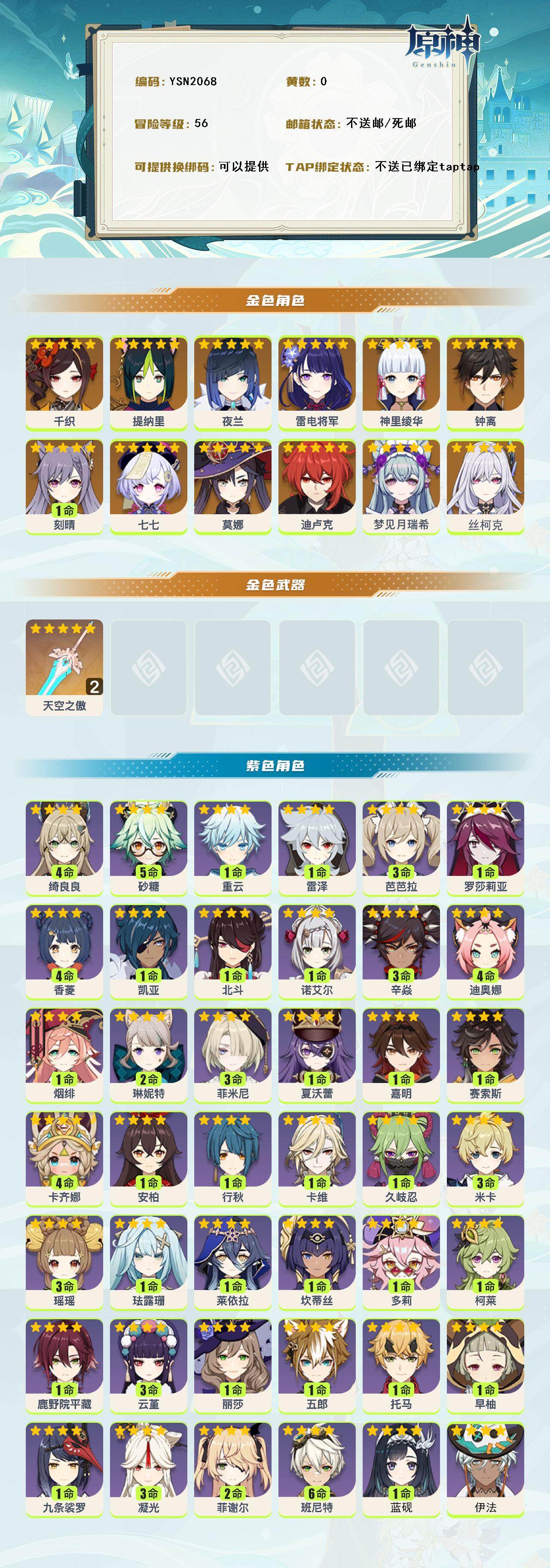 【ysn2068】56级/女主/14个五星角色/0命丝柯克/0命梦见月瑞希/0命千织/0命提纳里/0命夜兰/0命雷电将军/0命神里绫华/0命钟离/1命刻晴/0命迪卢克/0命莫娜/0命七七/精2天空之傲/0命伊法/1命蓝砚/4命卡齐娜/0命赛索斯/0命嘉明/0命夏沃蕾/3命菲米尼/2命琳妮特/4命绮良良/0命卡维/3命米卡/3命瑶瑶/0命珐露珊/0命莱依拉/0命坎蒂丝/0命多莉/0命柯莱/1命鹿野院平藏/0命久岐忍/3命云堇/1命五郎/1命托马/1命九条裟罗/0命早柚/0命烟绯/0命罗莎莉亚/3命辛焱/4命迪奥娜/5命砂糖/0命雷泽/2命菲谢尔/1命丽莎/0命北斗/4命香菱/1命安柏/满命班尼特/0命行秋/3命芭芭拉/3命凝光/1命诺艾尔/0命凯亚/1命重云