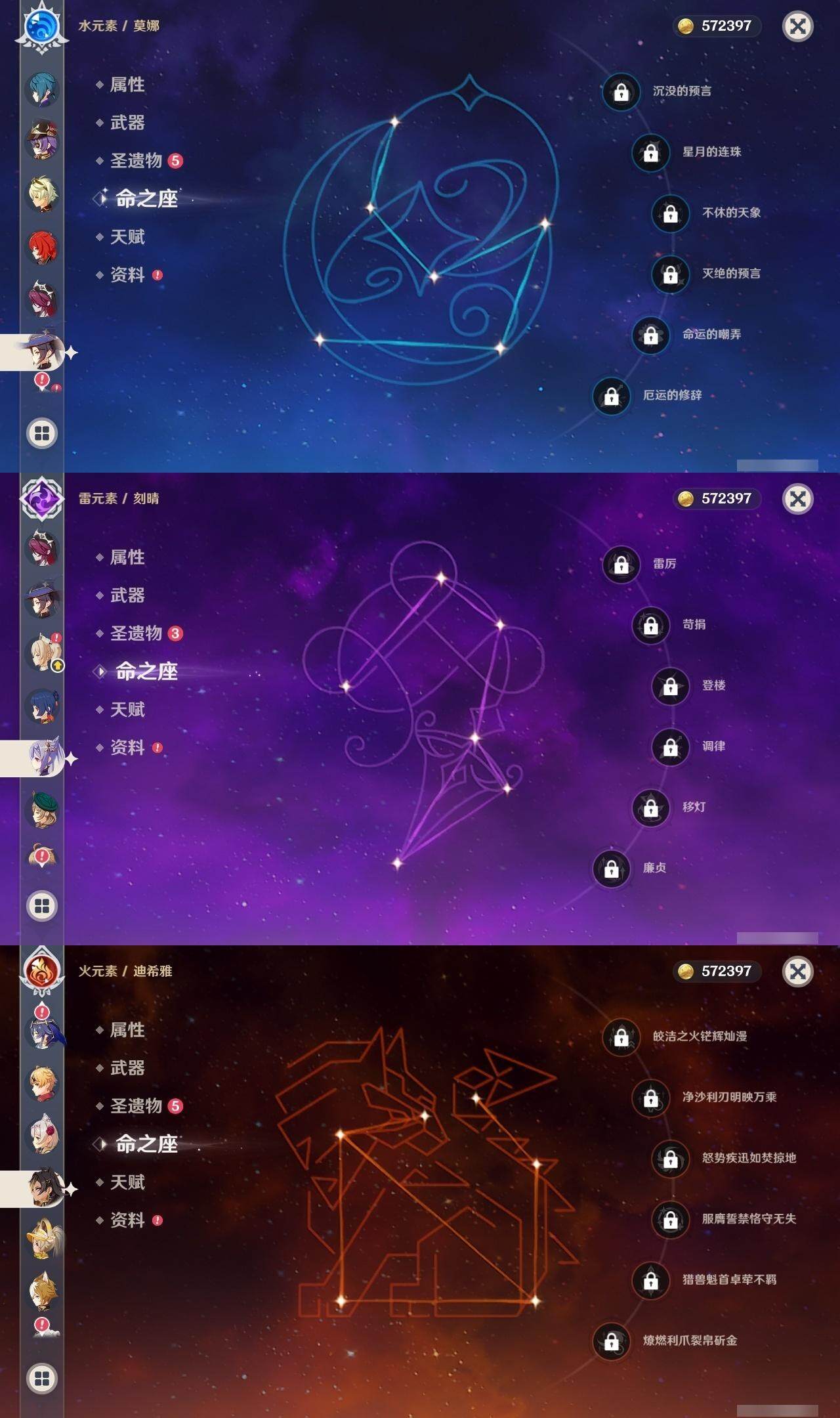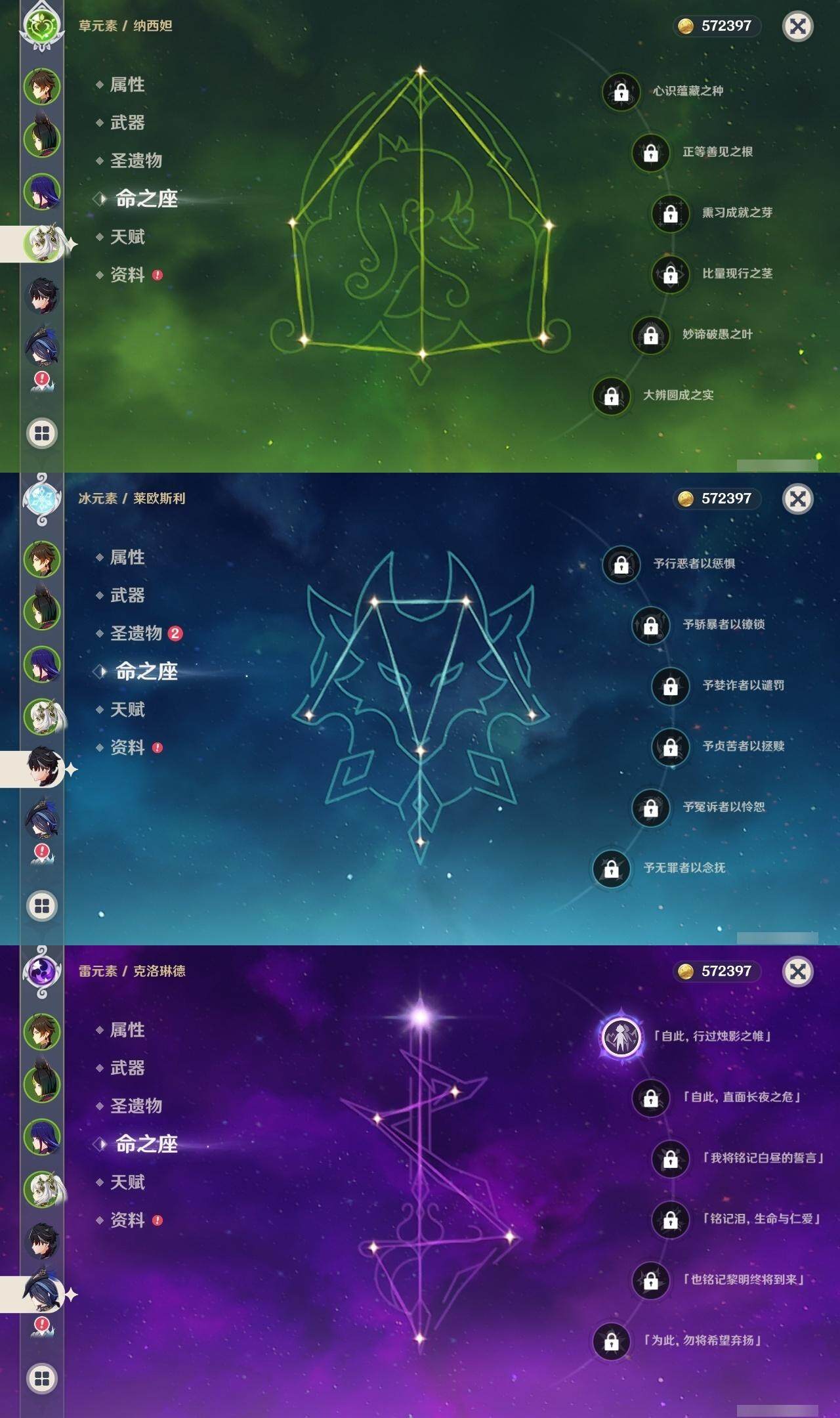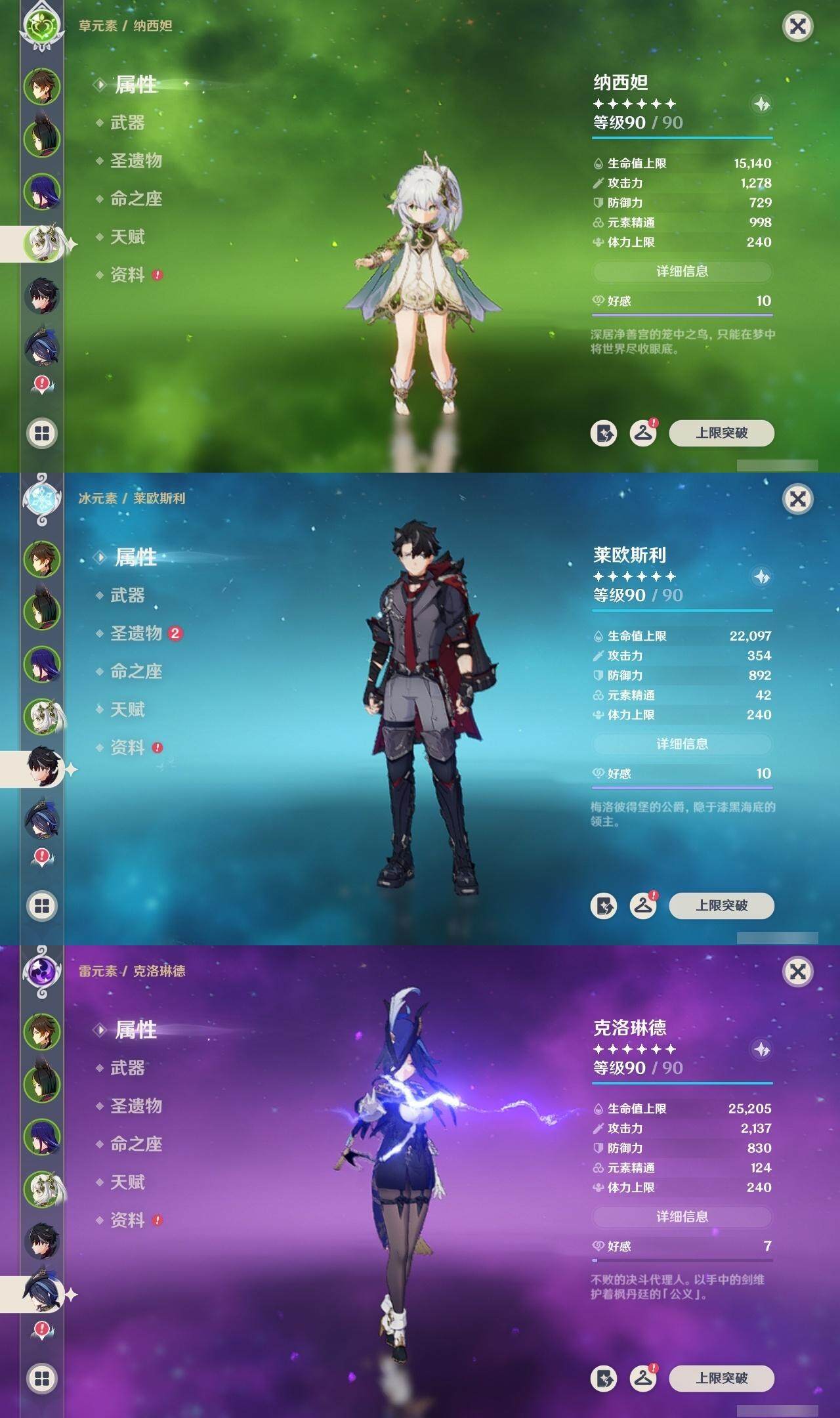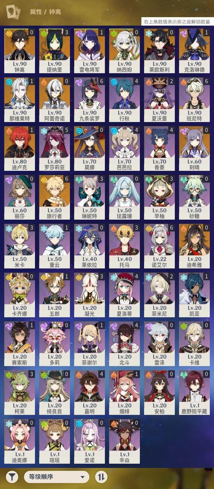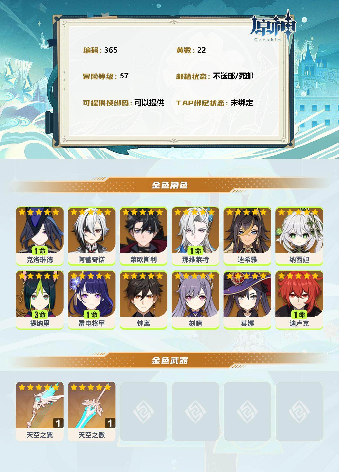57级/22黄/男主/12个五星角色/3个五星武器 1命克洛琳德0命阿蕾奇诺0命莱欧斯利1命那维莱特0命迪希雅0命纳西妲3命提纳里1命雷电将军0命钟离0命刻晴0命莫娜1命迪卢克精1天空之翼精1天空之傲