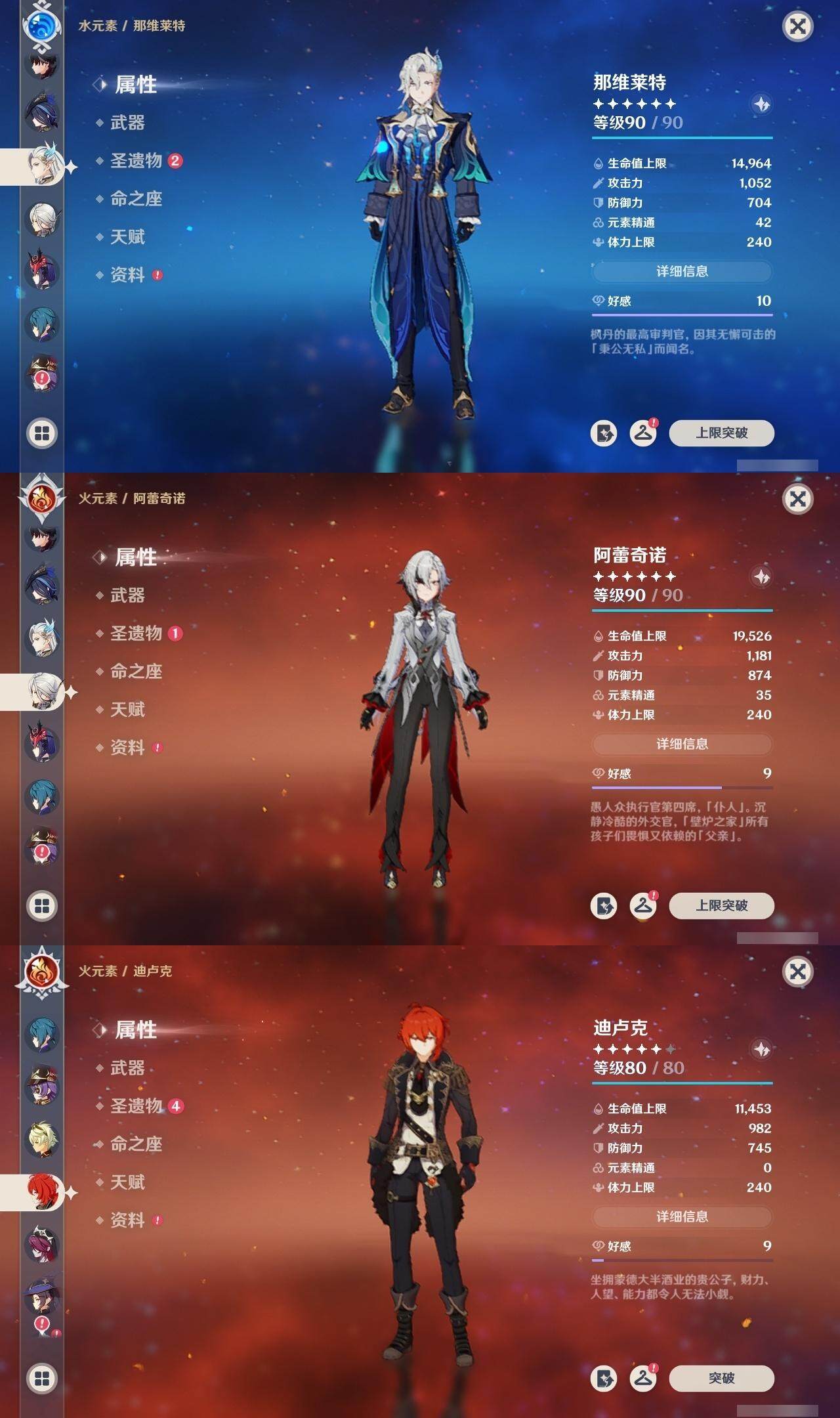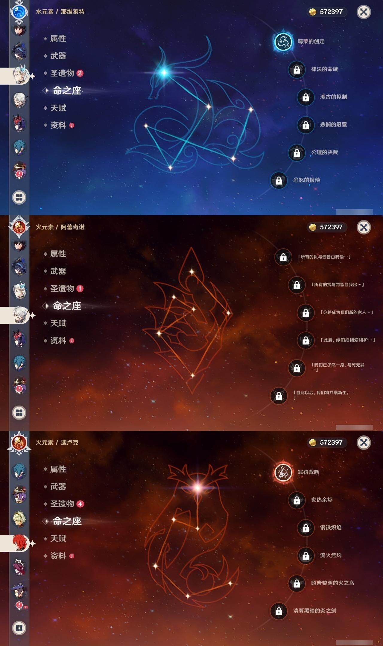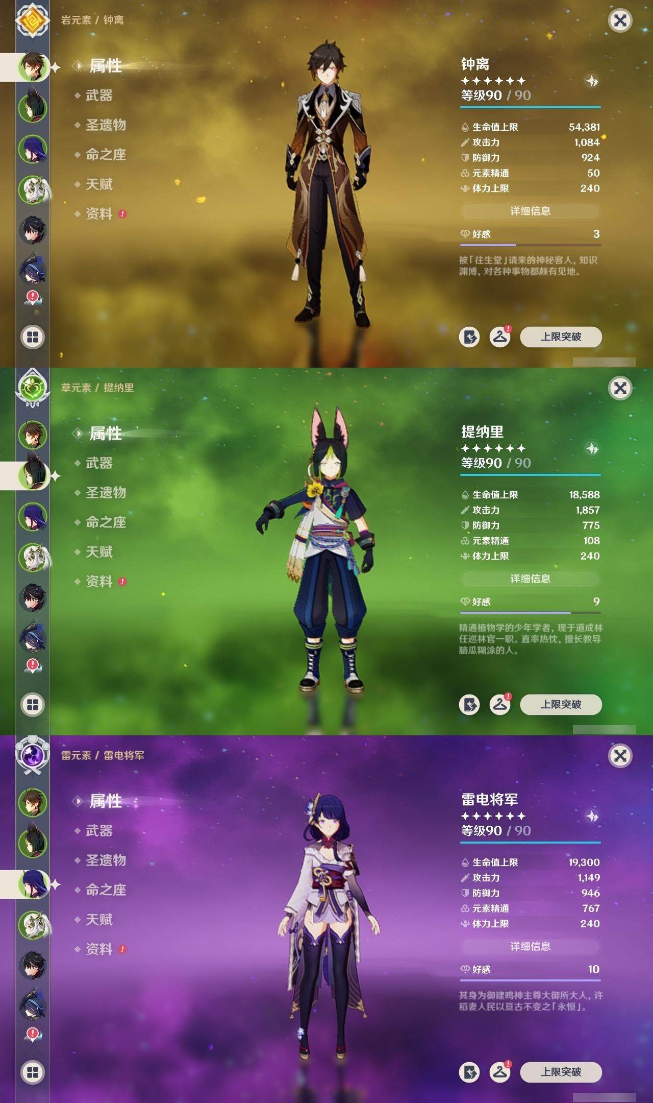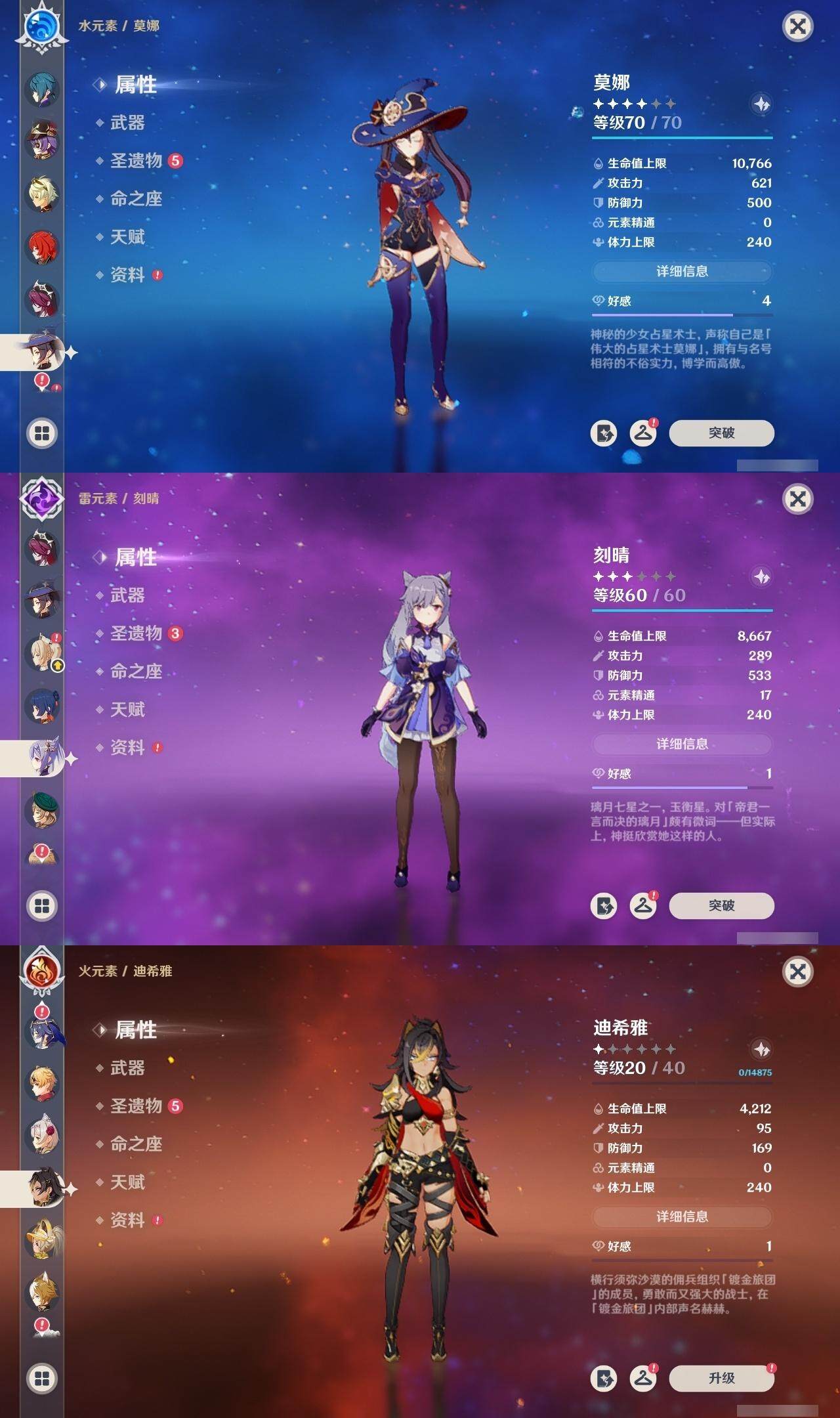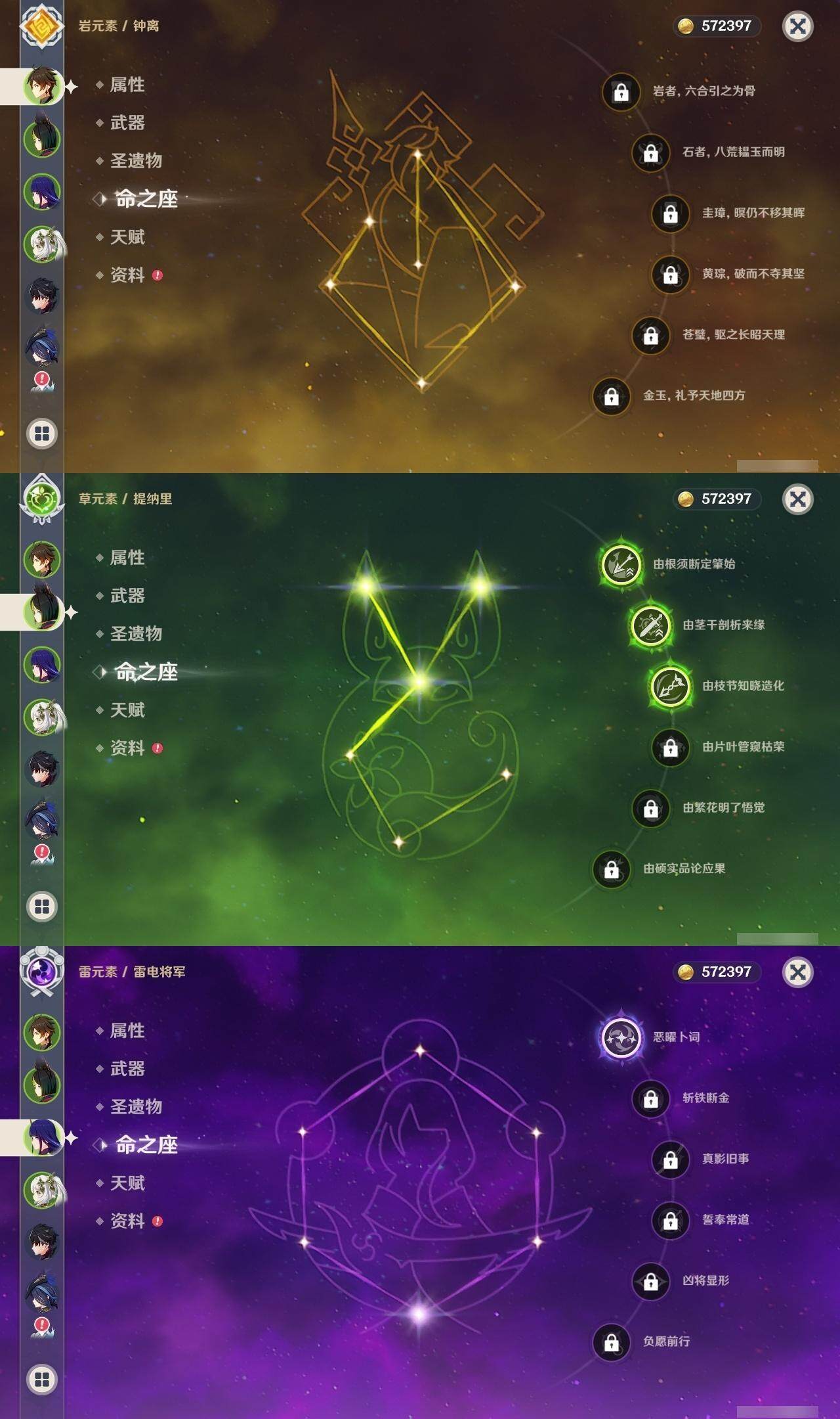 57级/22黄/男主/12个五星角色/3个五星武器 1命克洛琳德0命阿蕾奇诺0命莱欧斯利1命那维莱特0命迪希雅0命纳西妲3命提纳里1命雷电将军0命钟离0命刻晴0命莫娜1命迪卢克精1天空之翼精1天空之傲