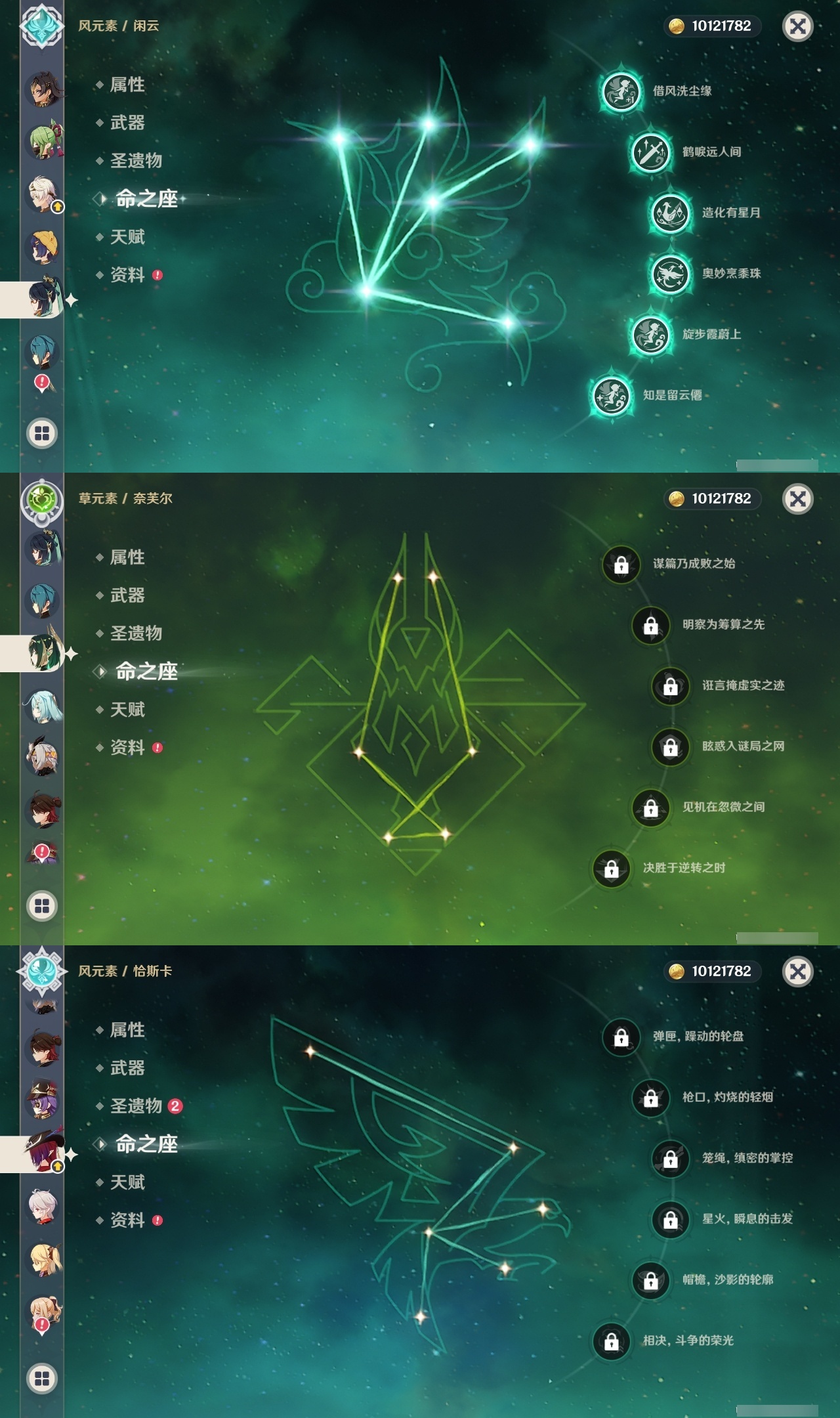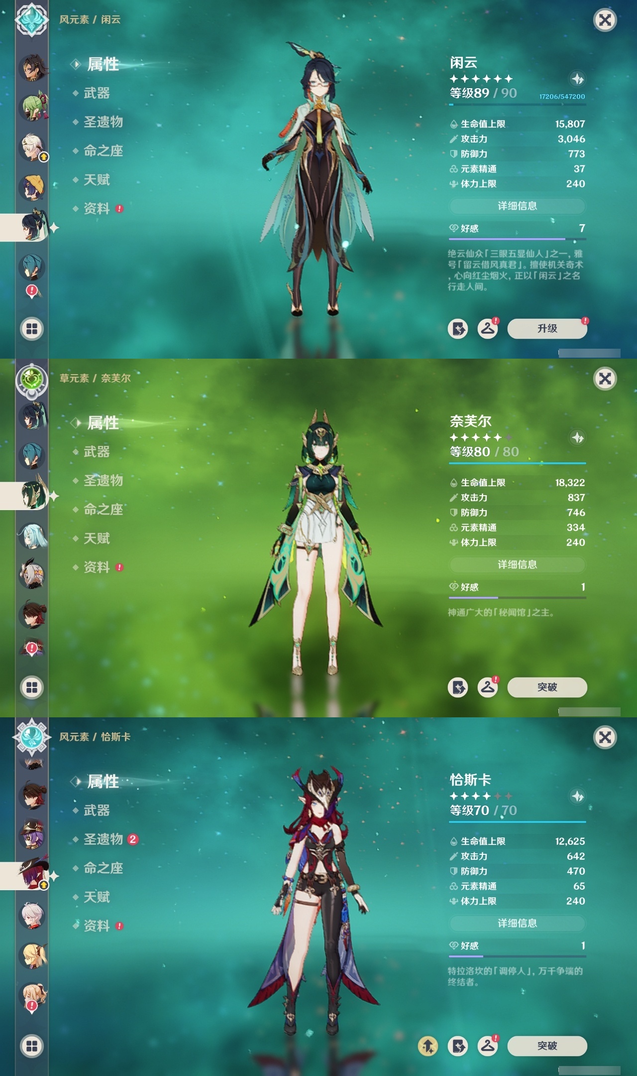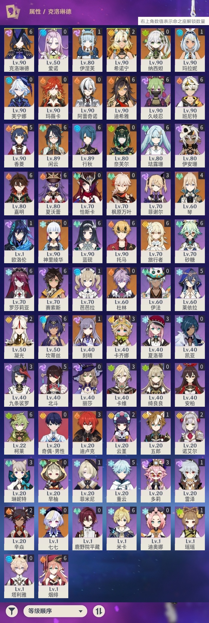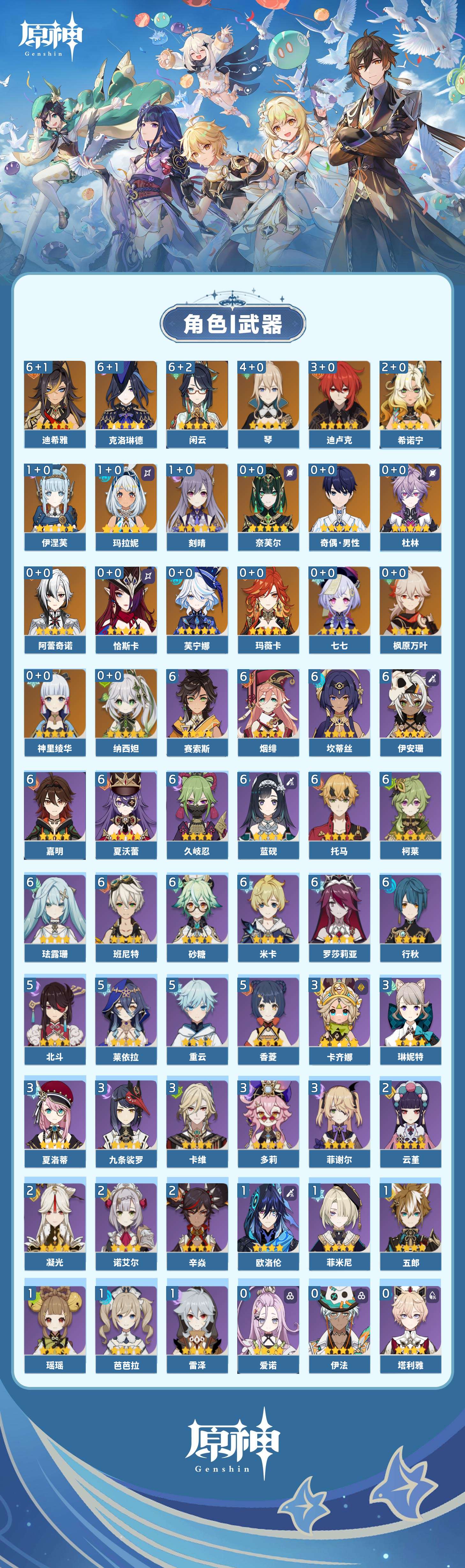【原神】满命,冒险等级:60,五星数量:27,五星角色:迪希雅 6命闲云 6命克洛琳德 6命琴 4命迪卢克 3命希诺宁 2命玛拉妮 1命伊涅芙 1命刻晴 1命七七神里绫华恰斯卡玛薇卡芙宁娜阿蕾奇诺纳西妲奈芙尔杜林枫原万叶__五星武器:鹤鸣余音 2精苇海信标溢彩心念风鹰剑天空之傲天空之刃赦罪__四星角色:班尼特 6命行秋 6命久岐忍 6命珐露珊 6命砂糖 6命米卡 6命坎蒂丝 6命柯莱 6命蓝砚 6命托马 6命烟绯 6命罗莎莉亚 6命夏沃蕾 6命嘉明 6命伊安珊 6命赛索斯 6命香菱 5命莱依拉 5命重云 5命北斗 5命卡齐娜 3命九条裟罗 3命多莉 3命卡维 3命菲谢尔 3命琳妮特 3命夏洛蒂 3命凝光 2命云堇 2命辛焱 2命诺艾尔 2命瑶瑶 1命欧洛伦 1命芭芭拉 1命五郎 1命雷泽 1命菲米尼 1命奇偶·男性鹿野院平藏迪奥娜绮良良早柚伊法塔利雅爱诺