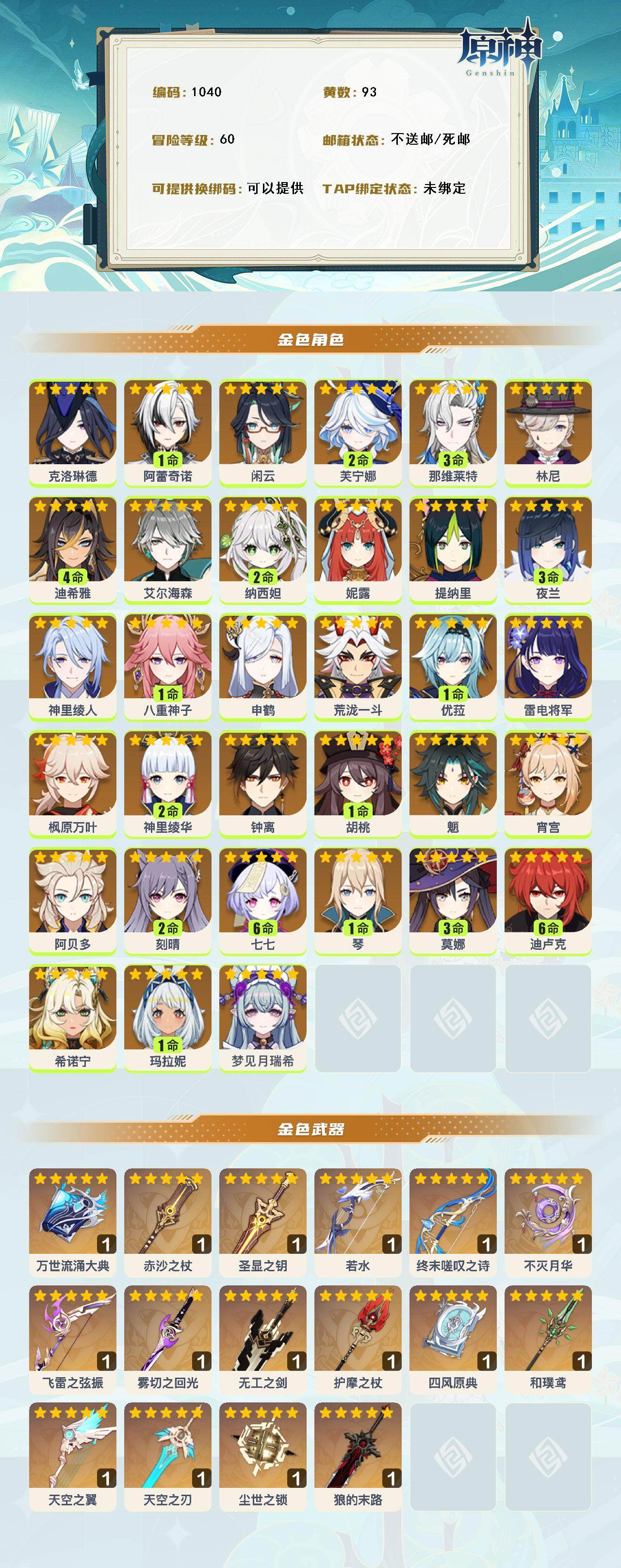 [14614046]60级/93黄/女主/33个五星角色/21个五星武器 0命克洛琳德1命阿蕾奇诺0命闲云2命芙宁娜3命那维莱特0命林尼4命迪希雅0命艾尔海森2命纳西妲0命妮露0命提纳里3命夜兰0命神里绫人1命八重神子0命申鹤0命荒泷一斗1命优菈0命雷电将军0命枫原万叶2命神里绫华0命钟离1命胡桃0命魈0命宵宫0命阿贝多2命刻晴满命七七1命琴3命莫娜满命迪卢克0命希诺宁1命玛拉妮0命梦见月瑞希精1万世流涌大典精1赤沙之杖精1圣显之钥精1若水精1终末嗟叹之诗精1不灭月华精1飞雷之弦振精1雾切之回光精1无工之剑精1护摩之杖精1四风原典精1和璞鸢精1天空之翼精1天空之刃精1尘世之锁精1狼的末路