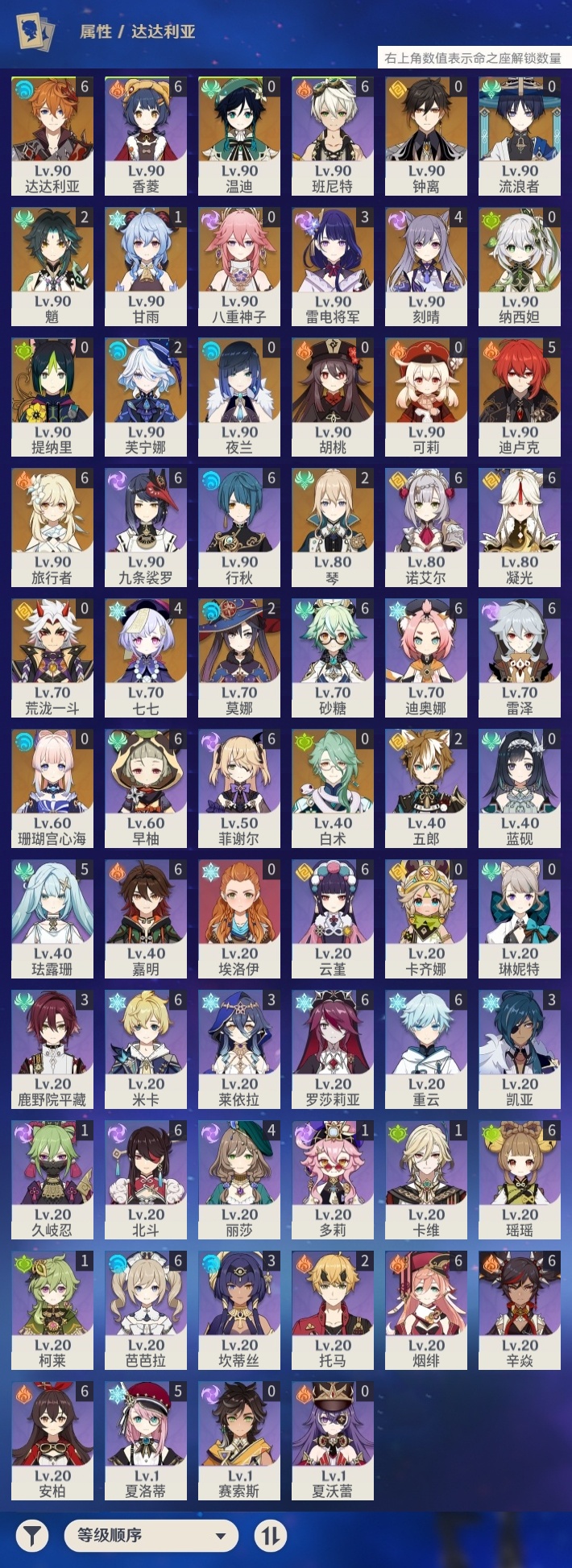 【原神】【lyys9258】冒险等级:60,五星数量:41,五星角色:达达利亚 6命迪卢克 5命刻晴 4命七七 4命雷电将军 3命芙宁娜 2命魈 2命莫娜 2命琴 2命甘雨 1命珊瑚宫心海白术温迪钟离荒泷一斗八重神子夜兰提纳里纳西妲流浪者胡桃可莉__五星武器:冬极白星 5精和璞鸢 4精无工之剑 3精苇海信标静水流涌之辉裁叶萃光阿莫斯之弓护摩之杖狼的末路磐岩结绿四风原典天空之卷天空之翼薙草之稻光终末嗟叹之诗赤角石溃杵息灾千夜浮梦__四星角色:班尼特 6命行秋 6命九条裟罗 6命香菱 6命凝光 6命迪奥娜 6命砂糖 6命瑶瑶 6命米卡 6命芭芭拉 6命云堇 6命早柚 6命烟绯 6命重云 6命辛焱 6命诺艾尔 6命罗莎莉亚 6命雷泽 6命菲谢尔 6命北斗 6命嘉明 6命珐露珊 5命夏洛蒂 5命鹿野院平藏 3命莱依拉 3命坎蒂丝 3命托马 2命五郎 2命久岐忍 1命多莉 1命柯莱 1命卡维 1命埃洛伊卡齐娜蓝砚琳妮特夏沃蕾赛索斯