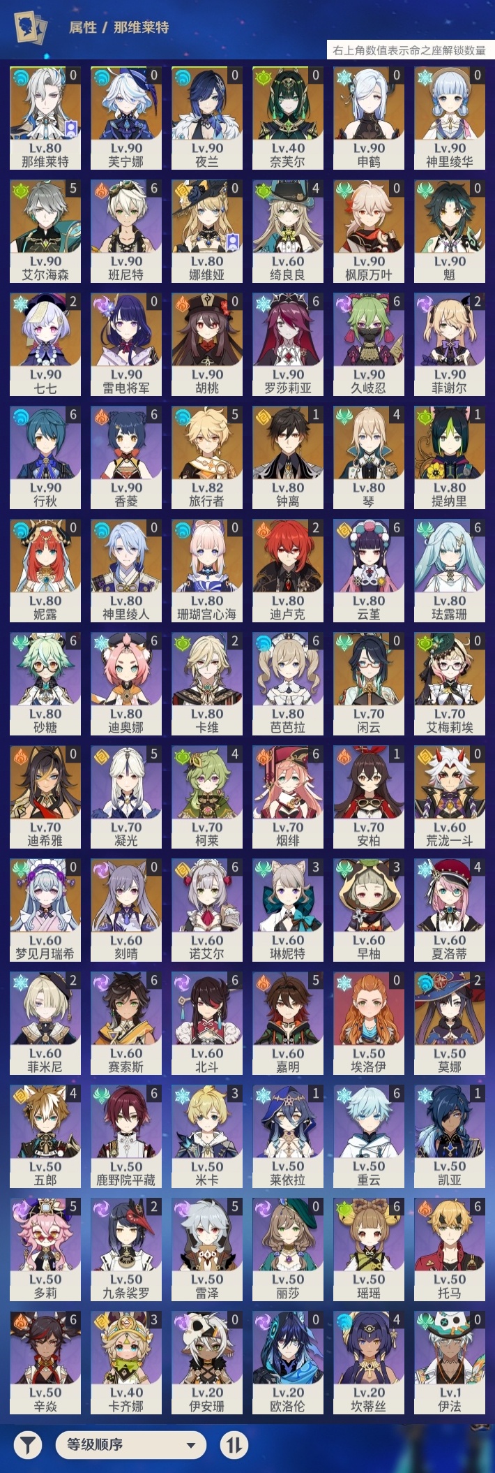 【原神】【lyys9262】冒险等级:60,五星数量:42,五星角色:艾尔海森 5命琴 4命迪卢克 2命莫娜 2命七七 2命钟离 1命提纳里 1命艾梅莉埃珊瑚宫心海神里绫华迪希雅荒泷一斗梦见月瑞希申鹤神里绫人那维莱特夜兰芙宁娜娜维娅闲云妮露奈芙尔枫原万叶魈胡桃刻晴雷电将军__五星武器:天空之翼 2精裁叶萃光 2精黑蚀不灭月华和璞鸢四风原典天空之脊天空之卷天空之刃雾切之回光终末嗟叹之诗息灾若水圣显之钥__四星角色:班尼特 6命行秋 6命香菱 6命久岐忍 6命鹿野院平藏 6命珐露珊 6命迪奥娜 6命砂糖 6命瑶瑶 6命芭芭拉 6命云堇 6命托马 6命烟绯 6命重云 6命辛焱 6命诺艾尔 6命罗莎莉亚 6命北斗 6命赛索斯 6命凝光 5命多莉 5命雷泽 5命嘉明 5命绮良良 4命坎蒂丝 4命柯莱 4命五郎 4命夏洛蒂 4命卡齐娜 3命米卡 3命早柚 3命琳妮特 3命九条裟罗 2命卡维 2命菲谢尔 2命菲米尼 2命莱依拉 1命埃洛伊欧洛伦伊法伊安珊