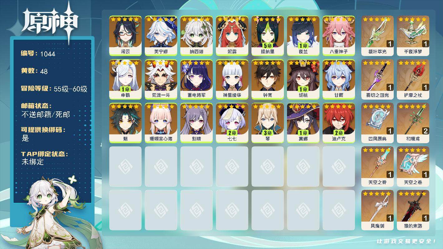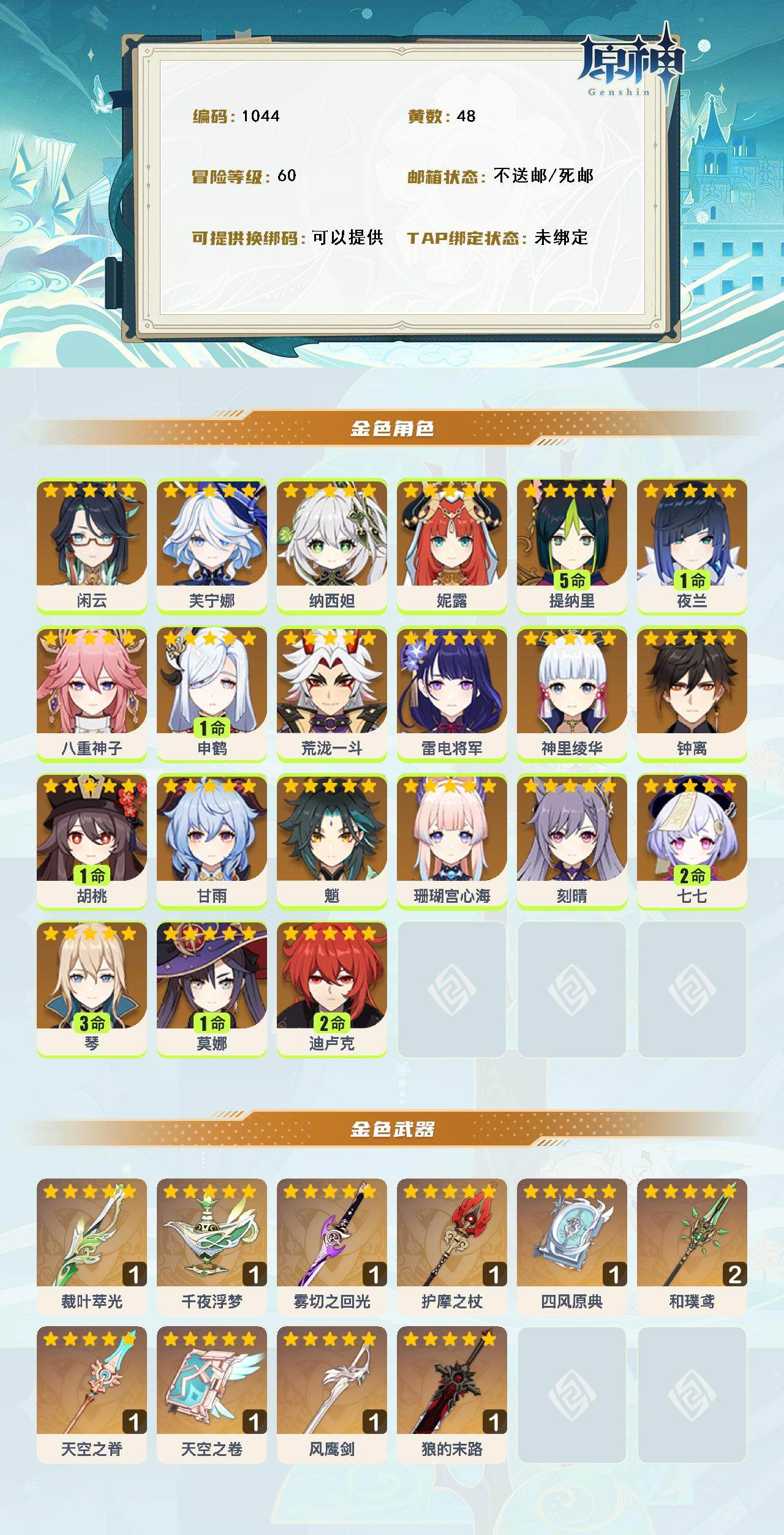 [14614243]60级/48黄/女主/21个五星角色/10个五星武器 0命闲云0命芙宁娜0命纳西妲0命妮露5命提纳里1命夜兰0命八重神子1命申鹤0命荒泷一斗0命雷电将军0命神里绫华0命钟离1命胡桃0命甘雨0命魈0命珊瑚宫心海0命刻晴2命七七3命琴1命莫娜2命迪卢克精1裁叶萃光精1千夜浮梦精1雾切之回光精1护摩之杖精1四风原典精2和璞鸢精1天空之脊精1天空之卷精1风鹰剑精1狼的末路