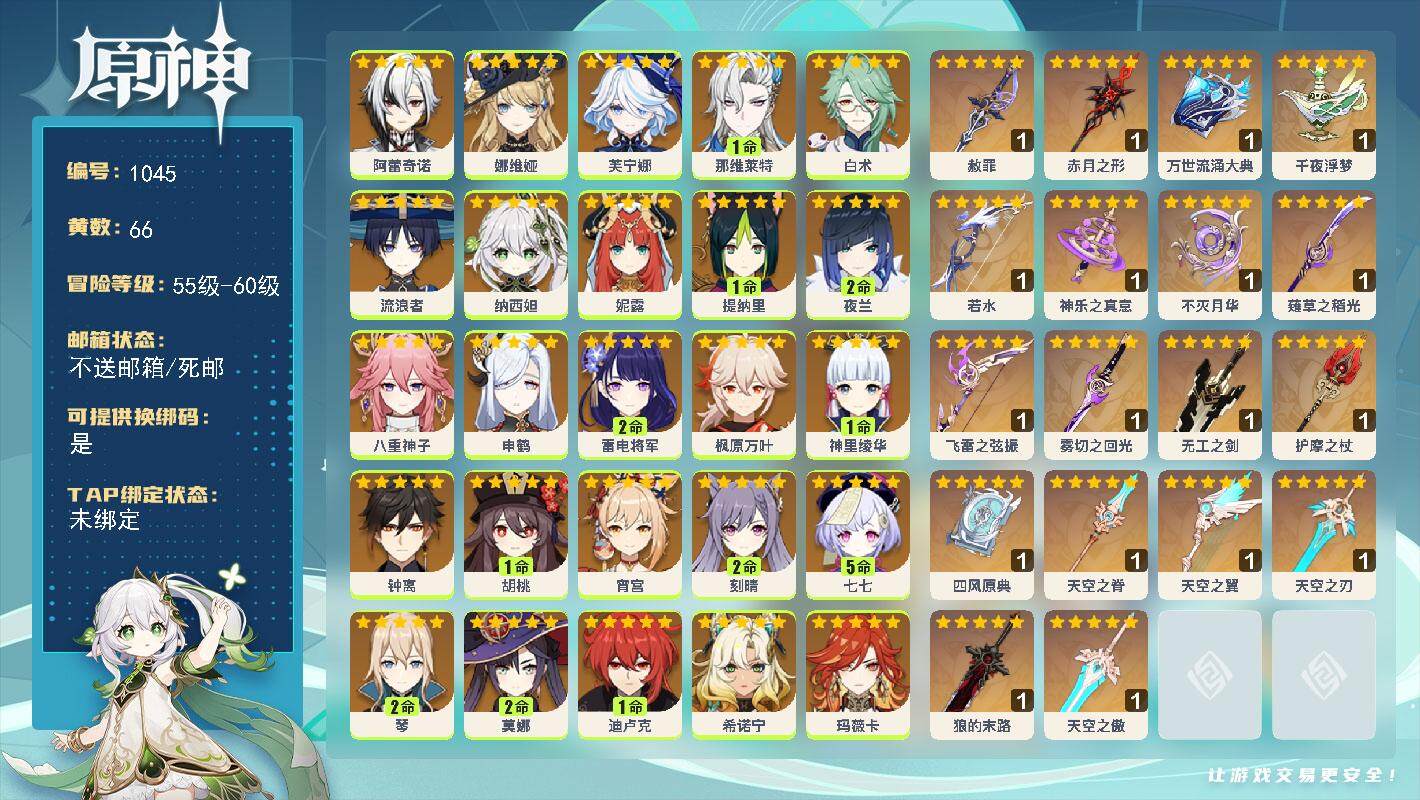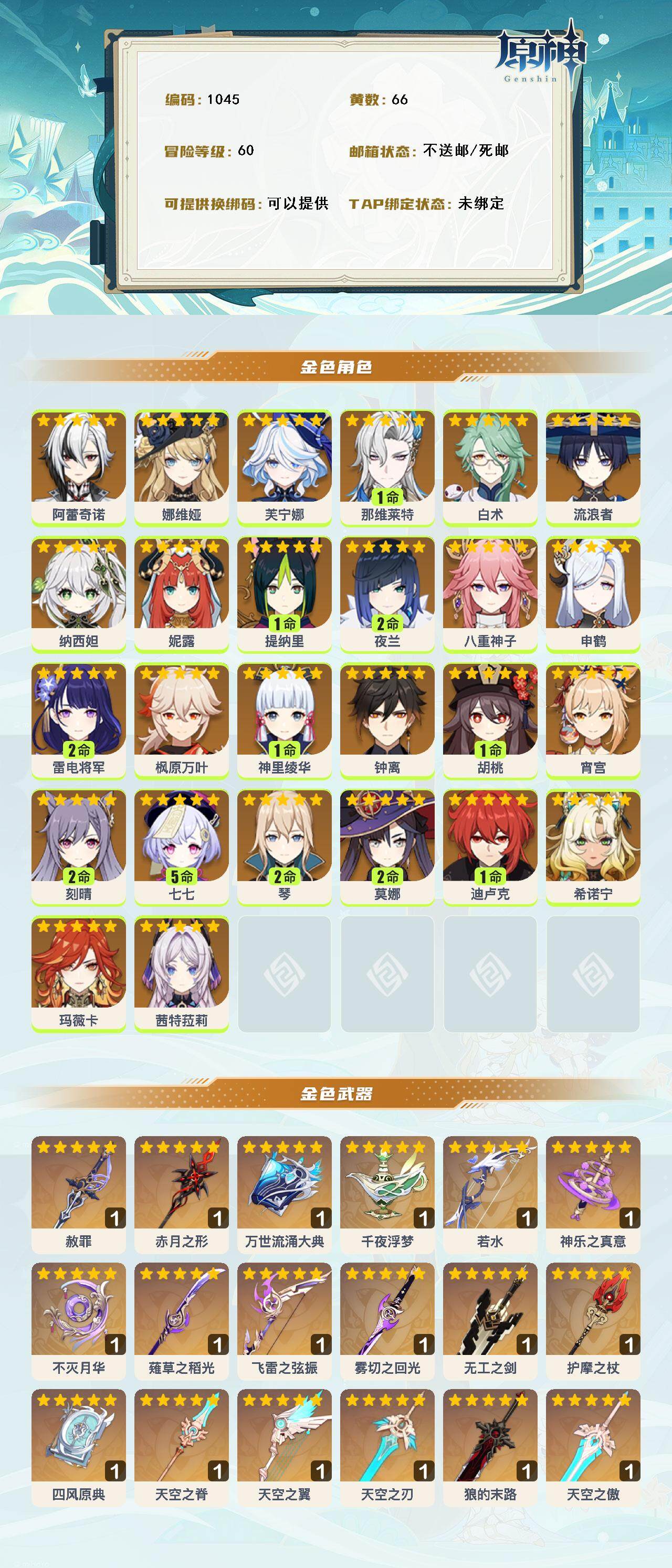[14614321]60级/66黄/女主/26个五星角色/20个五星武器 0命阿蕾奇诺0命娜维娅0命芙宁娜1命那维莱特0命白术0命流浪者0命纳西妲0命妮露1命提纳里2命夜兰0命八重神子0命申鹤2命雷电将军0命枫原万叶1命神里绫华0命钟离1命胡桃0命宵宫2命刻晴5命七七2命琴2命莫娜1命迪卢克0命希诺宁0命玛薇卡0命茜特菈莉精1赦罪精1赤月之形精1万世流涌大典精1千夜浮梦精1若水精1神乐之真意精1不灭月华精1薙草之稻光精1飞雷之弦振精1雾切之回光精1无工之剑精1护摩之杖精1四风原典精1天空之脊精1天空之翼精1天空之刃精1狼的末路精1天空之傲