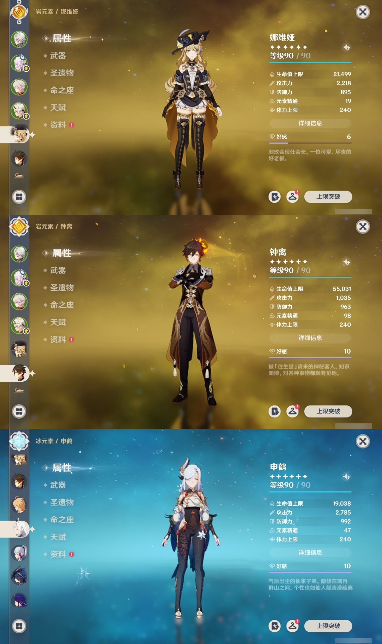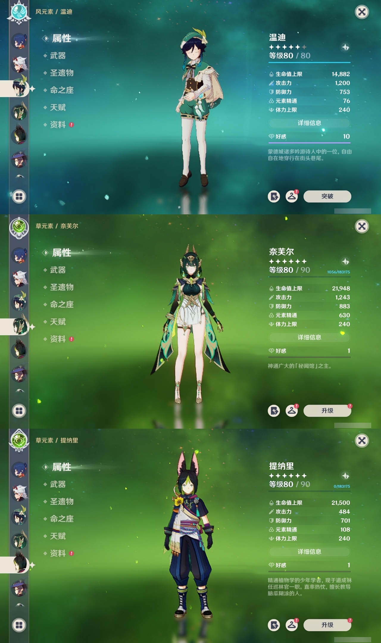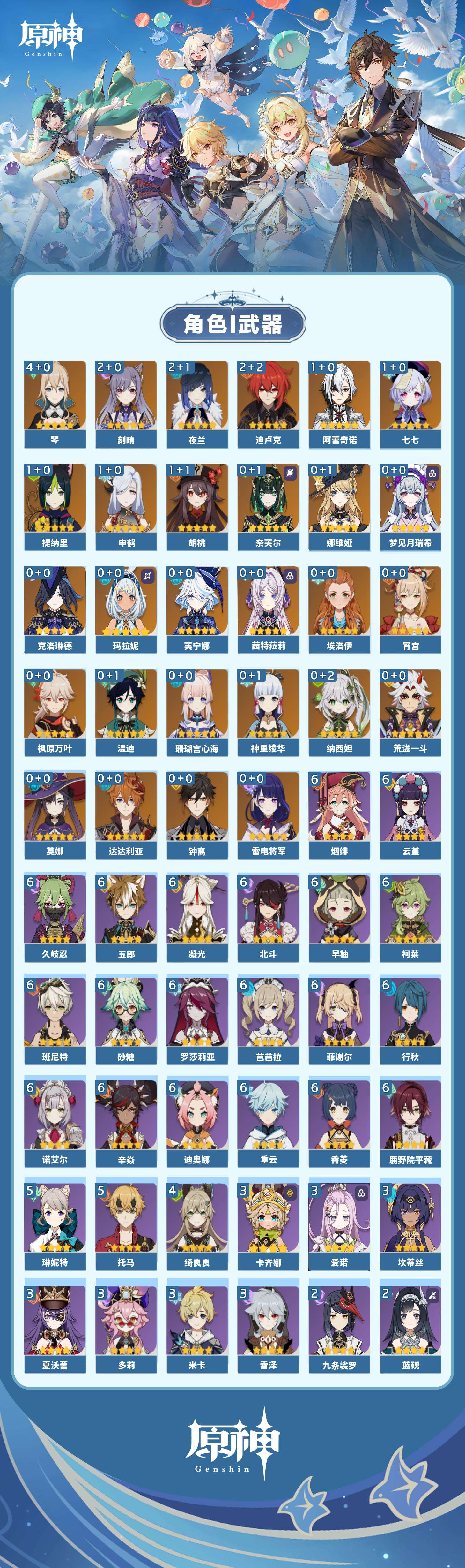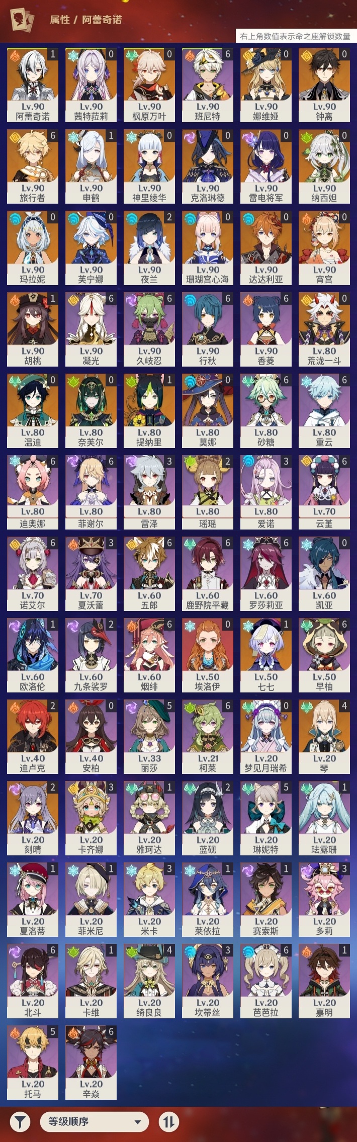 【原神】【lyys9267】冒险等级:60,五星数量:41,五星角色:琴 4命迪卢克 2命刻晴 2命夜兰 2命阿蕾奇诺 1命胡桃 1命七七 1命申鹤 1命提纳里 1命莫娜玛拉妮珊瑚宫心海神里绫华温迪茜特菈莉宵宫钟离荒泷一斗达达利亚梦见月瑞希芙宁娜娜维娅纳西妲奈芙尔枫原万叶克洛琳德雷电将军__五星武器:狼的末路 2精天空之卷 2精千夜浮梦 2精裁断真语秘匣护摩之杖四风原典天空之脊天空之刃无工之剑雾切之回光终末嗟叹之诗若水__四星角色:班尼特 6命行秋 6命香菱 6命久岐忍 6命鹿野院平藏 6命凝光 6命迪奥娜 6命砂糖 6命柯莱 6命芭芭拉 6命云堇 6命早柚 6命五郎 6命烟绯 6命重云 6命辛焱 6命诺艾尔 6命罗莎莉亚 6命菲谢尔 6命北斗 6命托马 5命琳妮特 5命绮良良 4命卡齐娜 3命米卡 3命坎蒂丝 3命多莉 3命雷泽 3命夏沃蕾 3命爱诺 3命九条裟罗 2命瑶瑶 2命蓝砚 2命珐露珊 1命莱依拉 1命卡维 1命欧洛伦 1命菲米尼 1命夏洛蒂 1命嘉明 1命赛索斯 1命埃洛伊