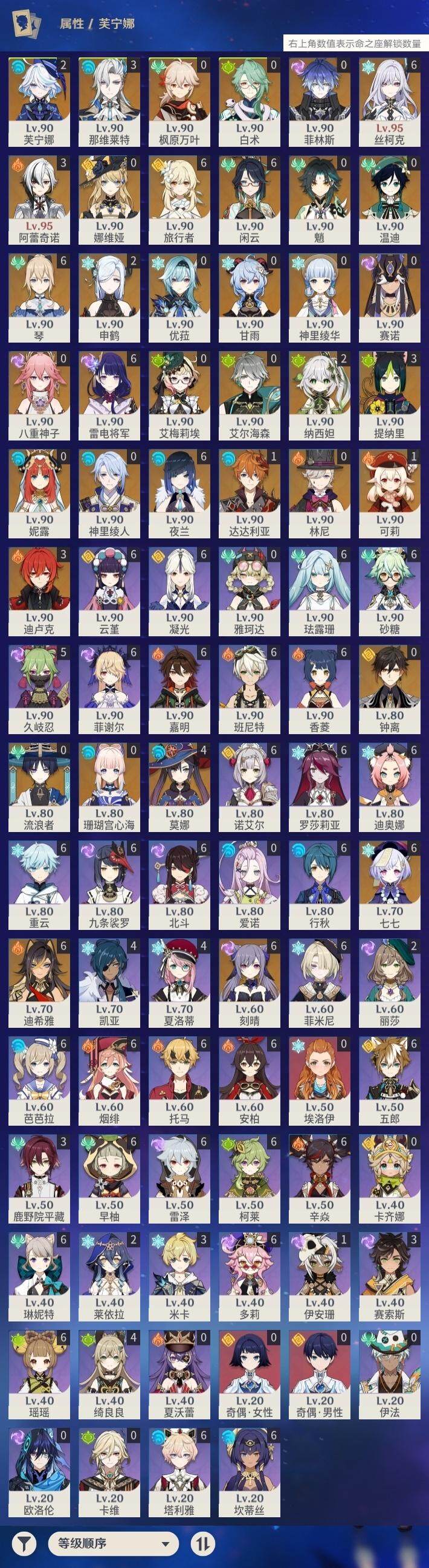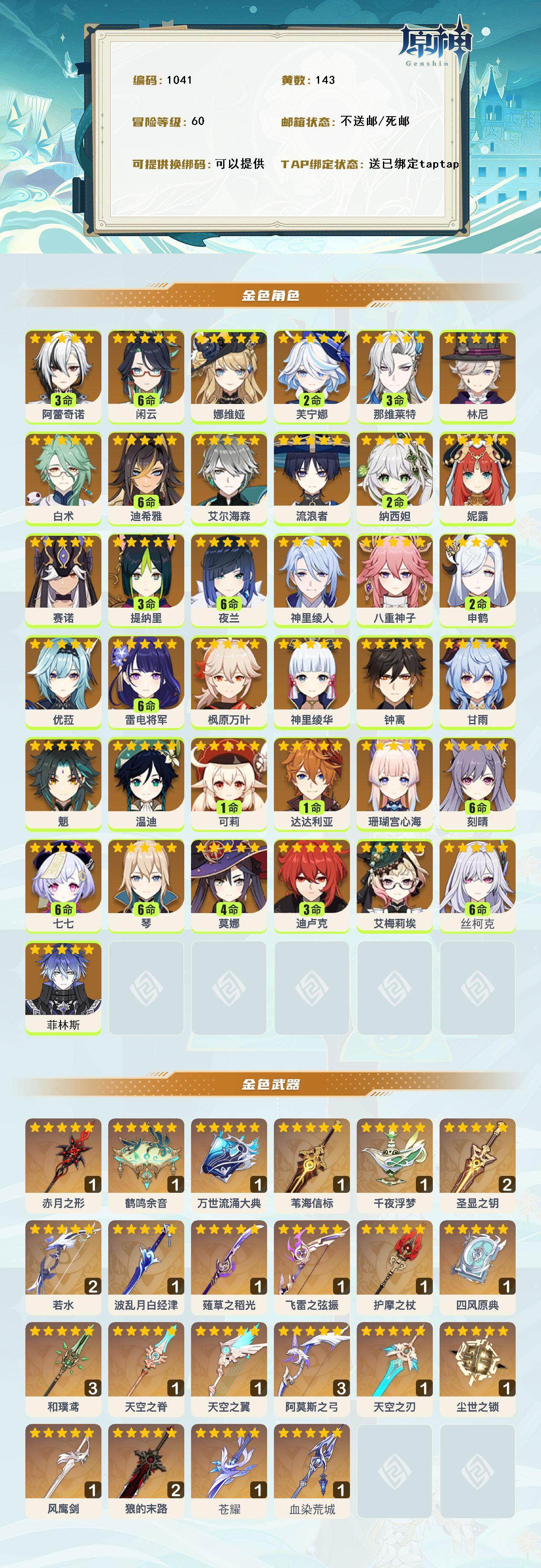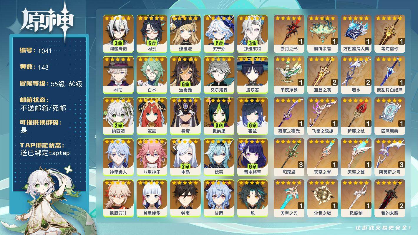 [14614462]60级/143黄/女主/37个五星角色/27个五星武器 3命阿蕾奇诺满命闲云0命娜维娅2命芙宁娜3命那维莱特0命林尼0命白术满命迪希雅0命艾尔海森0命流浪者2命纳西妲0命妮露0命赛诺3命提纳里满命夜兰0命神里绫人0命八重神子2命申鹤0命优菈满命雷电将军0命枫原万叶0命神里绫华0命钟离0命甘雨0命魈0命温迪1命可莉1命达达利亚0命珊瑚宫心海满命刻晴满命七七满命琴4命莫娜3命迪卢克0命艾梅莉埃满命丝柯克0命菲林斯精1赤月之形精1鹤鸣余音精1万世流涌大典精1苇海信标精1千夜浮梦精2圣显之钥精2若水精1波乱月白经津精1薙草之稻光精1飞雷之弦振精1护摩之杖精1四风原典精3和璞鸢精1天空之脊精1天空之翼精3阿莫斯之弓精1天空之刃精1尘世之锁精1风鹰剑精2狼的末路精1苍耀精1血染荒城